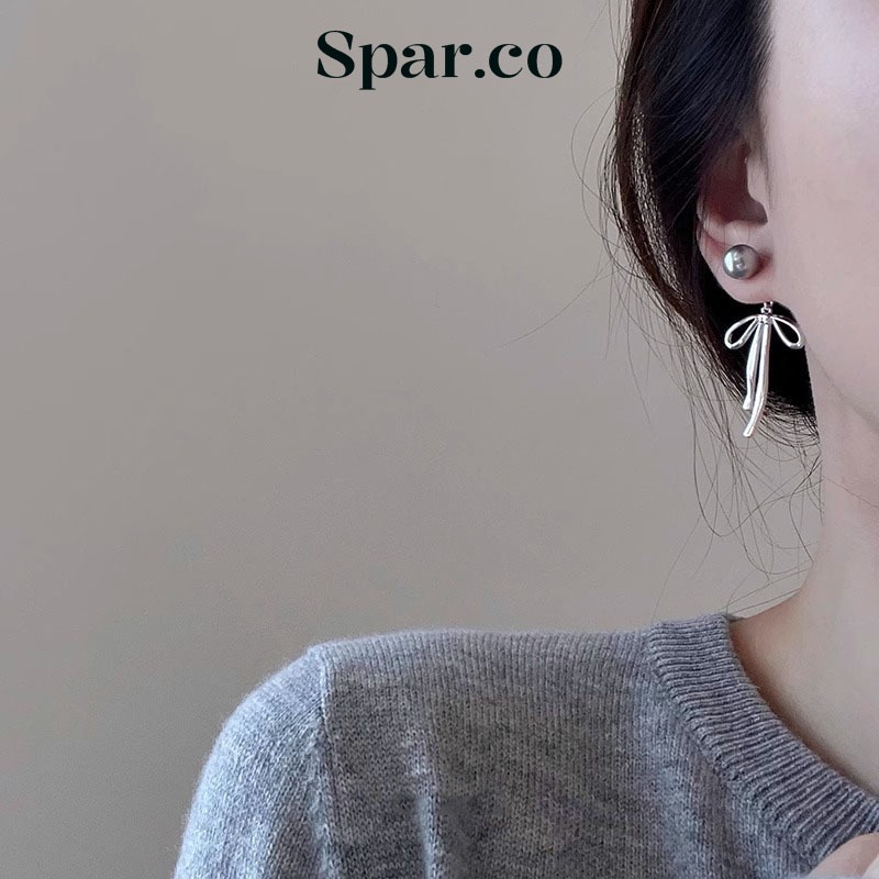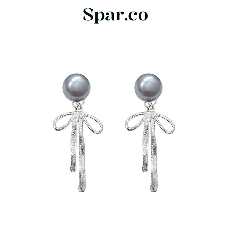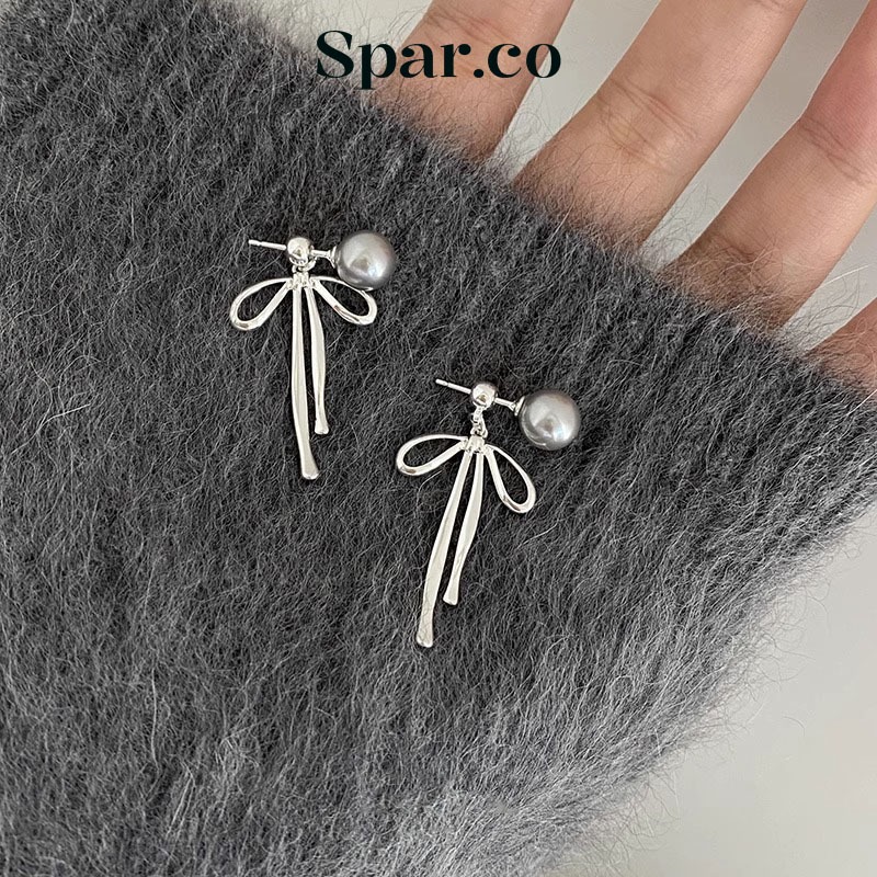 spar.co ต่างหูมุกสีเทายาวผูกโบว์ที่ผสมผสานความรู้สึกเย็นของไข่มุกสีเทากับการออกแบบโบว์ที่สง่างามเพื่อสร้างต่างหูที่มีความรู้สึกของพู่ยาวซึ่งไม่เพียง แต่เน้นอารมณ์ แต่ยังเป็นศูนย์รวมที่สมบูรณ์แบบของเสน่ห์ของผู้หญิง