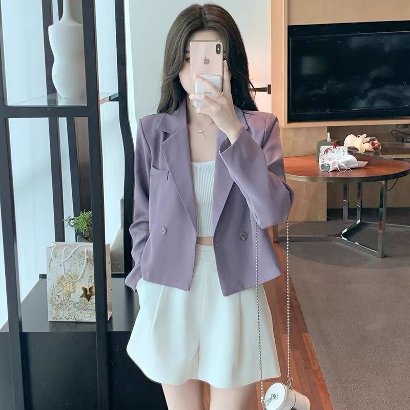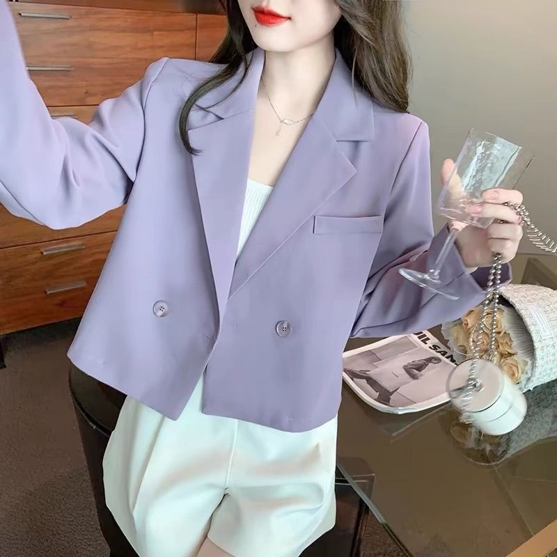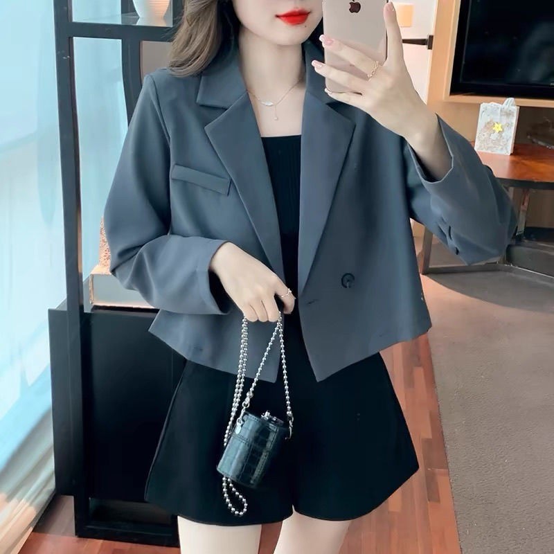 เสื้อเบลเซอร์สั้นฝรั่งเศสของผู้หญิงฤดูใบไม้ผลิฤดูใบไม้ร่วงมินิมอล การสื่อสาร เสื้อสูทแขนยาวสีทึบ