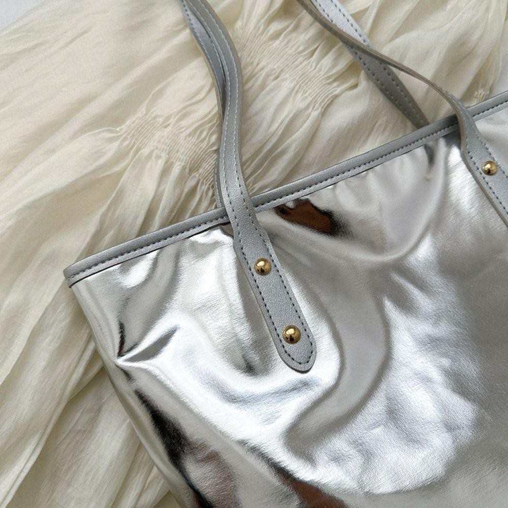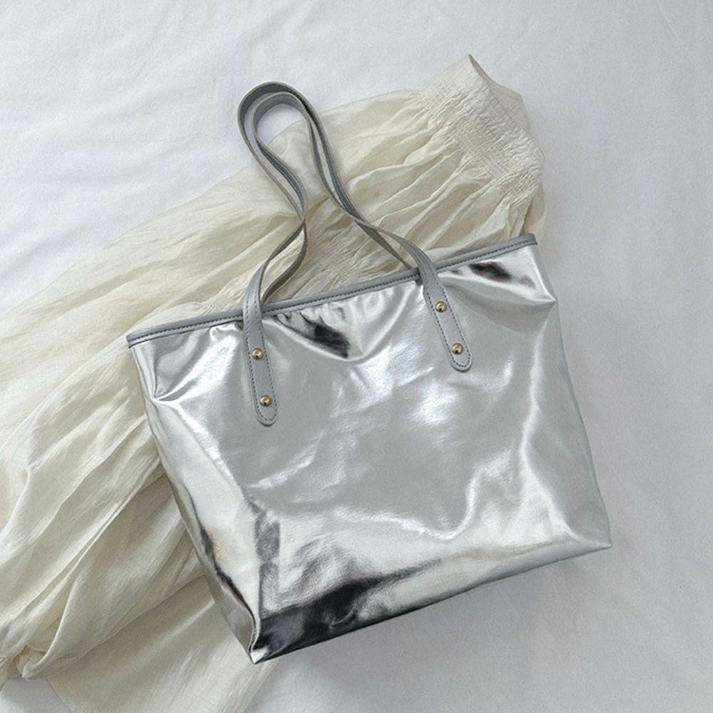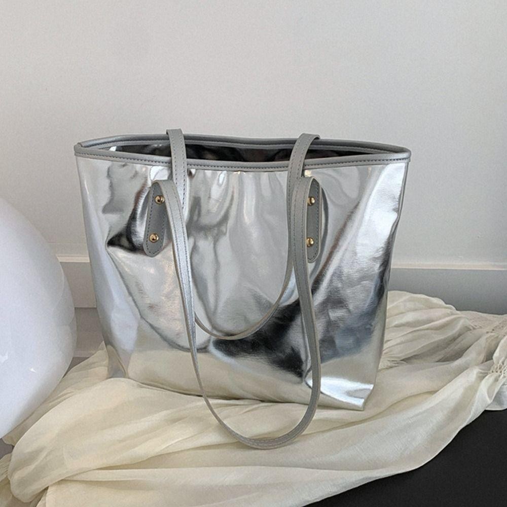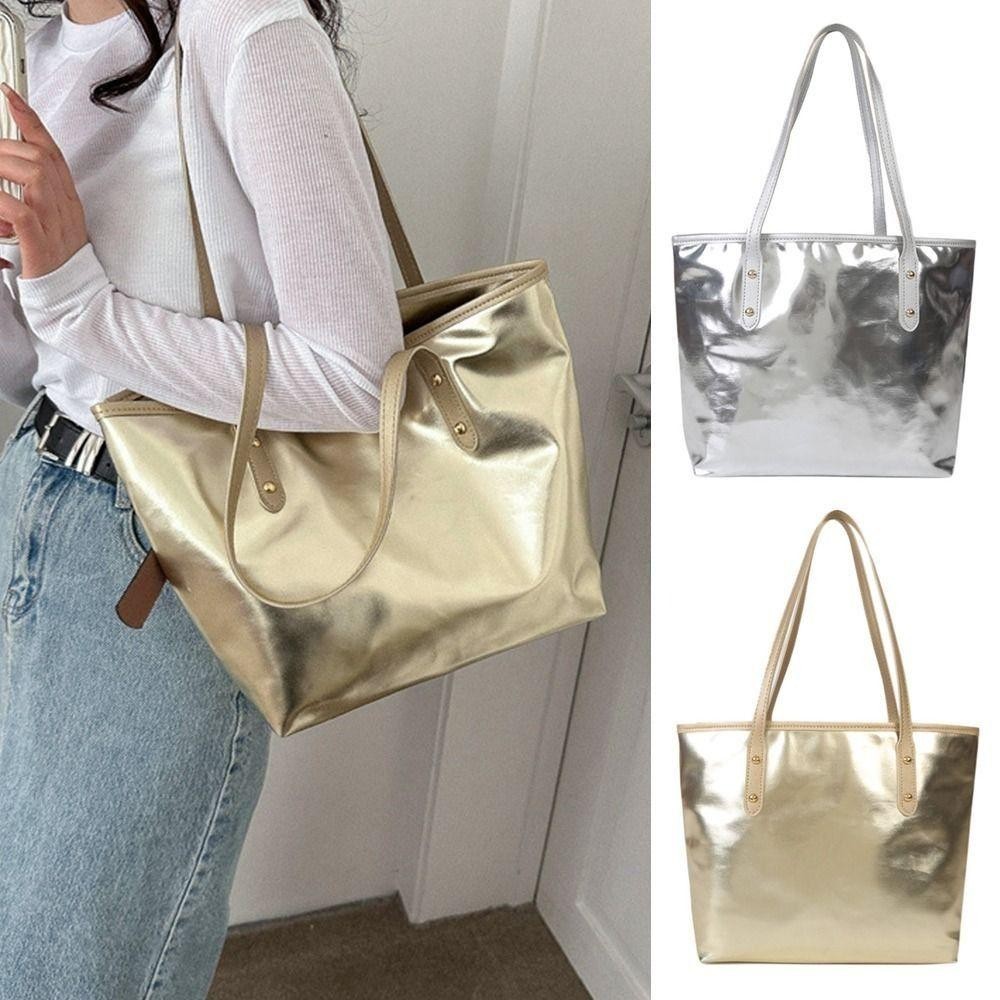 UUMIR กระเป๋าโท้ตสีเงิน, กระเป๋าสะพายหนัง PU ความจุขนาดใหญ่, กระเป๋าช้อปปิ้งสีเงินสีทอง