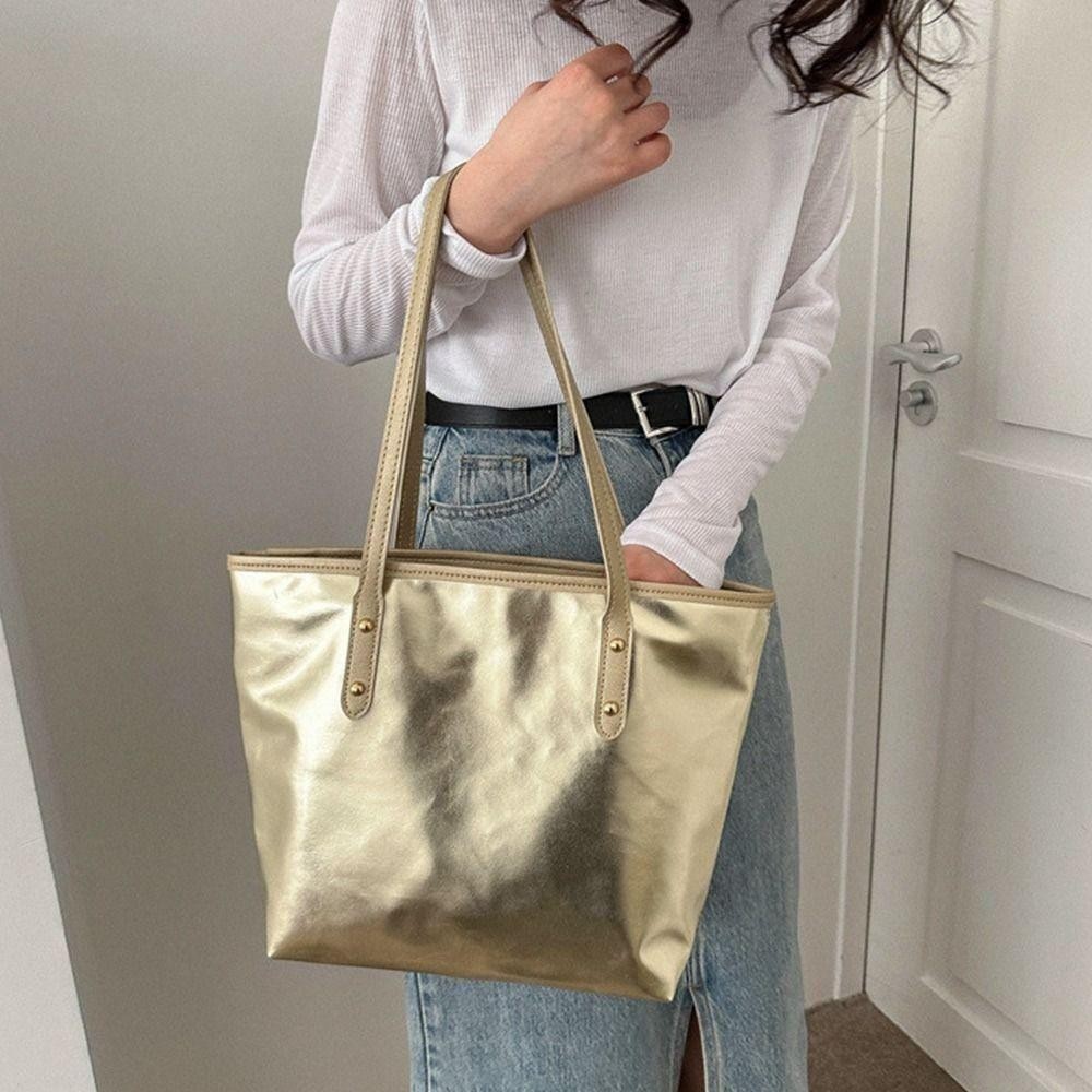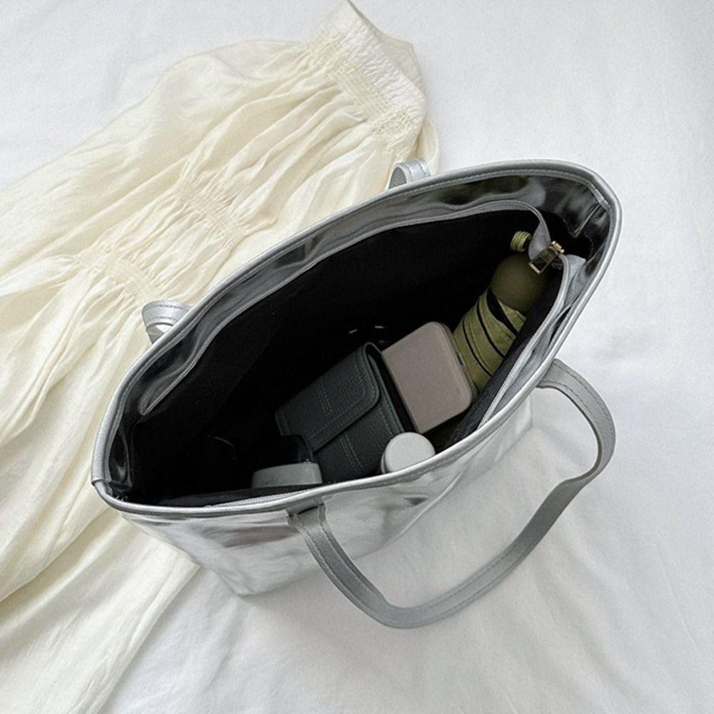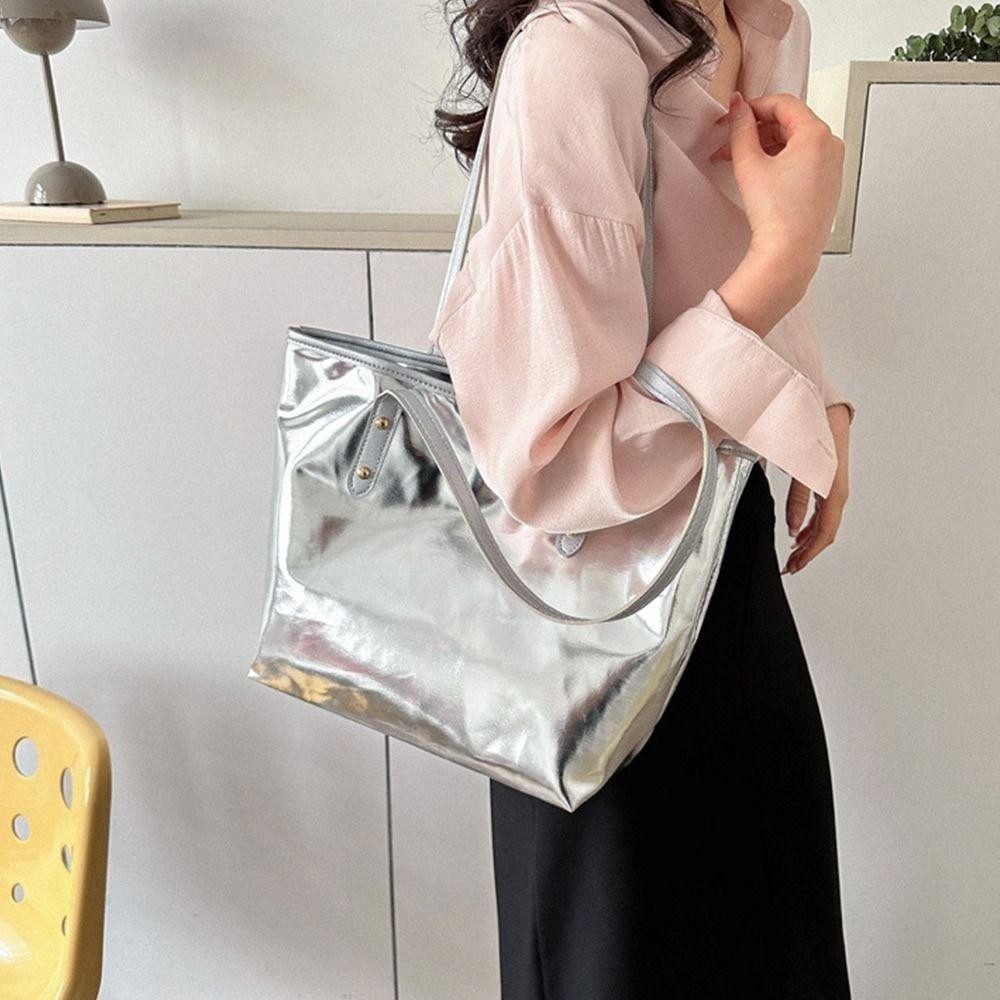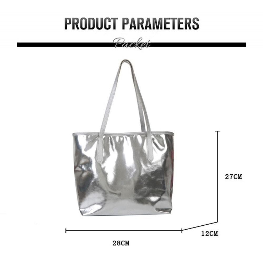 UUMIR กระเป๋าโท้ตสีเงิน, กระเป๋าสะพายหนัง PU ความจุขนาดใหญ่, กระเป๋าช้อปปิ้งสีเงินสีทอง