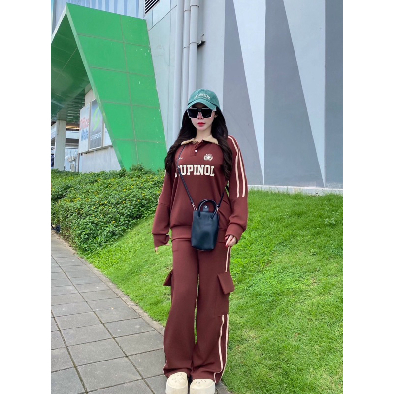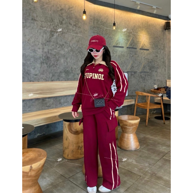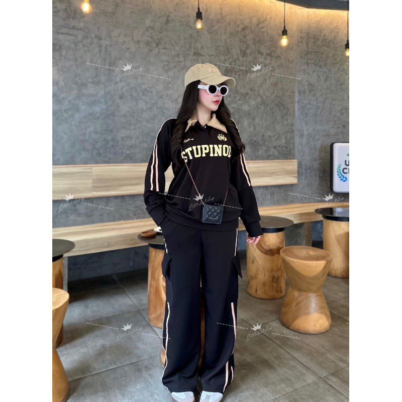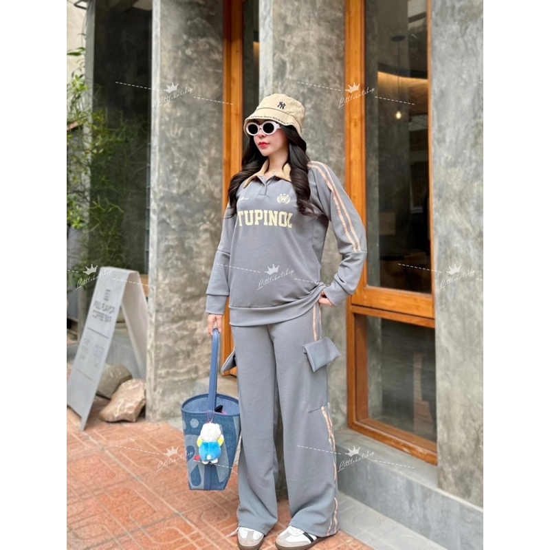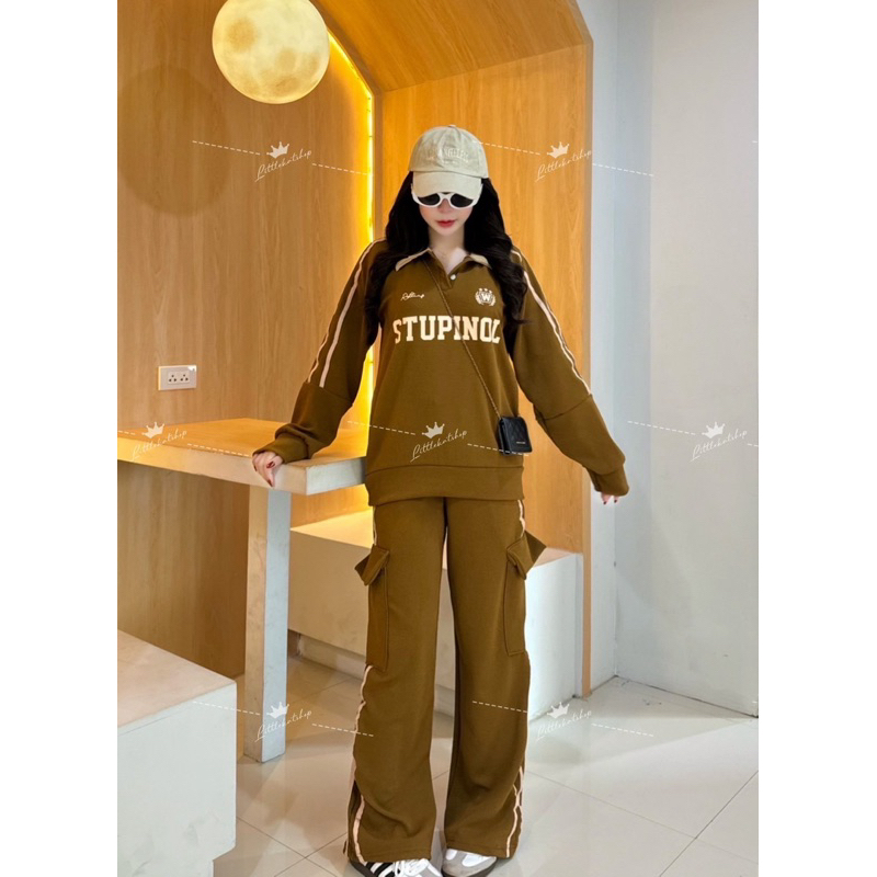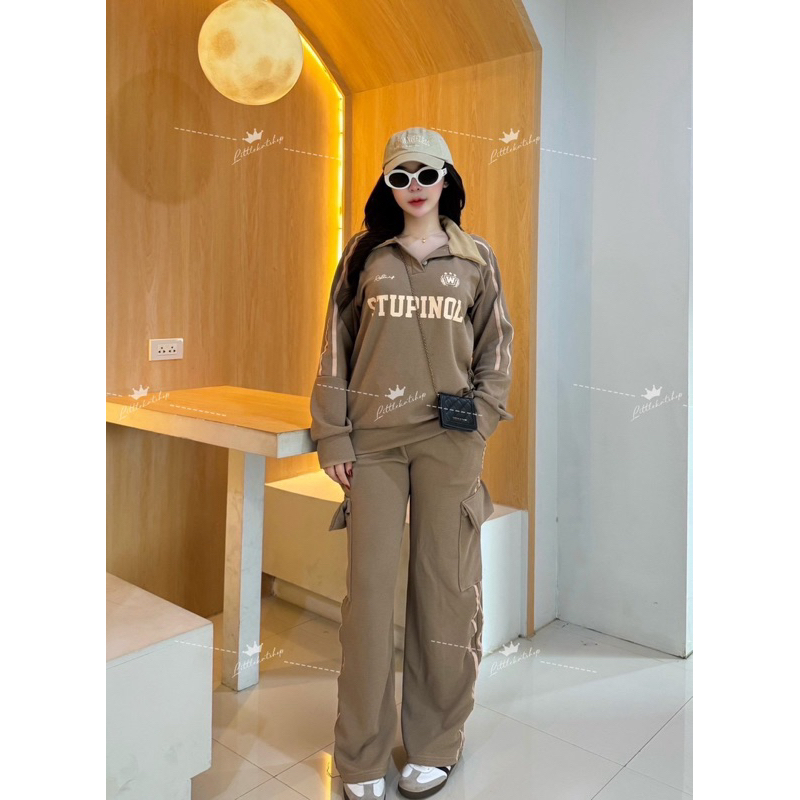 งานใหม่กระแสมาแรง !! OT ชุดเซ็ต 2 ชิ้น ผ้าวอมวูลเวฟ เสื้อทรงสเวตเตอร์แขนยาวคอปกแต่งกระดุม มีแถบข้าง + กางเกงคาโก้ขายาวแต่งแถบกระเป๋า 4 จุดสุดเท่