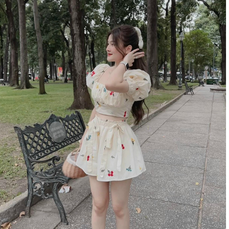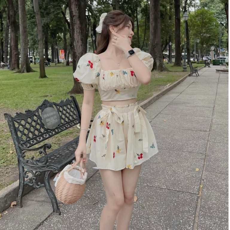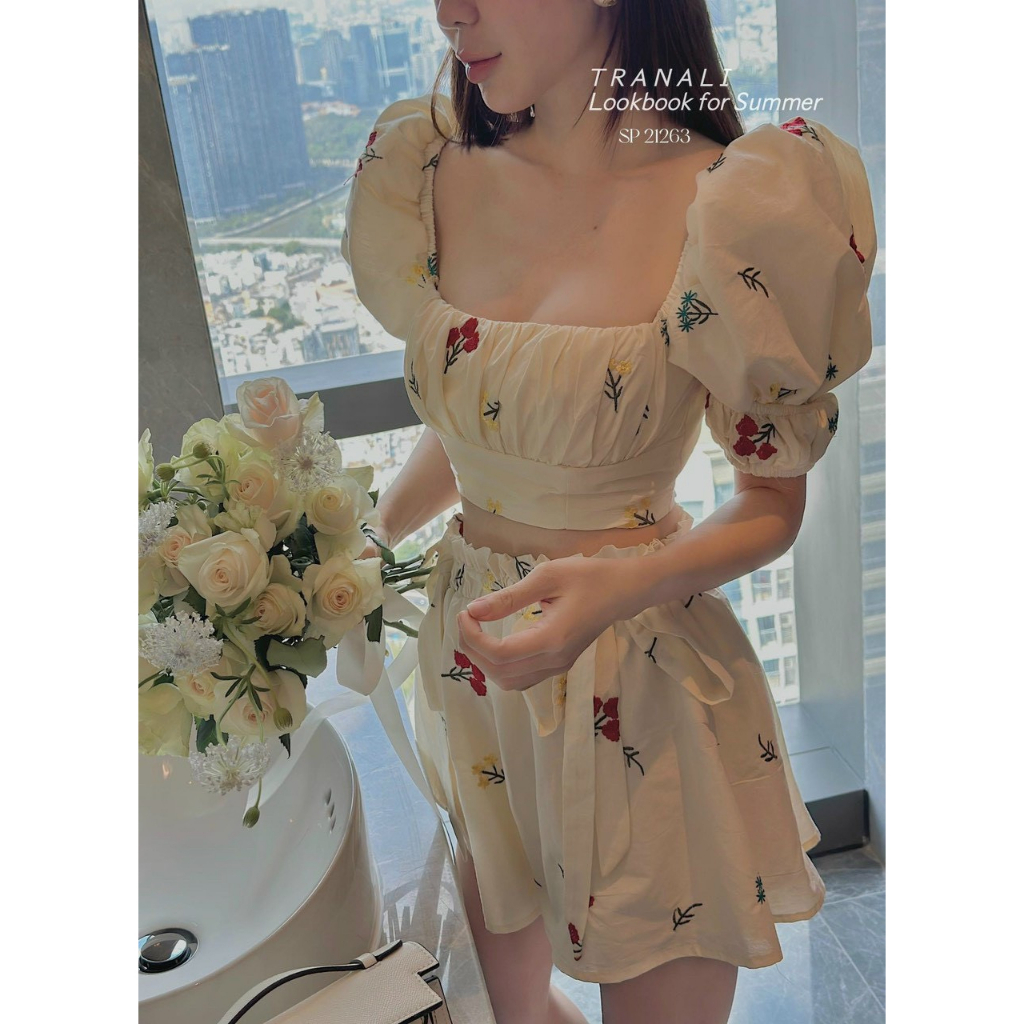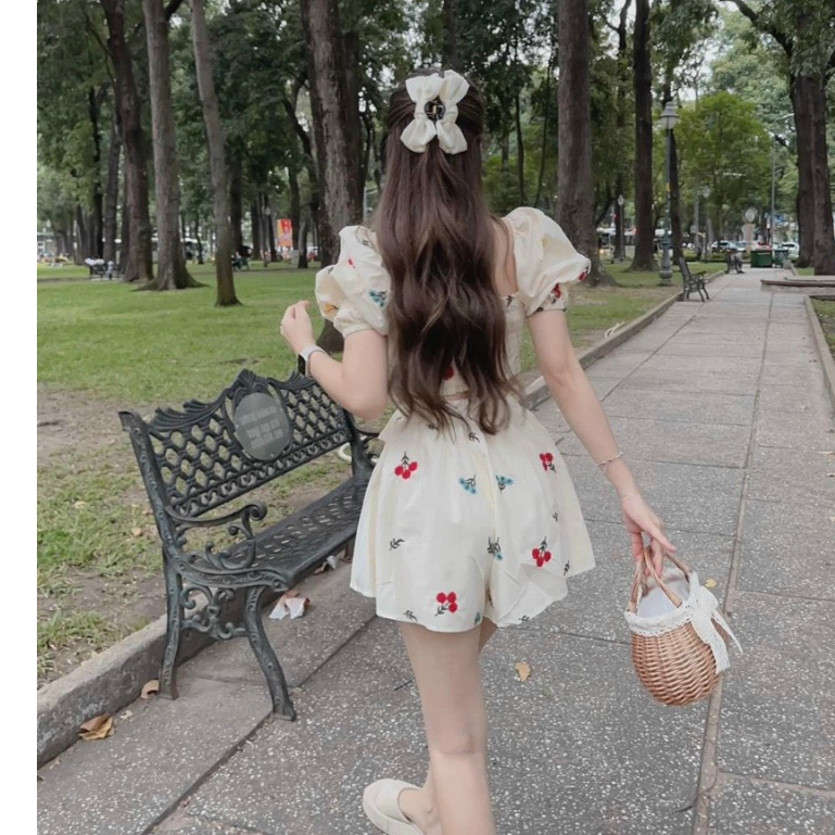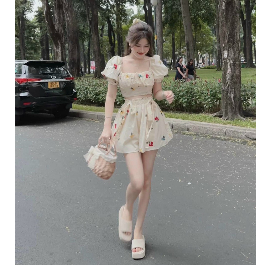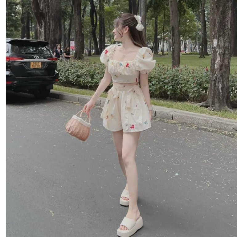 ชุดผู้หญิง ชุดเซทแขนพองกางเกงขาสั้นลายดอกไม้น่ารักสําหรับสาวๆน่ารักๆออกงานไปเที่ยว
