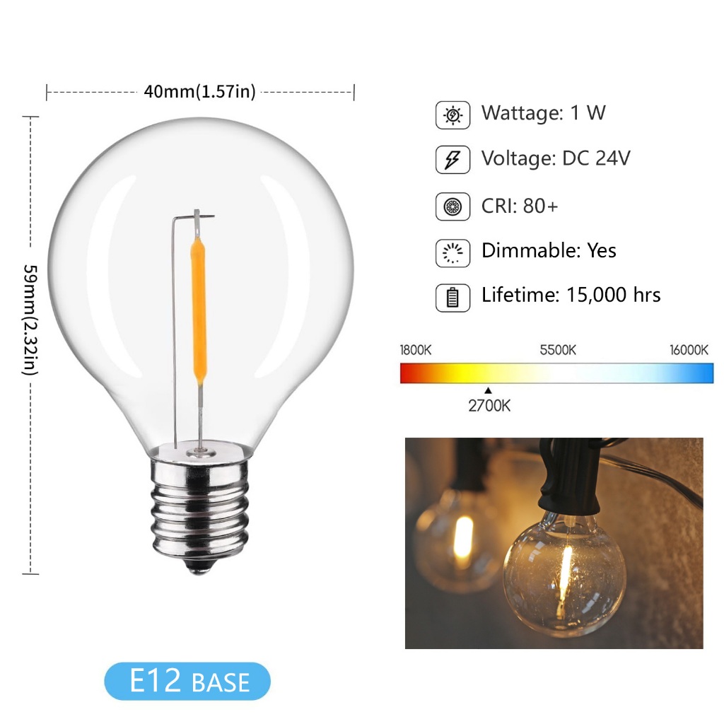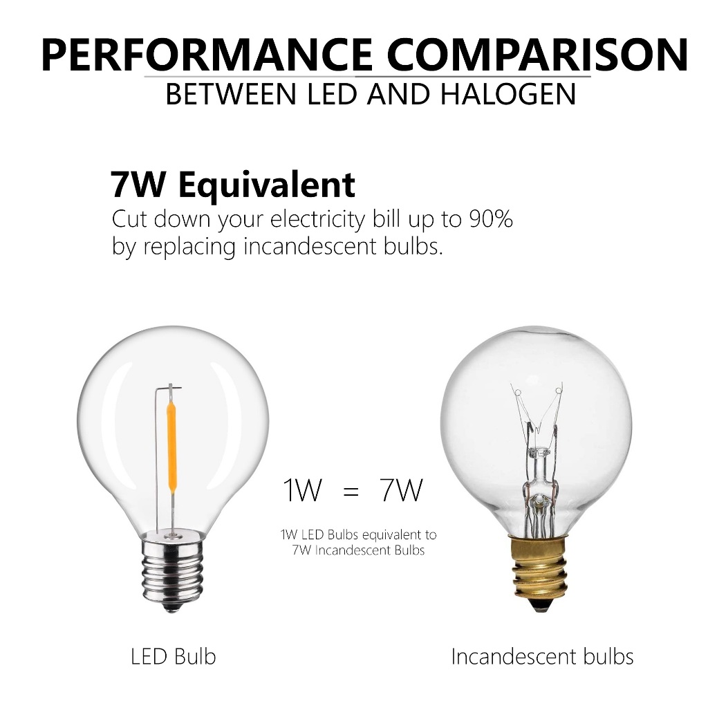 หลอดไฟแบบสาย G40 ของ G40 มีฐานสกรูเชิงเทียนที่เหมาะกับซ็อกเก็ต C7 และ E12 แต่ละชิ้น 1W เทียบเท่ากับหลอดไส้แบบเดิม 7 วัตต์ หลอดไฟก