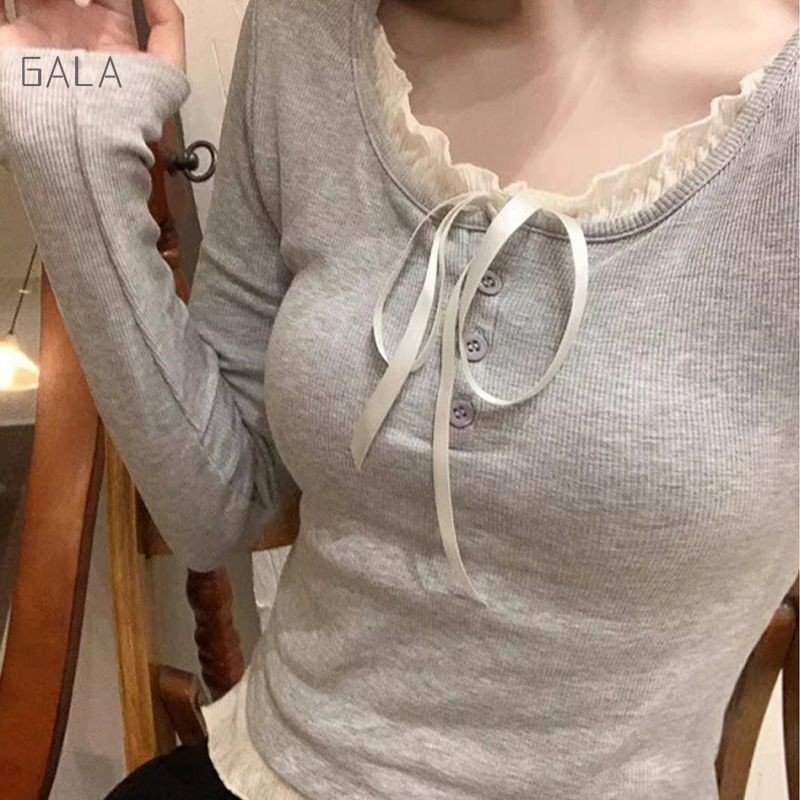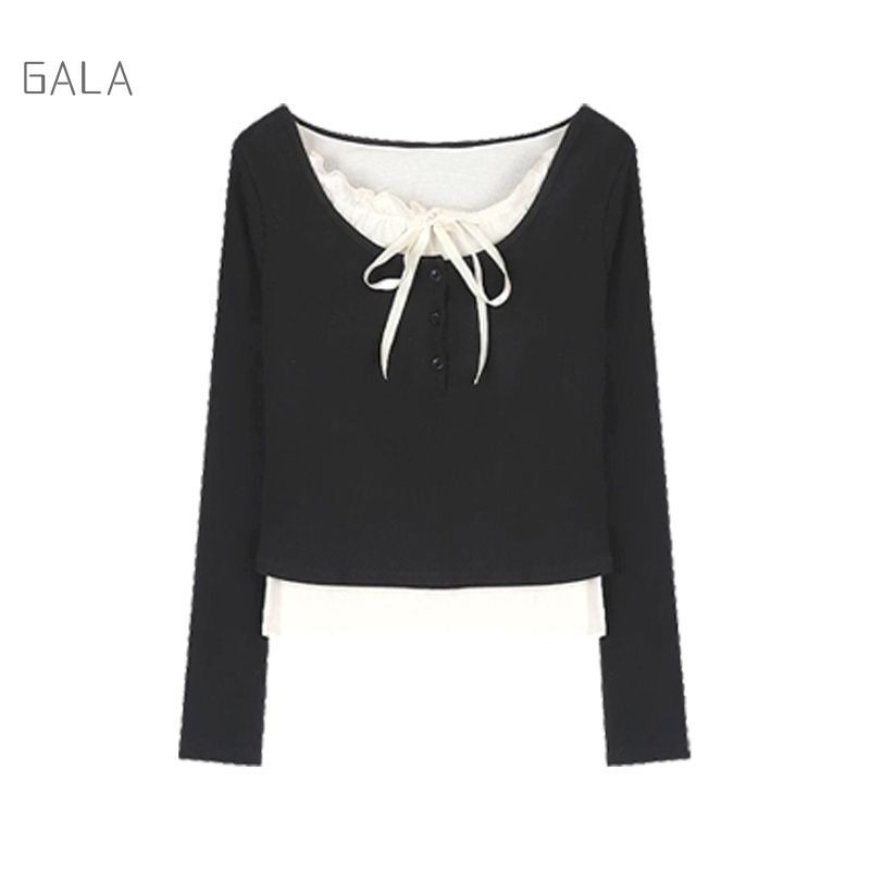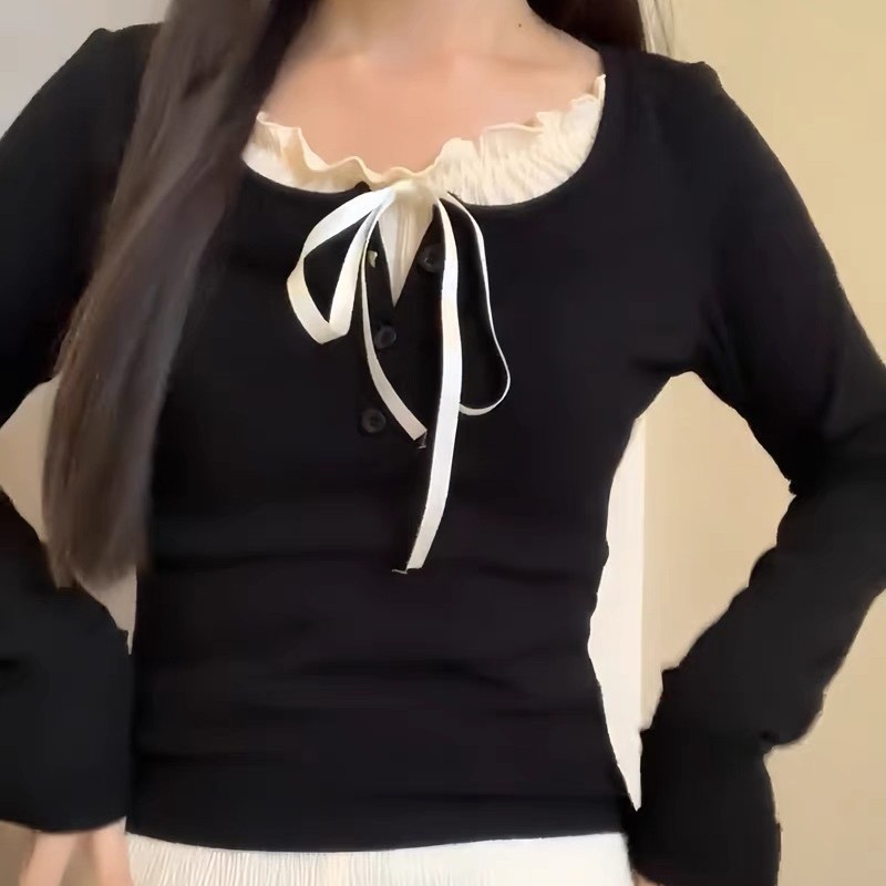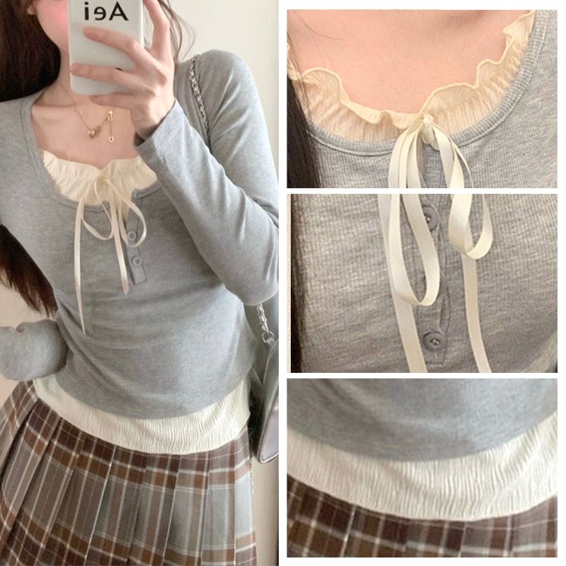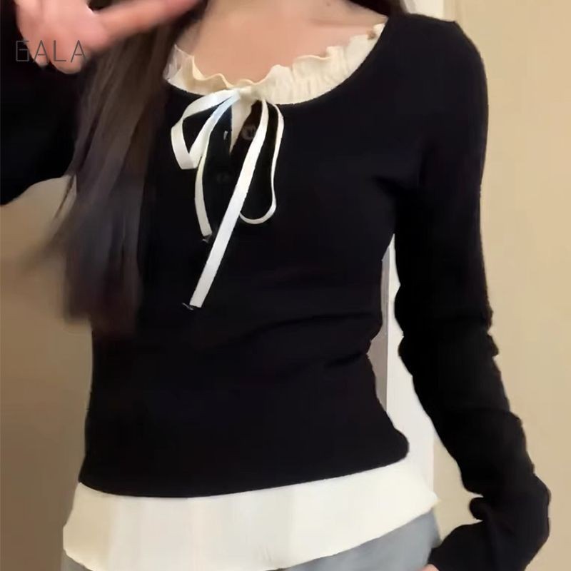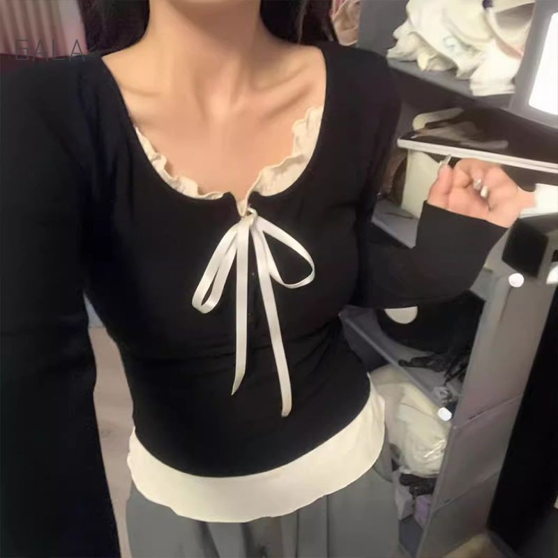 ปลอม 2 ชิ้นเสื้อยืดผู้หญิง Bow LACE-up Bottoming เสื้อ Ruffle EDGE SLIM FITTING TOP