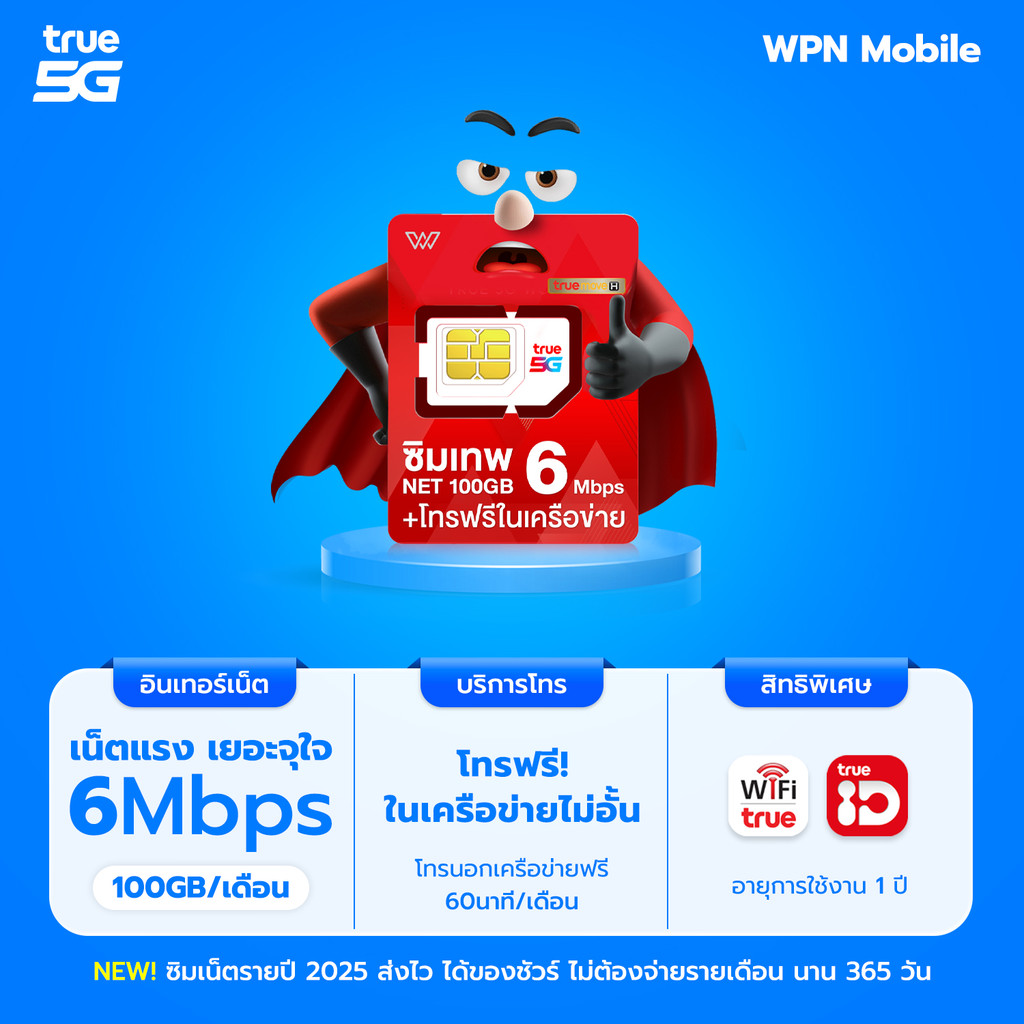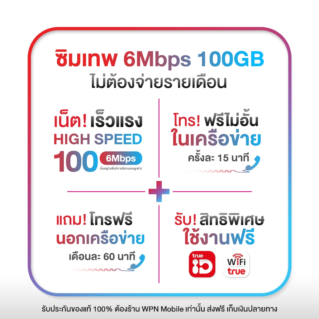 🔴True 6Mbps 100GB⚡️ 📶 เน็ตความเร็ว 6 Mbps 📶 รับเน็ต 100GB/เดือน (หากใช้ครบตามจำนวน เน็ตจะคงที่ 128Kbps) ☎️โทรนอกเครือข่าย 60นาที/เดือน ☎️โทรฟรีในเครือข่ายครั้งละ 15 นาที 🆓 ฟรี TrueID 🆓 ฟรี TrueWIFI ☑️ แพ็คเกจเน็ต 1 ปี