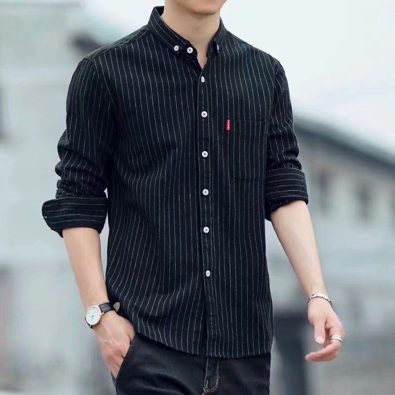 หยิบใส่ตะกร้า🔥M-5XL🔥 เสื้อเชิ้ต แขนยาว สีพื้น ลายทางแนวตั้ง สไตล์วินเทจ เกาหลี สำหรับผู้ชาย ไซซ์
