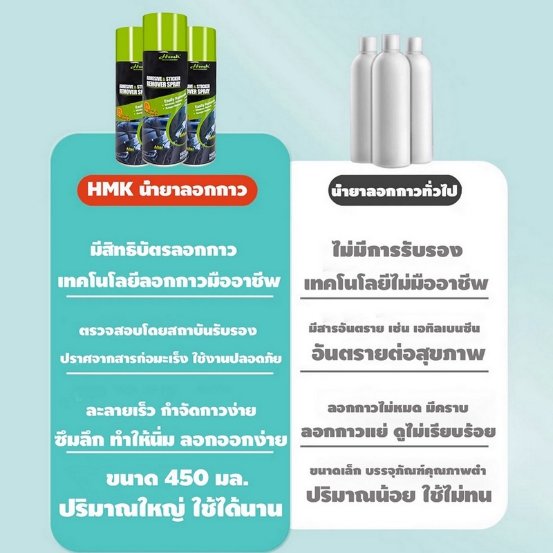 1.HMK น้ำยาล้างกาว ขนาด 450 มล. สามารถลบคราบกาว สติ๊กเกอร์ ป้ายทะเบียนรถ โลโก้ ป้ายราคาสินค้า หรือสารเหนียวต่างๆ ได้ 2.ทำความสะอาดกระจกหน้ารถ ตัวถัง สีรถ พลาสติก ยาง สแตนเลส อะลูมิเนียม และโครเมียมโดยไม่ทำลายผิวสีรถ 3.สูตรอ่อนโยน ไม่เป็นอันตรายต่อผิวหนังห