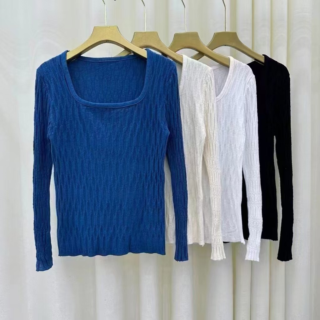 ถัก จุดต่ําสุด เสื้อผู้หญิงฤดูใบไม้ผลิฤดูใบไม้ร่วงรูปแบบใหม่ด้านในสไตล์ตะวันตกคอต่ําแขนยาวด้านบนเสื้อสวมหัวเสื้อกันหนาวฤ