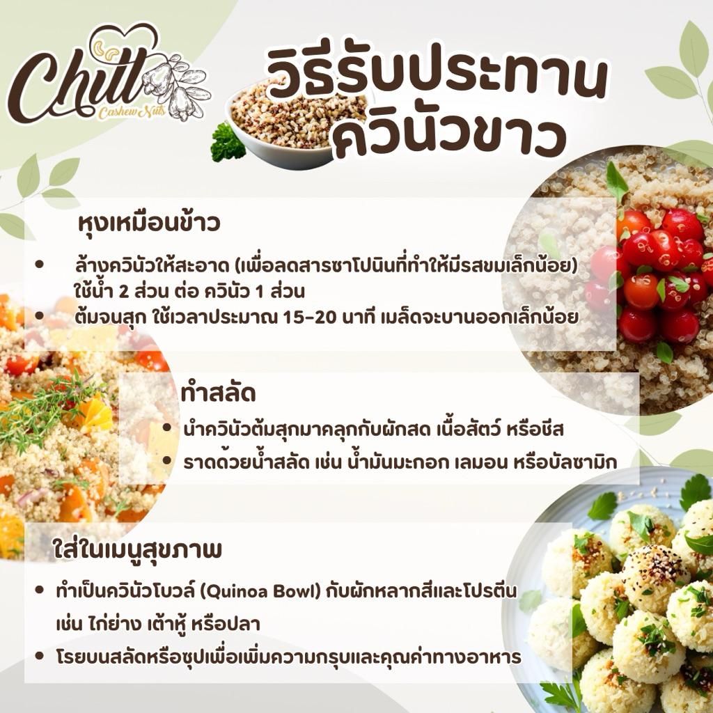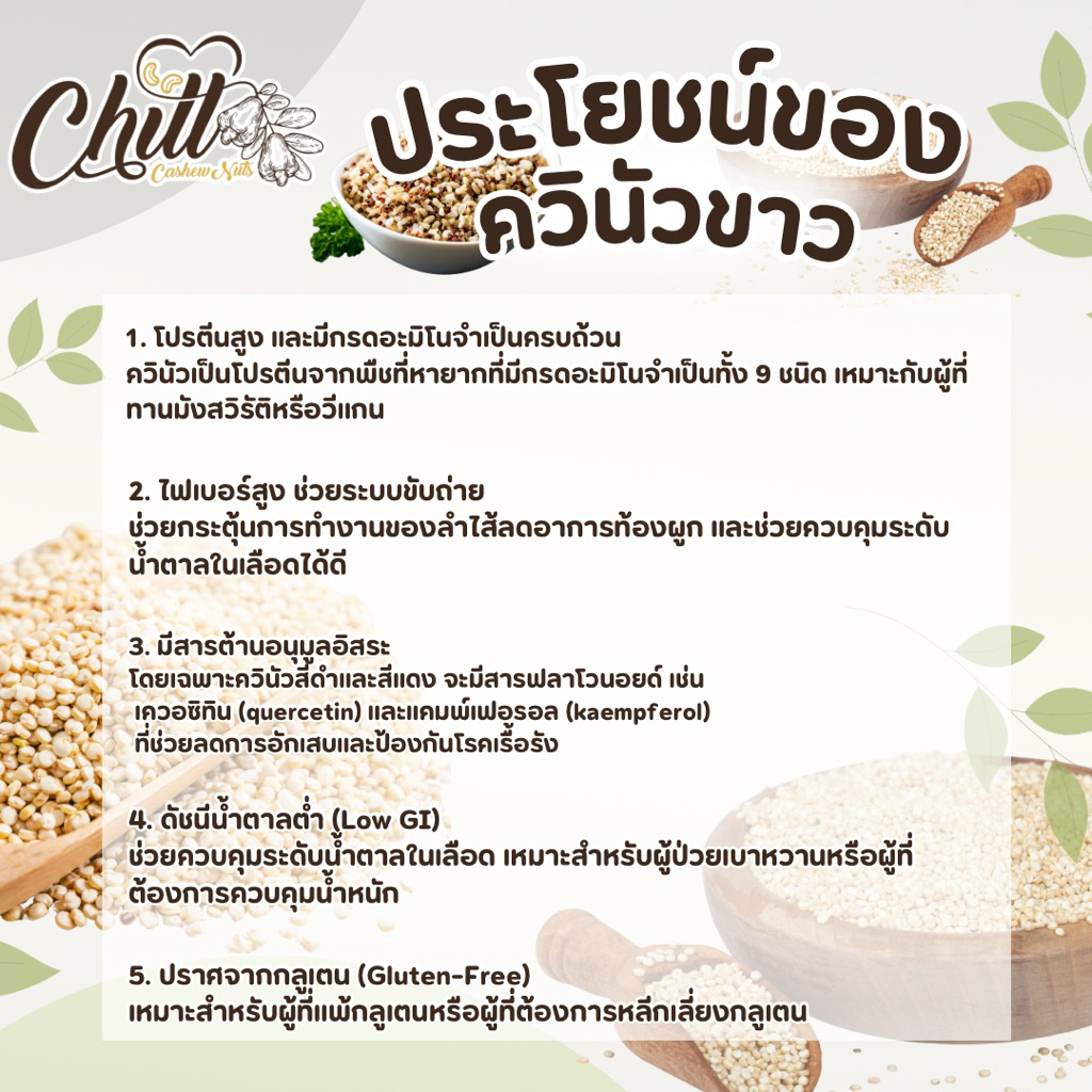 ควินัวที่ขึ้นชื่อว่าเป็นซูเปอร์ฟู้ด เพราะควินัวให้สารอาหารมากกว่าธัญพืชชนิดอื่น ๆ มีโปรตีน แคลเซียม ฟอสฟอรัส แมกนีเซียม ธาตุเหล็ก และไขมันดีที่จำเป็นต่อร่างกาย