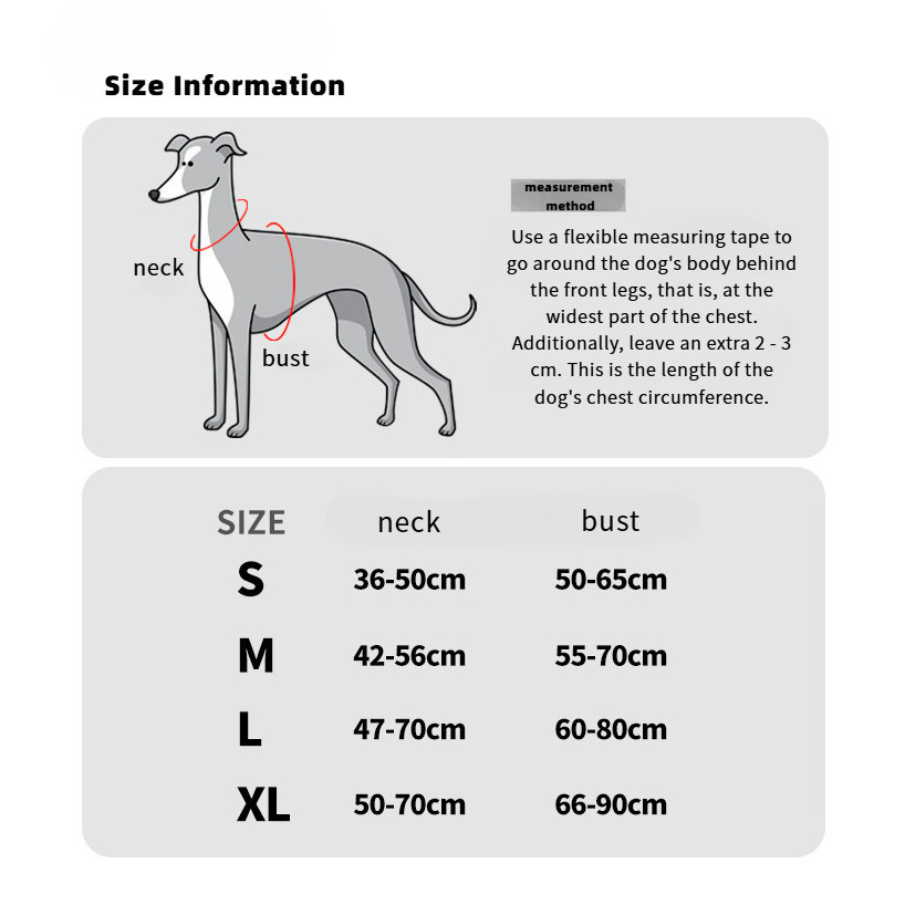 ขนาด M: ช่วงรอบคอ: 42-56 ซม., ช่วงรอบหน้าอก: 55-70 ซม