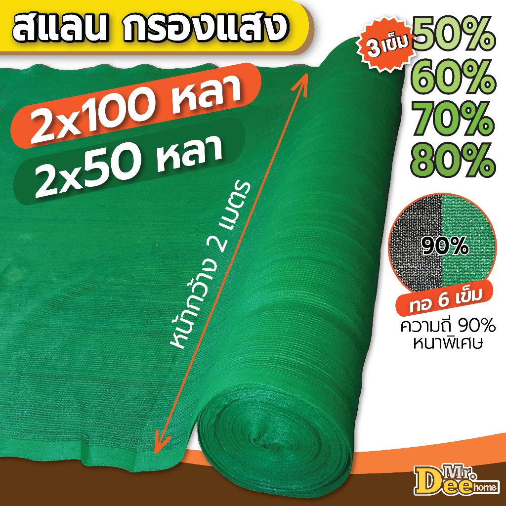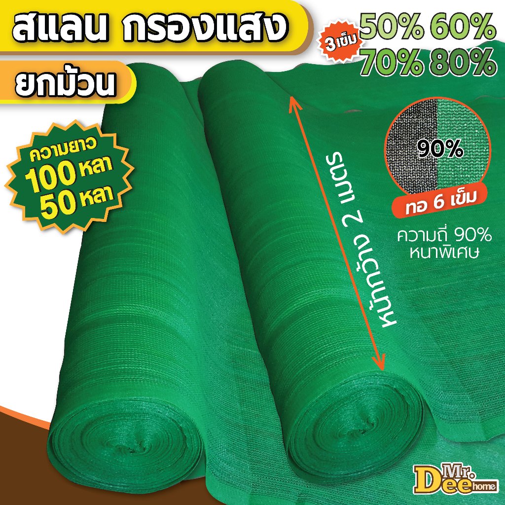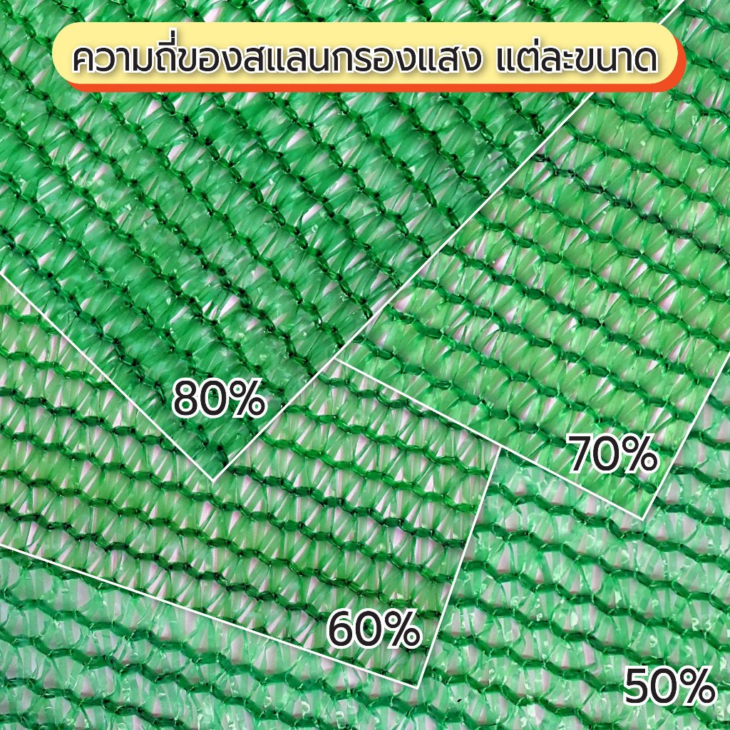 สแลนกรองแสง ตาข่ายกันแดด สีเขียว ทอ 3 เข็ม : ความถี่ 50%, 60%, 70%, 80% ทอ 6 เข็ม : ความถี่ 90% หน้ากว้าง 2 เมตร x ความยาว (ยกม้วน) – 50 หลา (45เมตร) – 100 หลา (90เมตร)