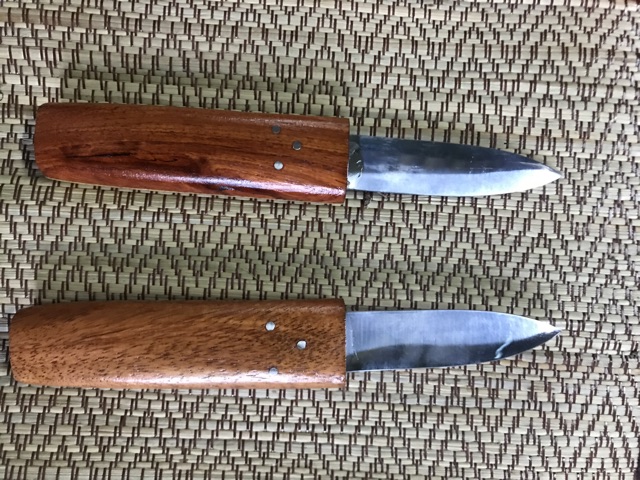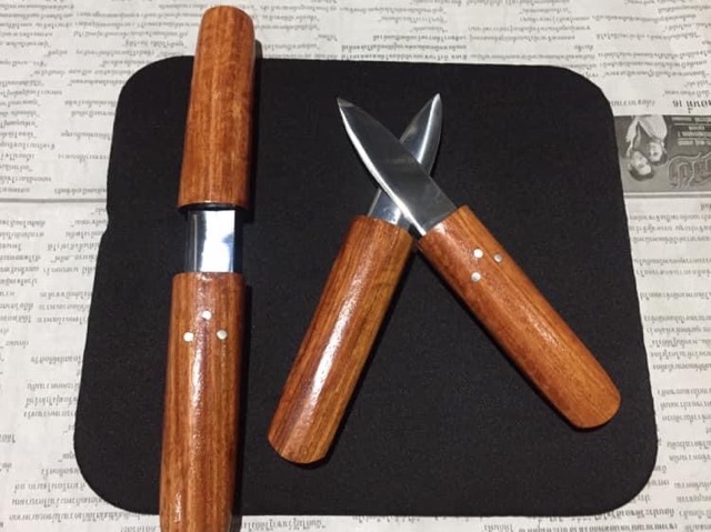 – ลักษณะใบมีด แบบสองเล่มสอดเก็บเข้าหากันเป็นปลอกมีดในตัว ใบมีดแบบ 2 คมปลายแหลม ปัดเงากระจก