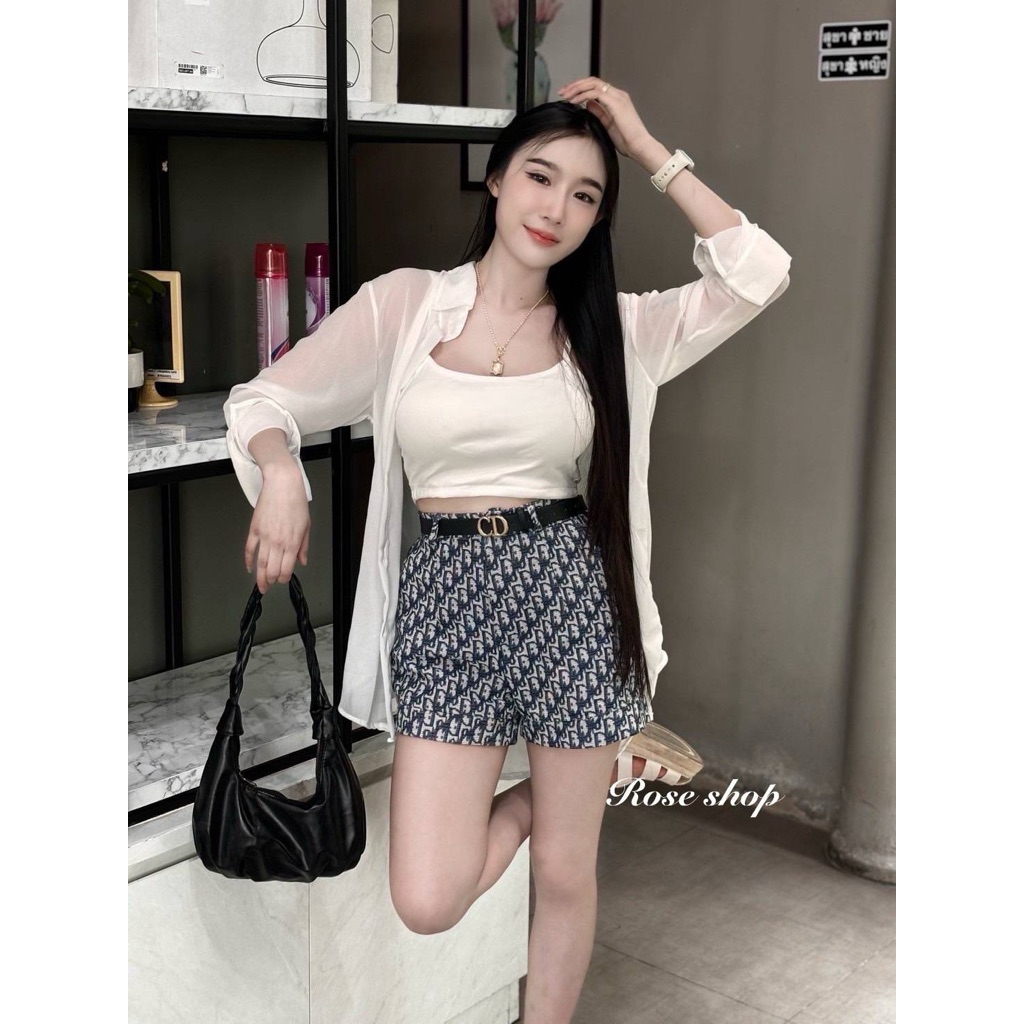 เสื้อเชิ้ตแขนสั้น ทรงครอปสั้นพิเศษ ลายสก็อตสีกรม/ขาว