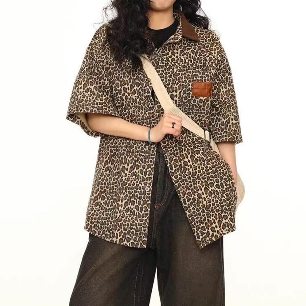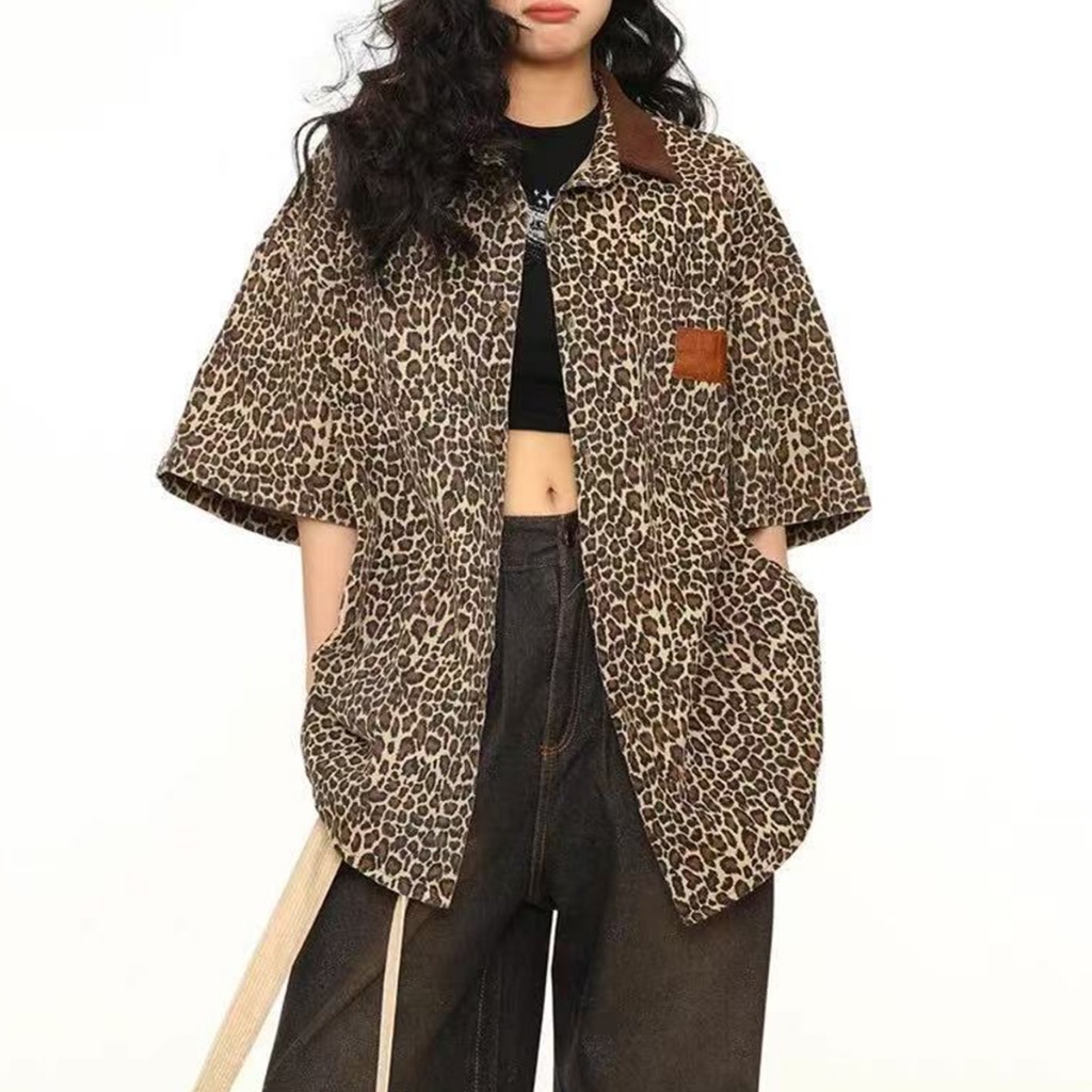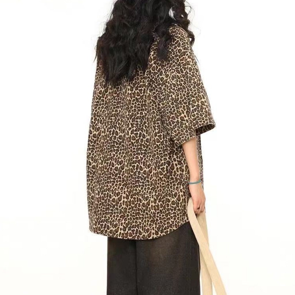 เสื้อเชิ้ตลายเสือดาวสไตล์ย้อนยุคอเมริกัน เสื้อเชิ้ตคอโปโลแขนสั้น แจ็กเก็ตสตรีทเทรนด์