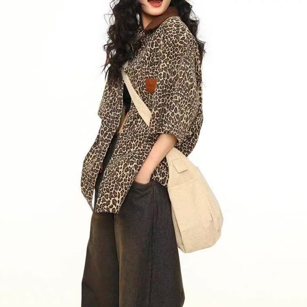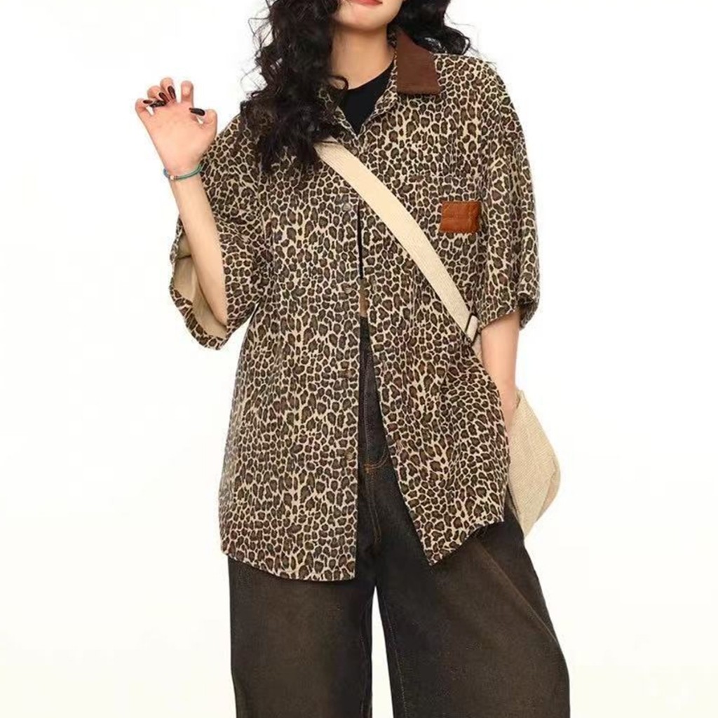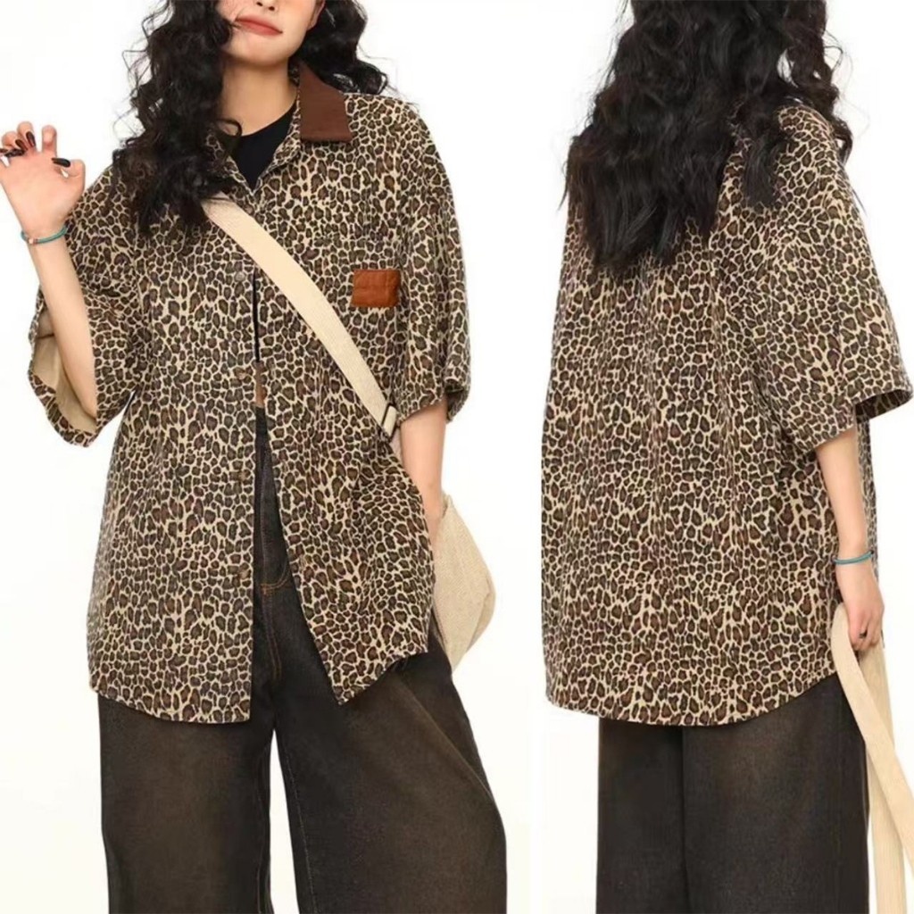 เสื้อเชิ้ตลายเสือดาวสไตล์ย้อนยุคอเมริกัน เสื้อเชิ้ตคอโปโลแขนสั้น แจ็กเก็ตสตรีทเทรนด์