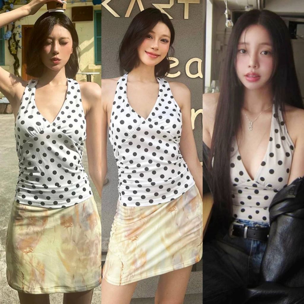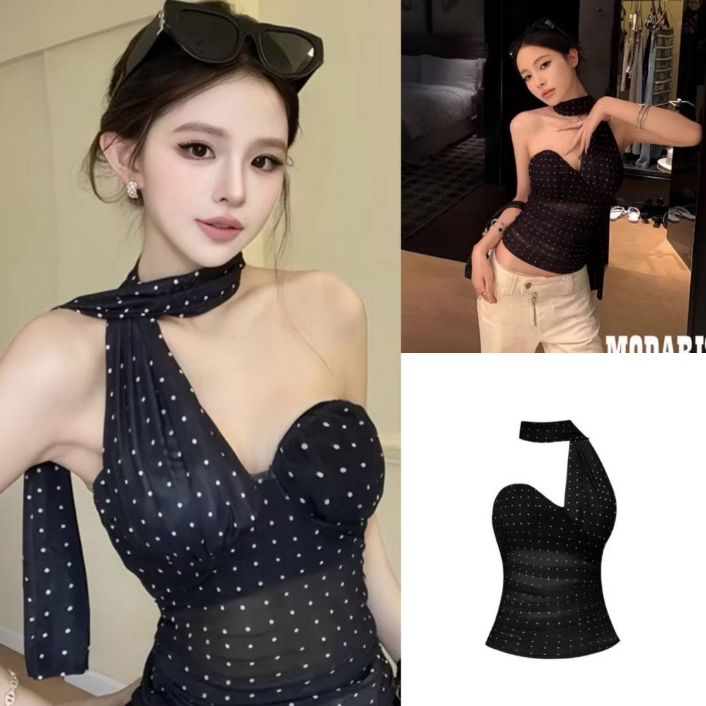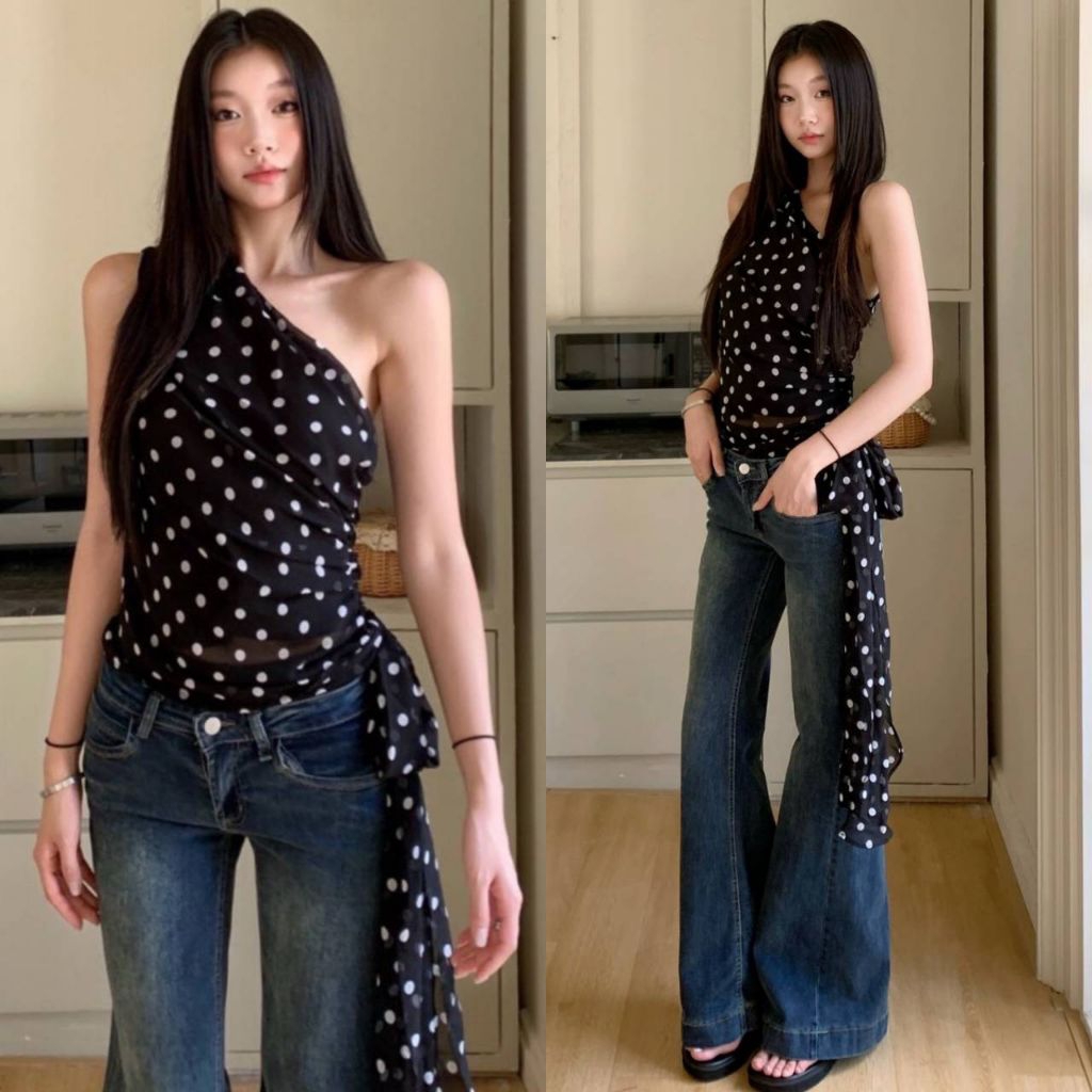 เสื้อตาข่ายลายจุด ทรงเข้ารูป ผูกข้างเก๋ ๆ ใส่แมทช์ได้ทุกลุค สายฝอ สายหวาน คือรอด!”