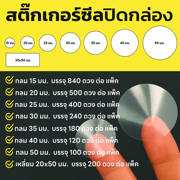 สติ๊กเกอร์ซีล ชนิดพลาสติกใสพิเศษ PET ทรงกลมชนิดแผ่น ติดแน่น ใช้ง่าย มีหลายขนาด เหมาะสำหรับปิดกล่อง เอกสารทั่วไป
