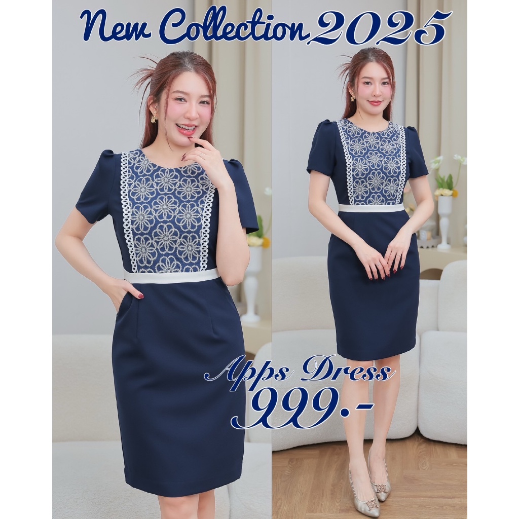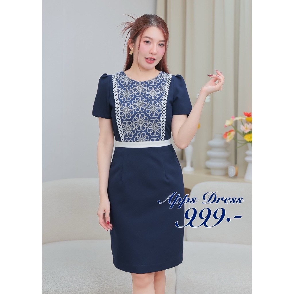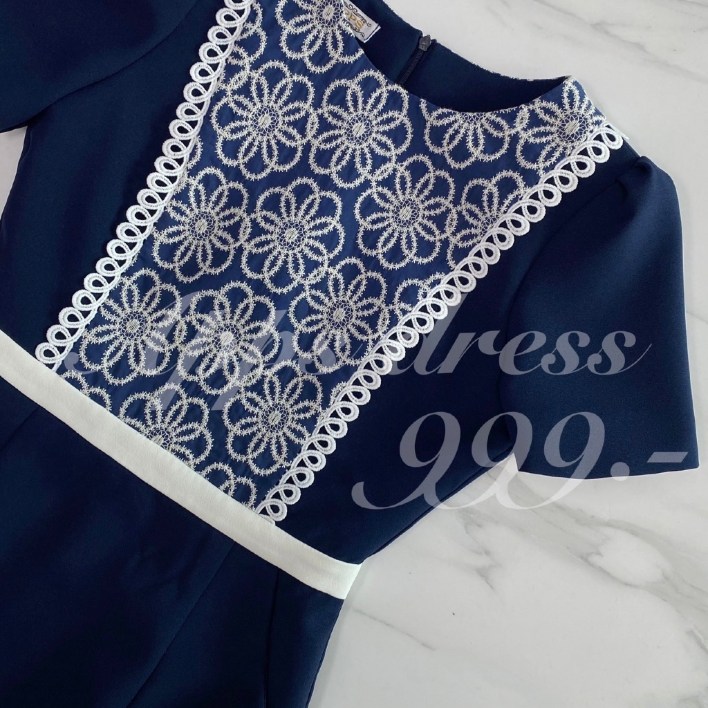 ✨✨รายเอียดชุด✨✨ เดรสทรงสอบ ออกแบบแต่งเสื้อลูกไม้ปัก โทนสีกรมท่า ลายดอกไม้ แขนสั้น กระโปรงผ้าสเปนเด็กซ์ ทรงสอบมีกระเป๋าข้าง ดีไซน์สวยแบบเรียบ สวยงาม สุขภาพ