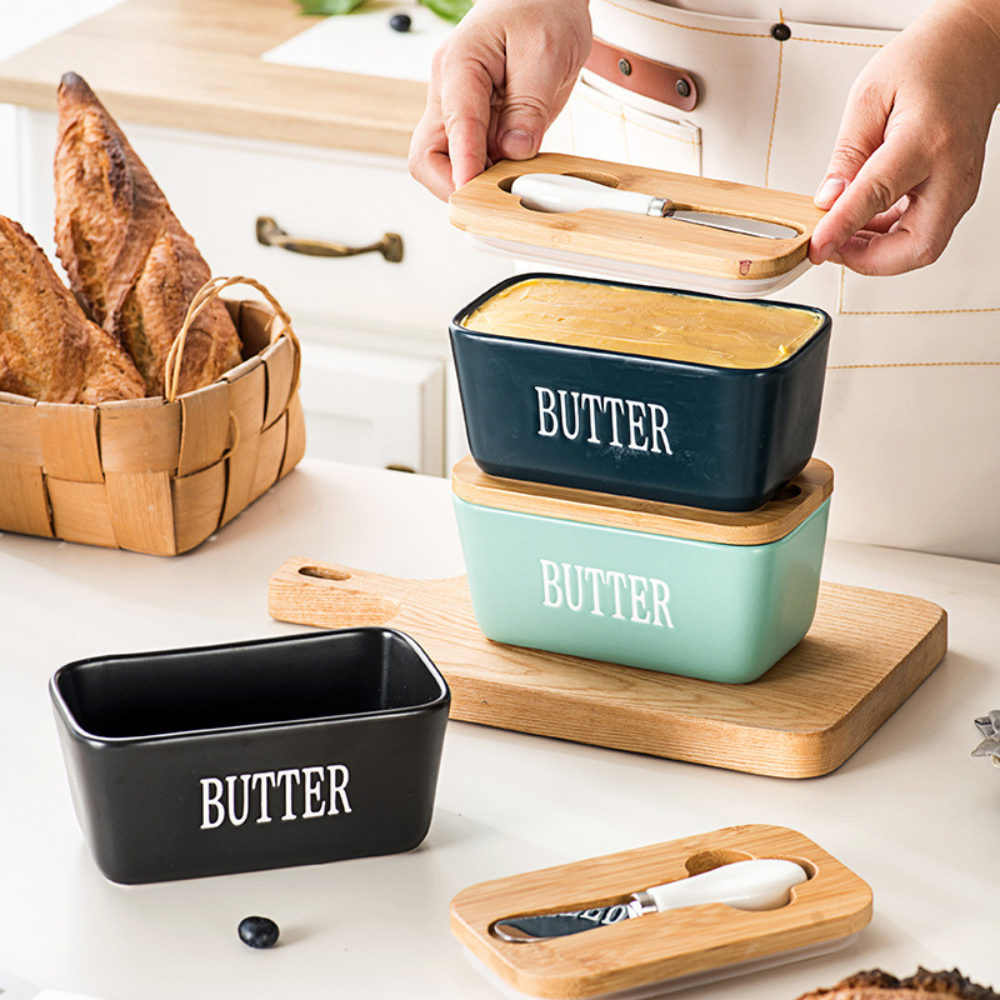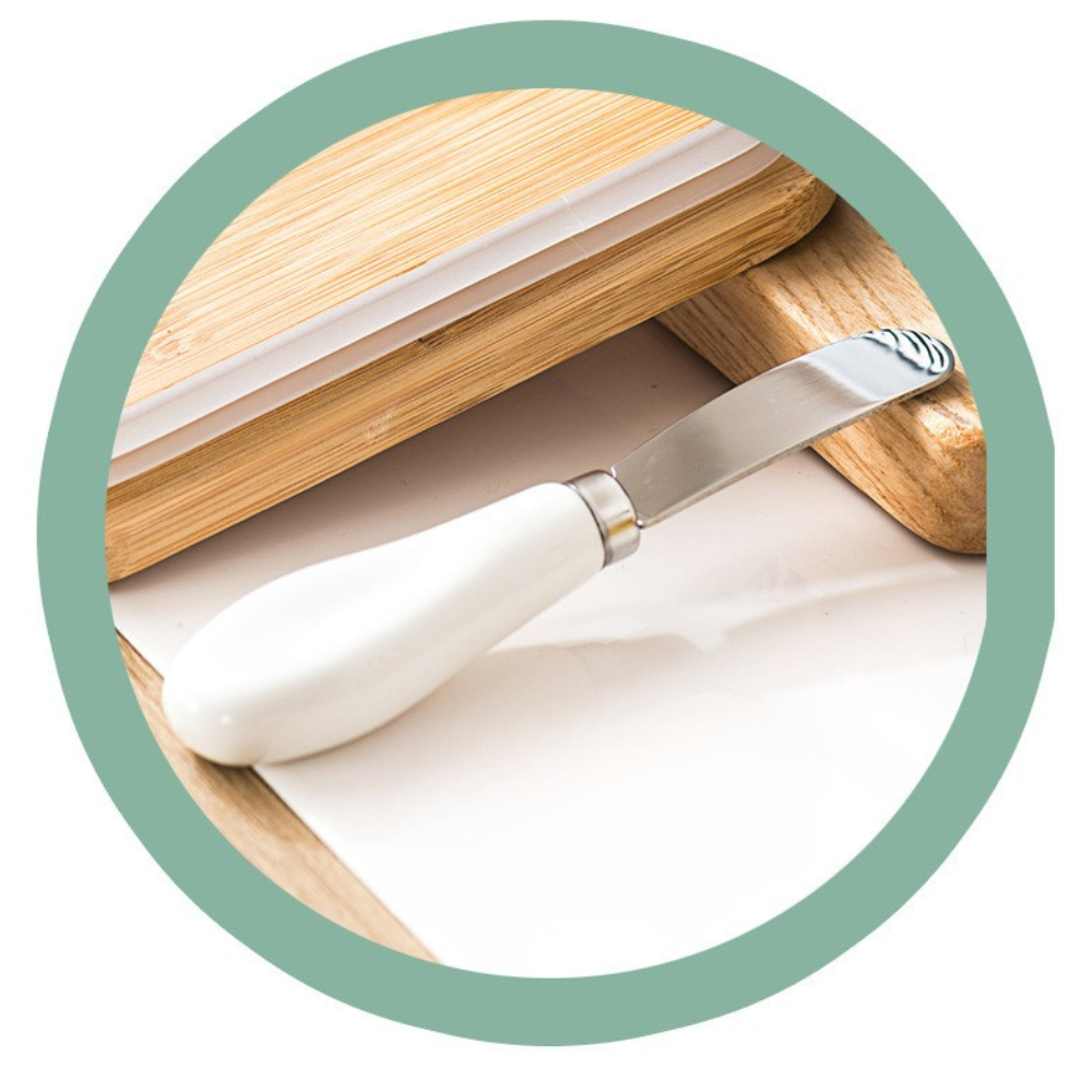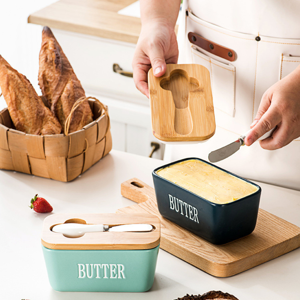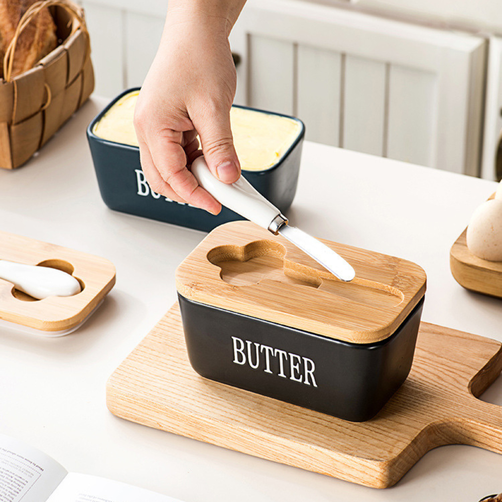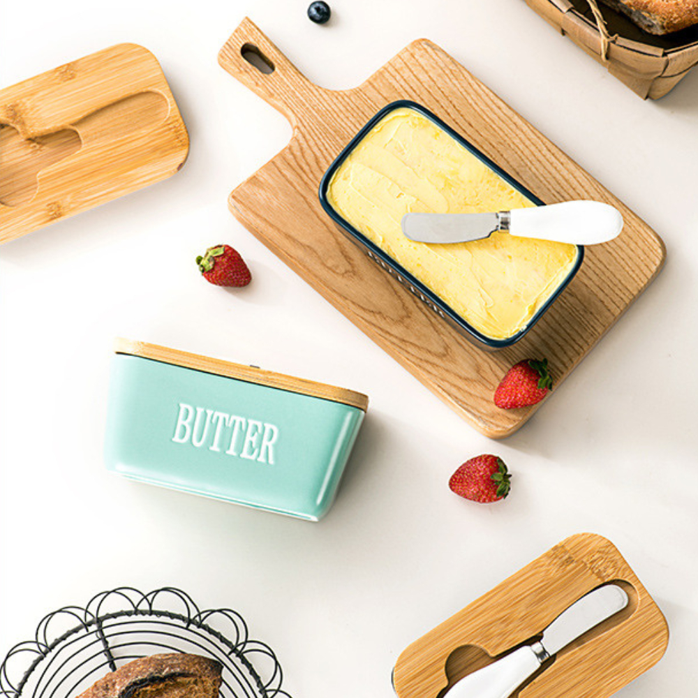 กล่องเก็บเนยพร้อมมีดตัด กล่องใส่เนยเซรามิกฝาไม้ มีดตัดสแตนเลส ใช้งานสะดวก เก็บในตู้เย็นได้