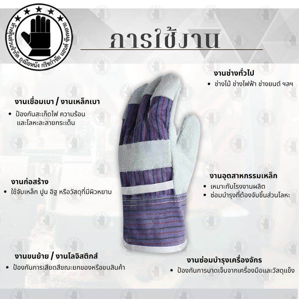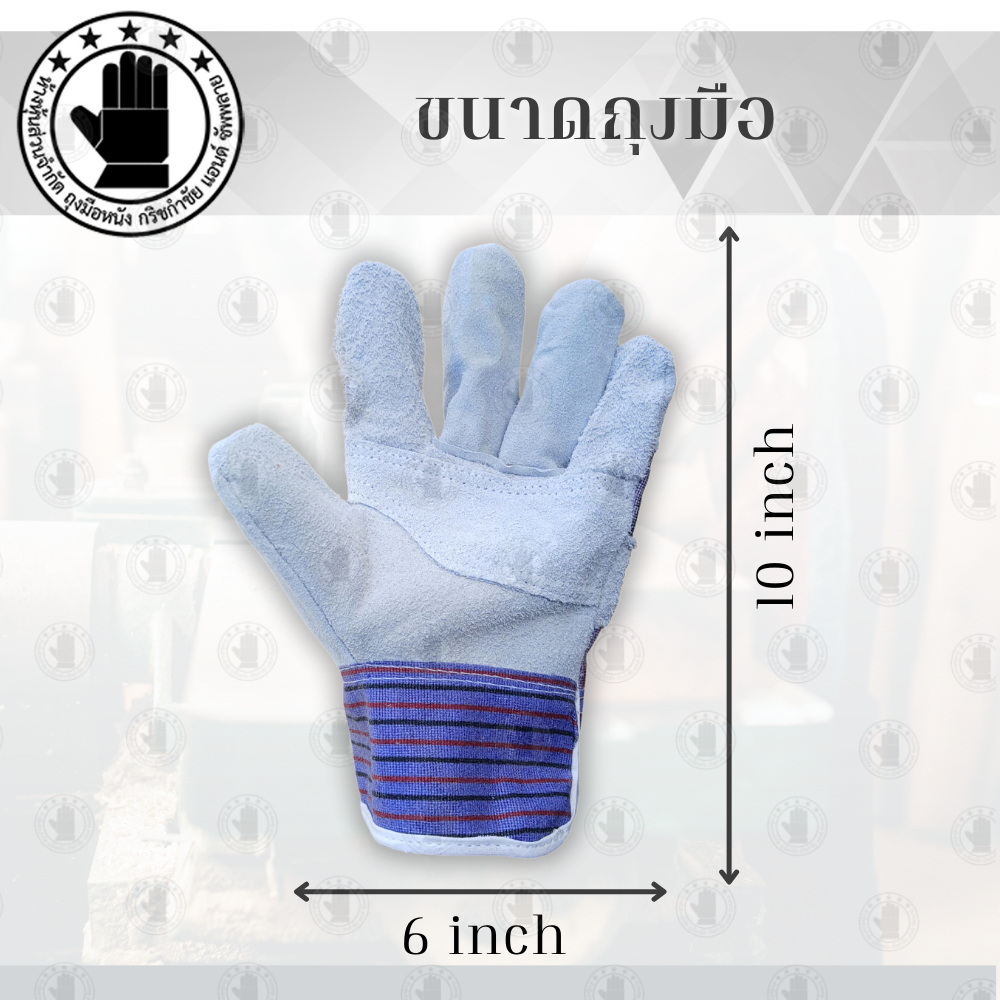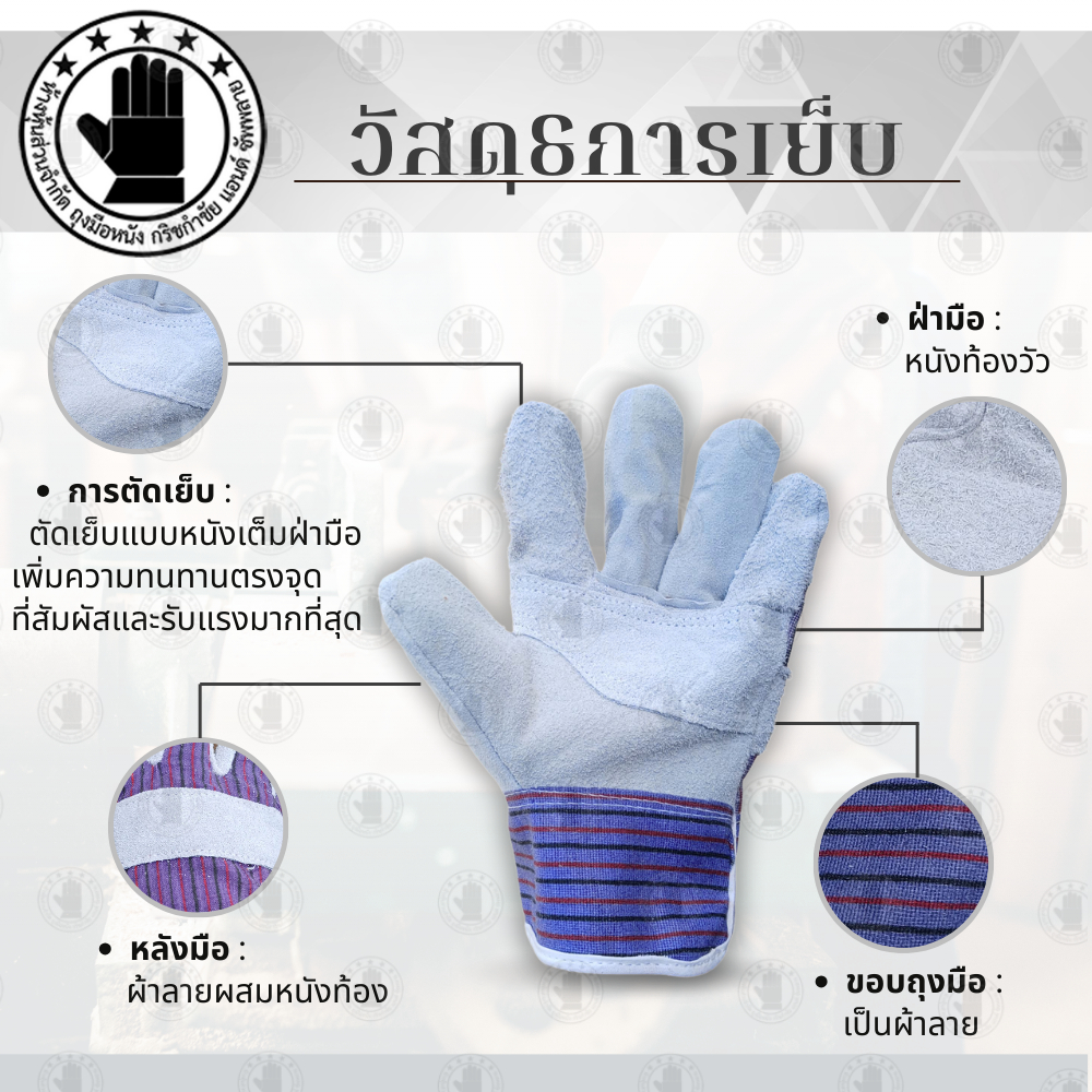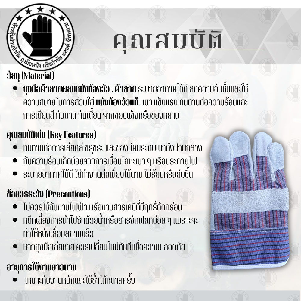 ถุงมือผ้าลายผสมหนังท้องวัว : ผ้าลาย ระบายอากาศได้ดี ลดความอับชื้นและให้ความสบายในการส่วมใส่