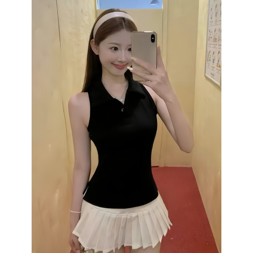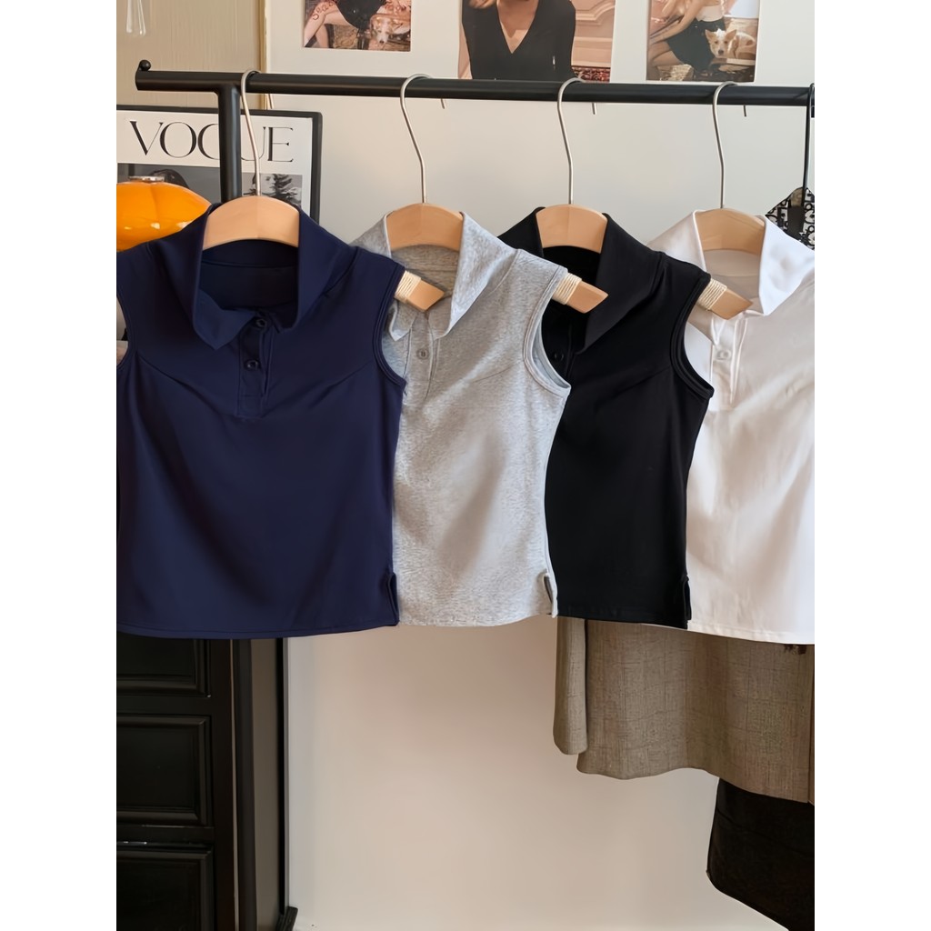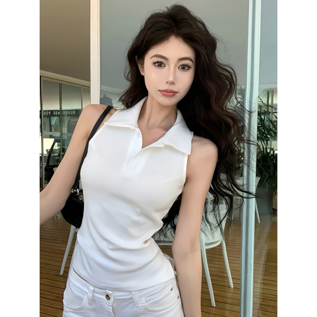 SultrySia เสื้อครอปสำหรับผู้หญิง เสื้อคอปกแขนกุด สีพื้นใส่สบายมาก คาวาอี้ เสริมฟองน่ำ “FY33031”