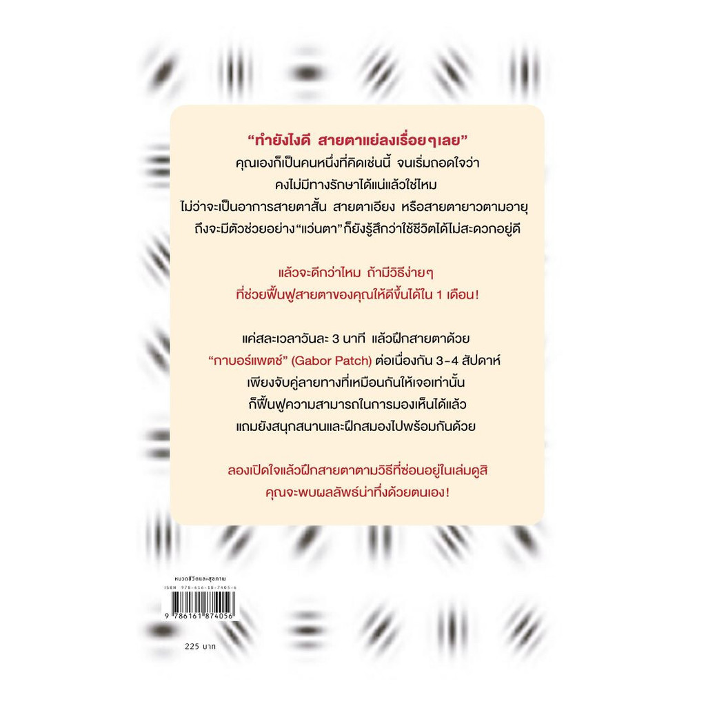 แนะนำแบบฝึกหัดง่ายๆ ด้วยวิธี Gabor Eye ที่ช่วยให้สายตาดีขึ้น ผ่านการประมวลผลของสมอง เพียงแค่ฝึกวันละ 3 นาที ต่อเนื่องกัน 3-4 สัปดาห์ สายตาดีขึ้นแน่นอน! เหมาะสำหรับคนที่ทุกข์ทรมานจากอาการสายตาสั้น สายตายาว และสายตาเอียง ในเล่มผู้อ่านจะได้เพลิดเพลิ