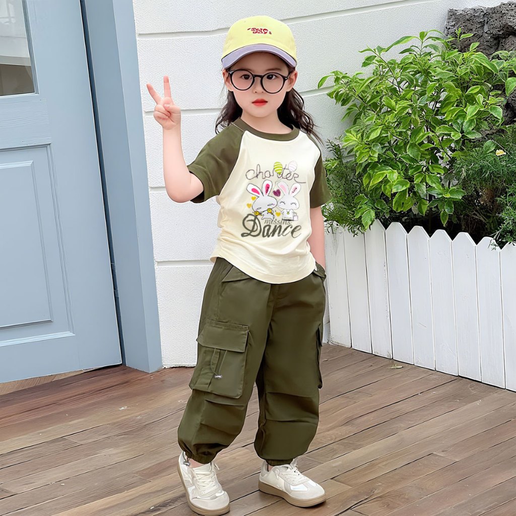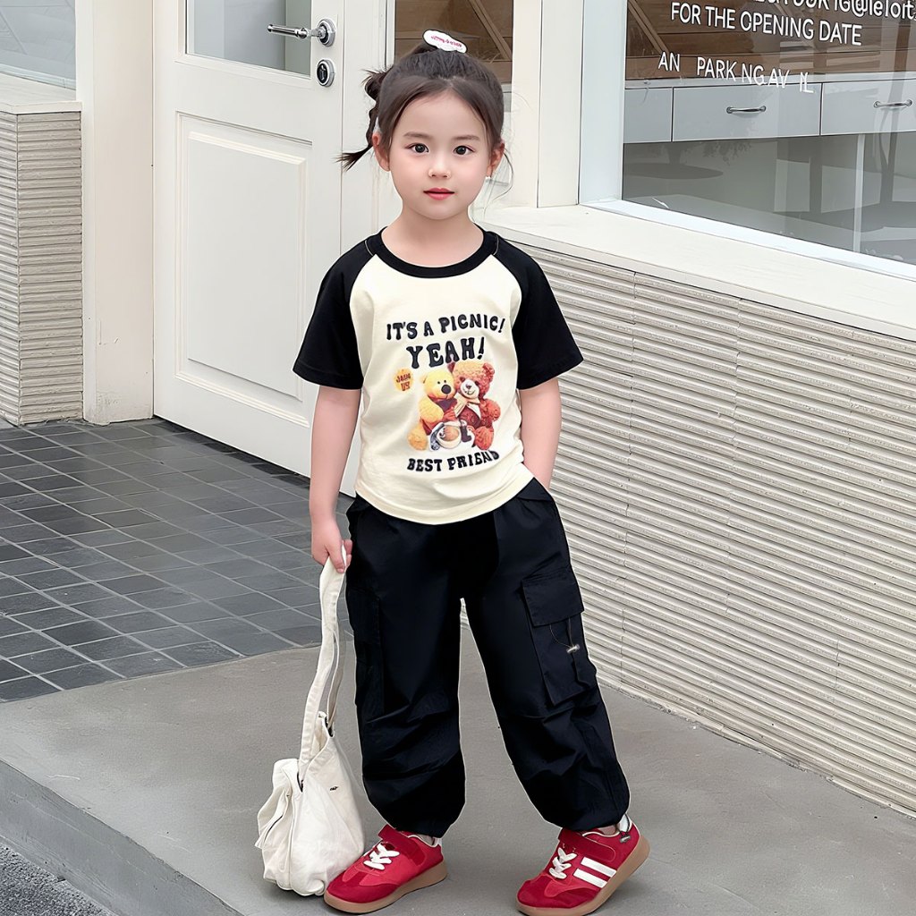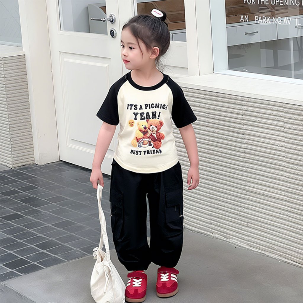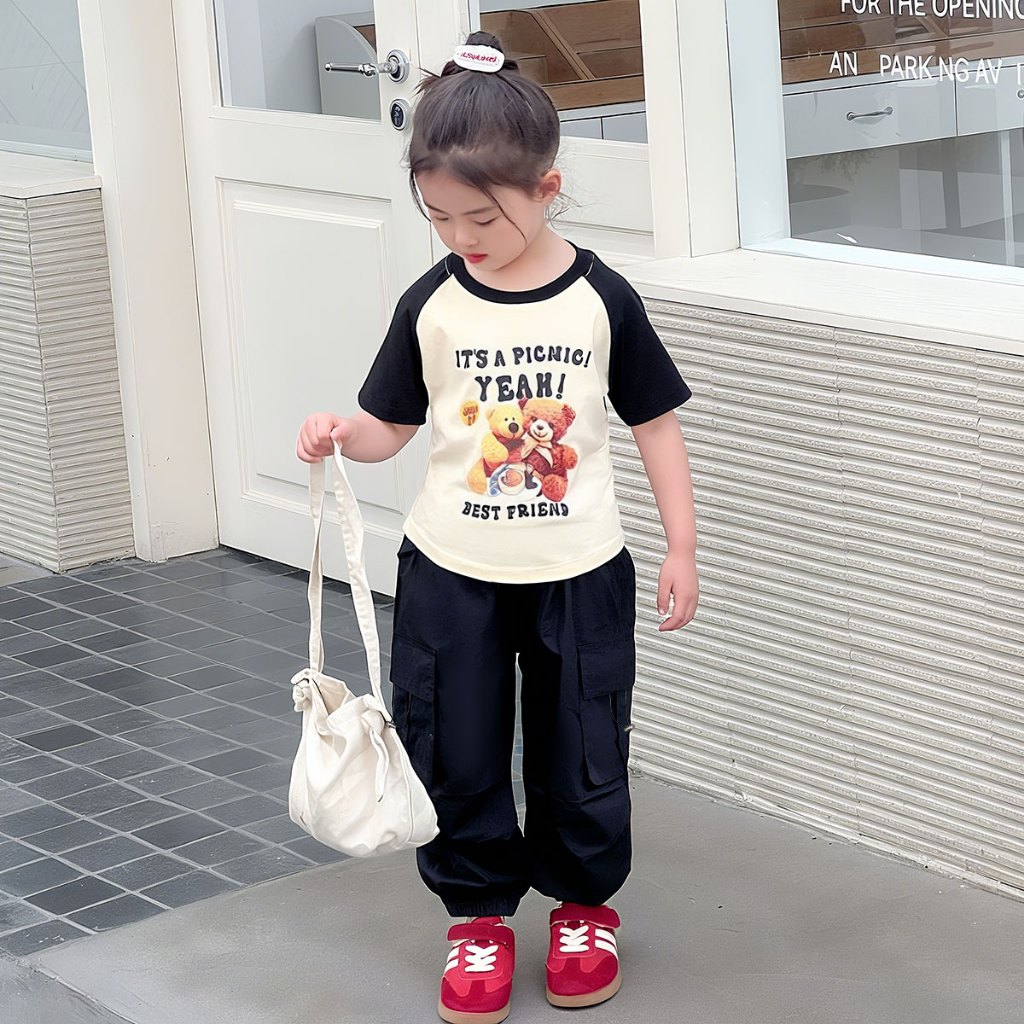honeywears⚡️พร้อมส่ง⚡️ชุดเด็กผู้หญิงแฟชั่น เสื้อยืดแขนสั้นน่ารัก+กางเกงคาร์โก้เด็ก ชุดฤดูร้อนลำลองสองชิ้น สไตล์เกาหลี ไซส์ 100-160