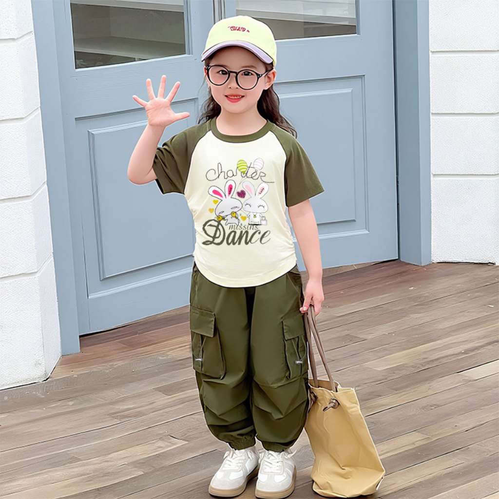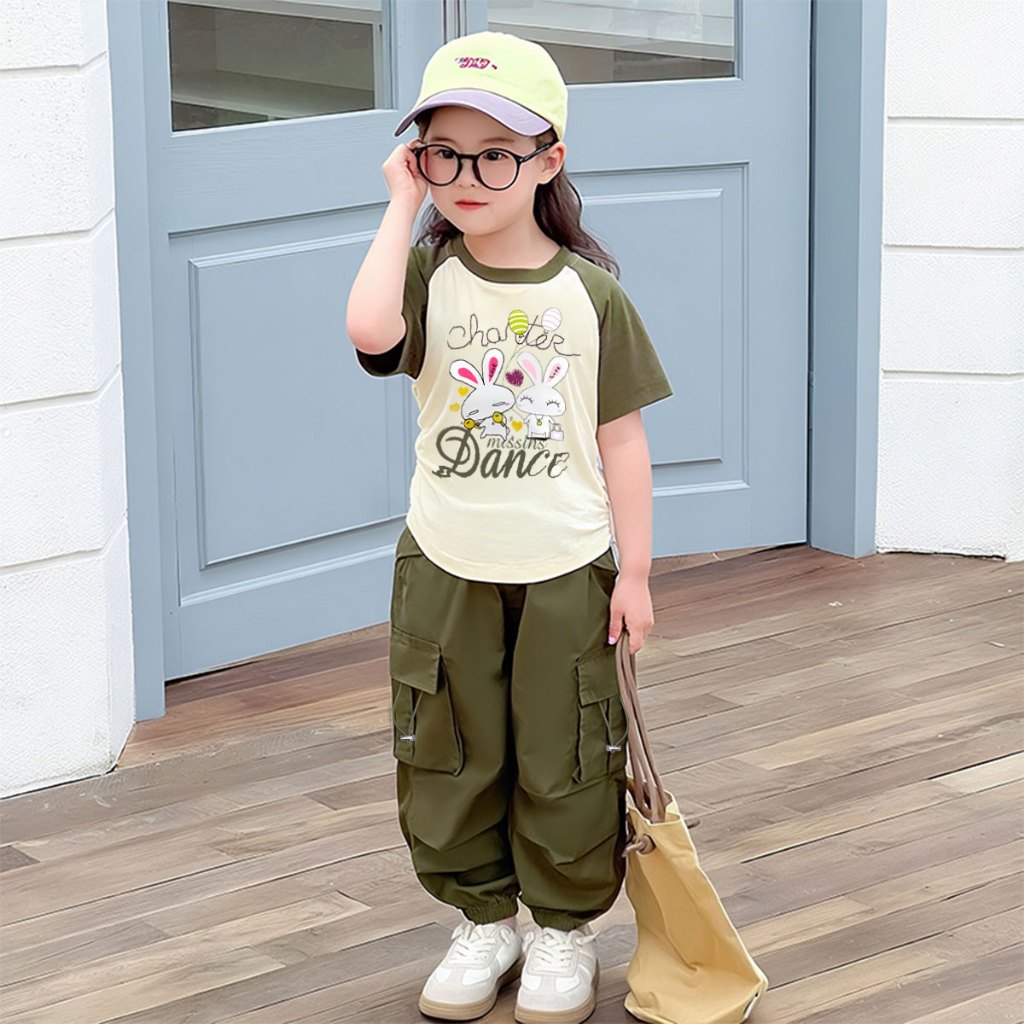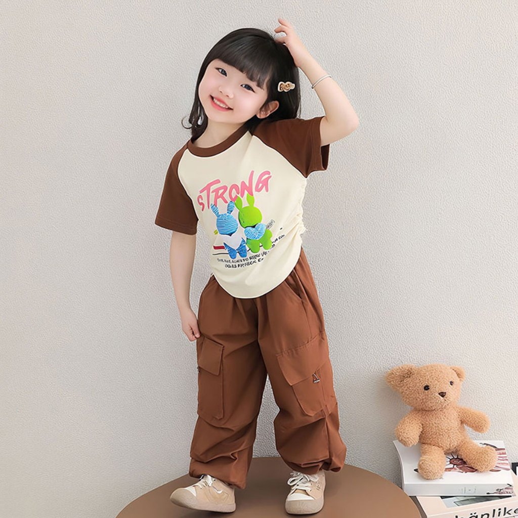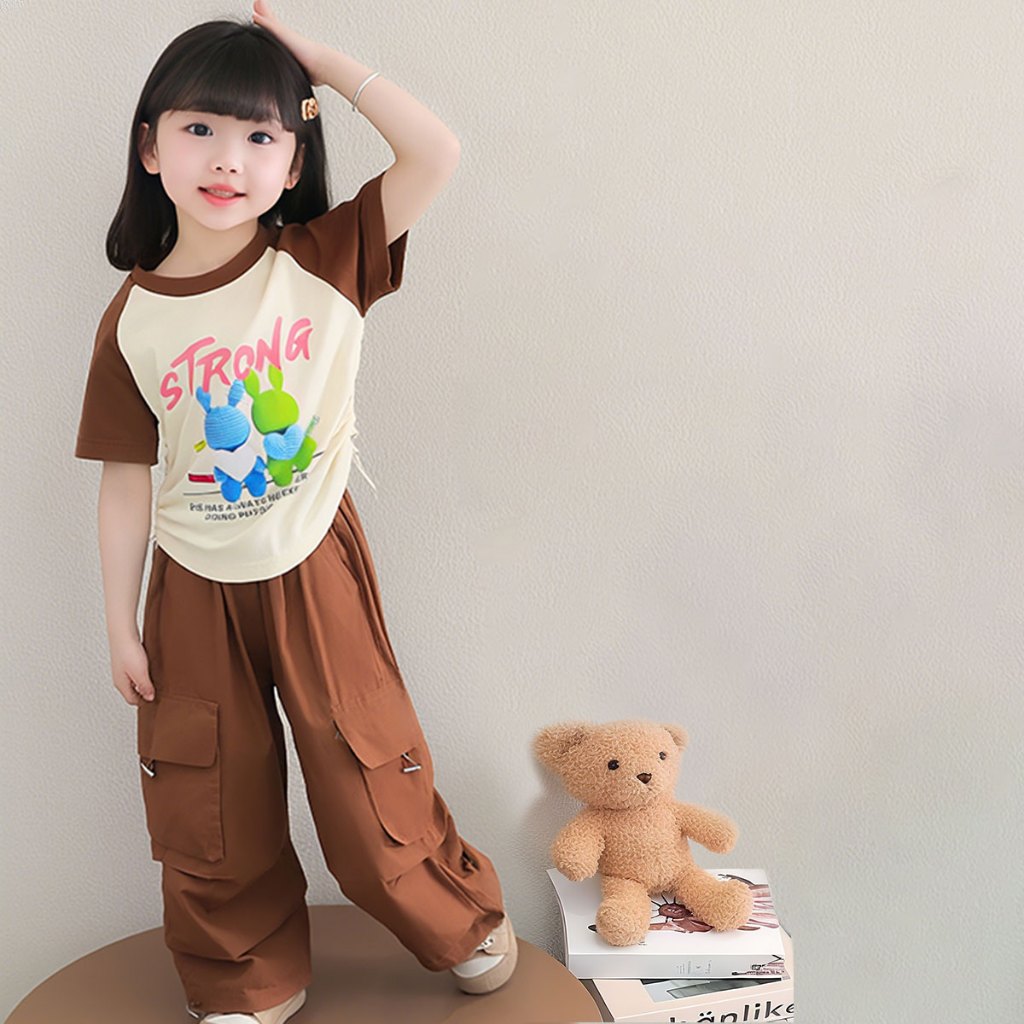 honeywears⚡️พร้อมส่ง⚡️ชุดเด็กผู้หญิงแฟชั่น เสื้อยืดแขนสั้นน่ารัก+กางเกงคาร์โก้เด็ก ชุดฤดูร้อนลำลองสองชิ้น สไตล์เกาหลี ไซส์ 100-160