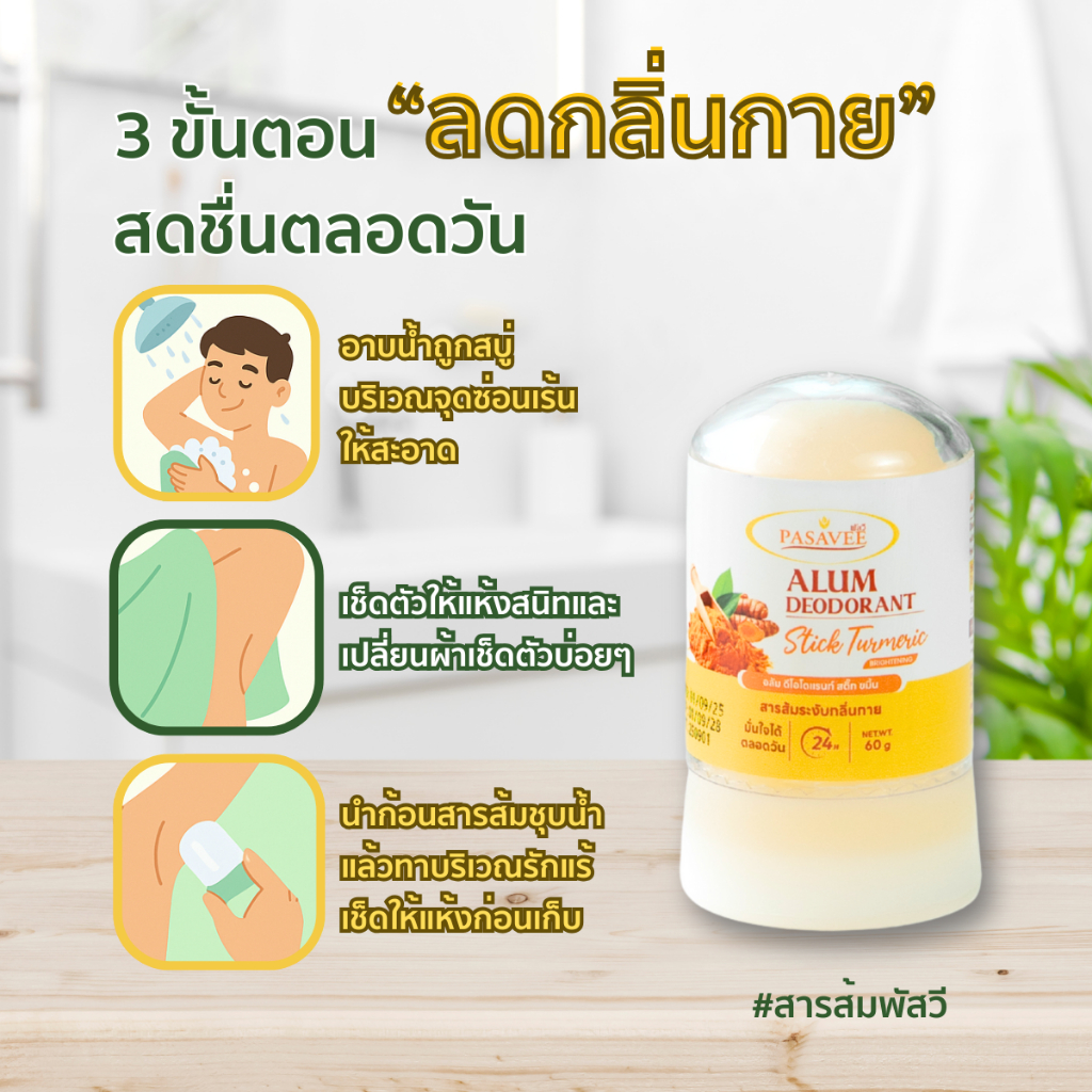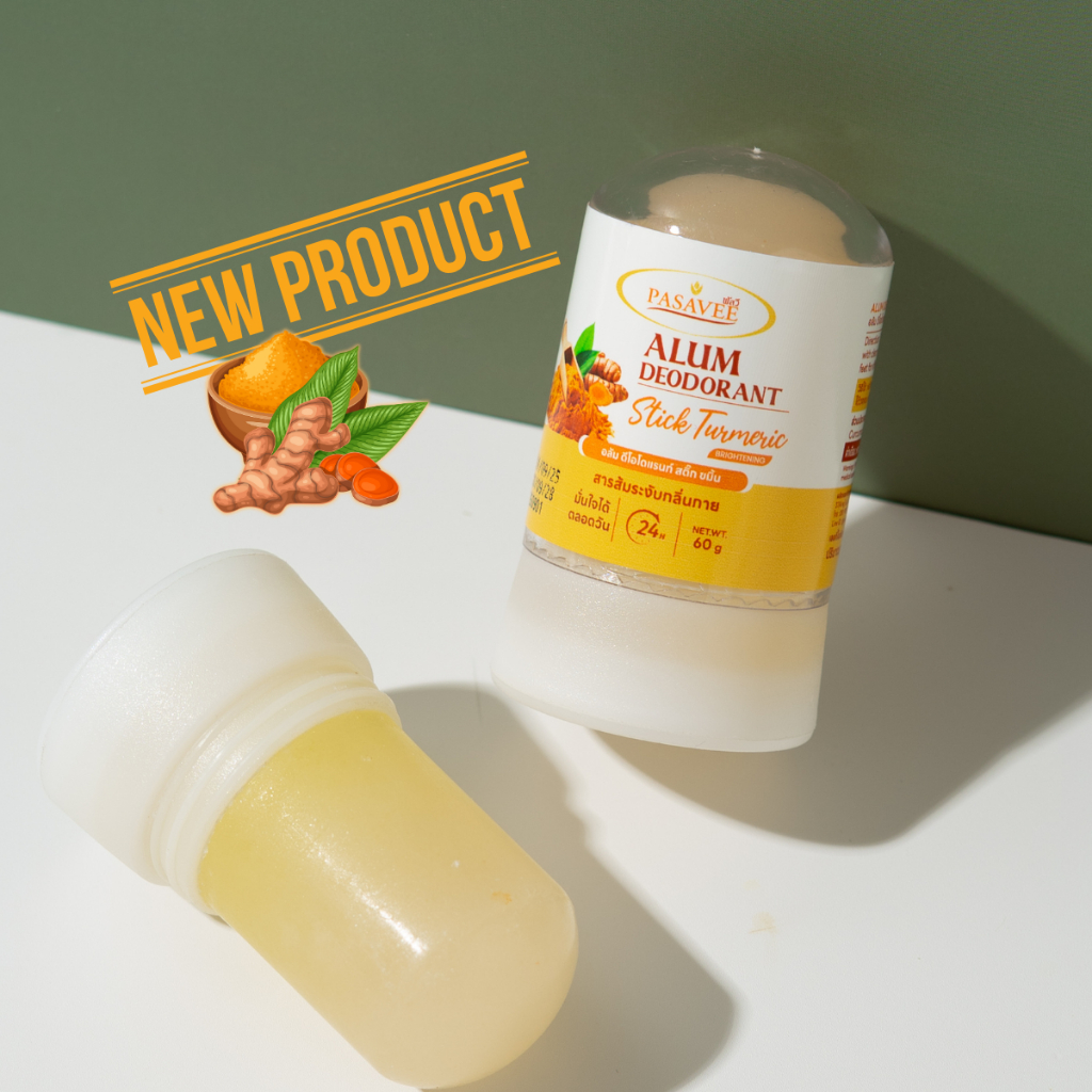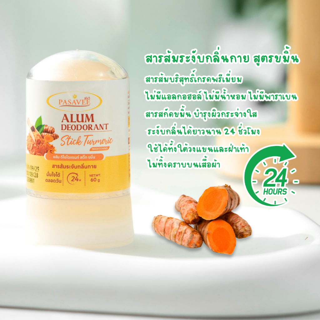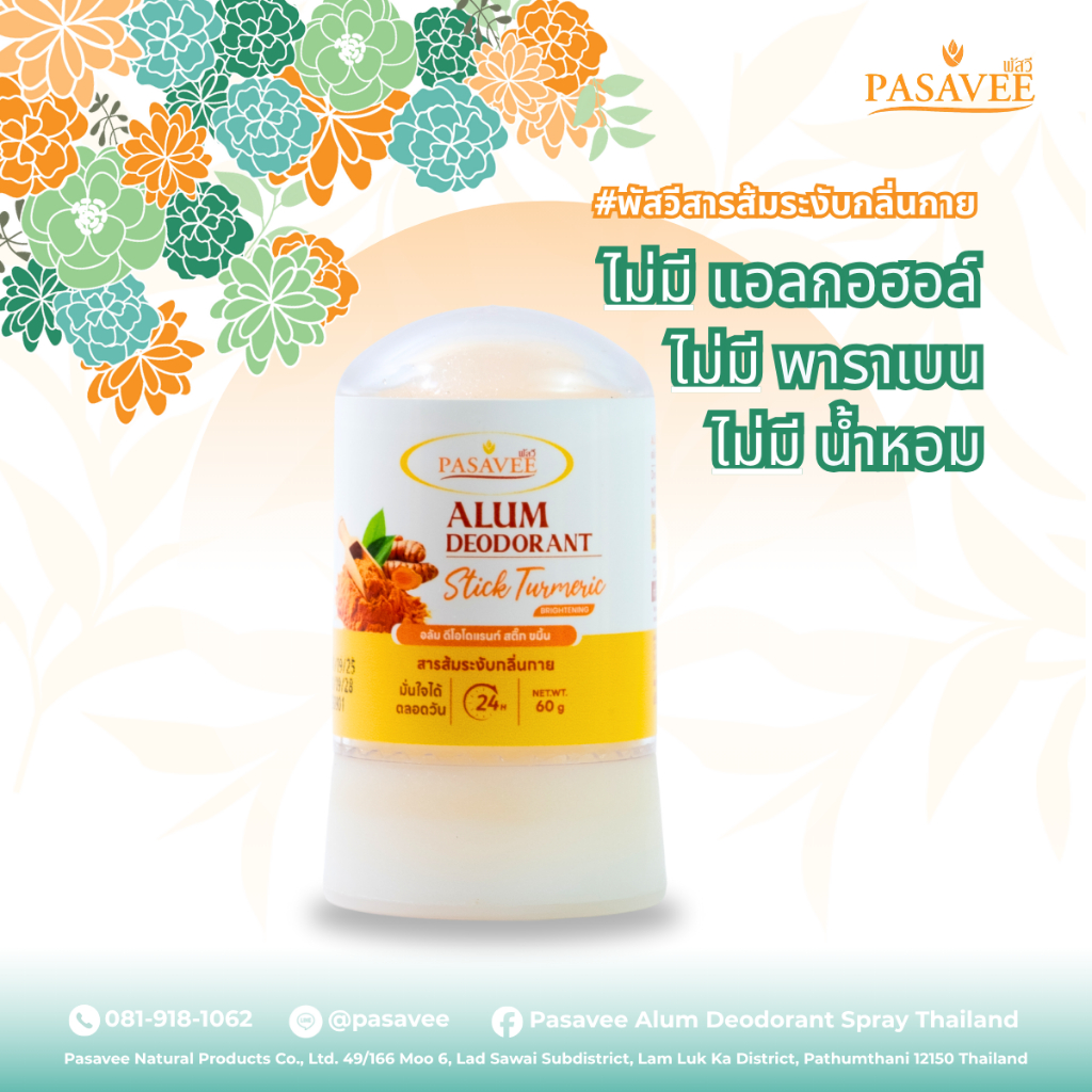 พัสวีสารส้มระงับกลิ่นกายแบบแท่ง 60 g สูตรขมิ้น ไบร์ทเทนนิ่ง Pasavee Alum Deodorant Stick Turmeric Brightening 60g.