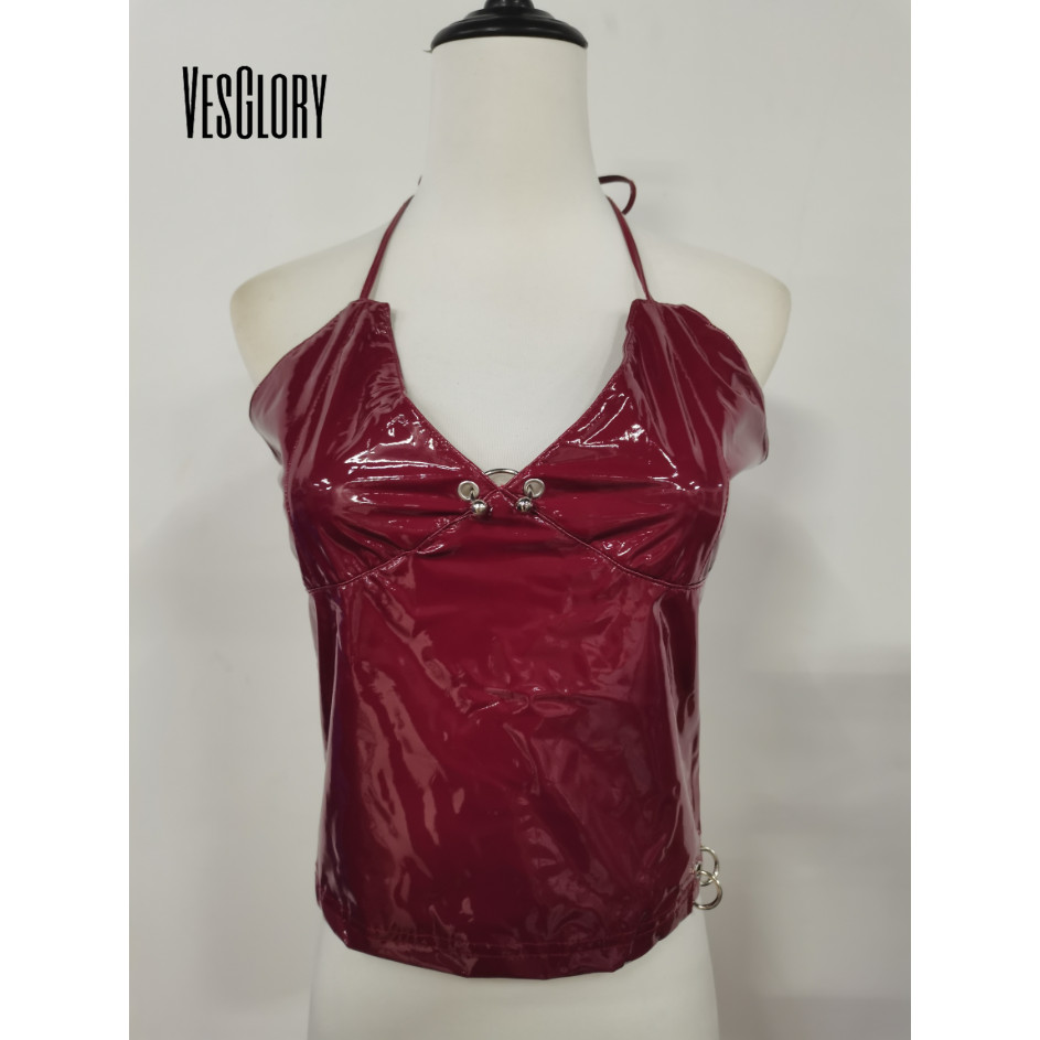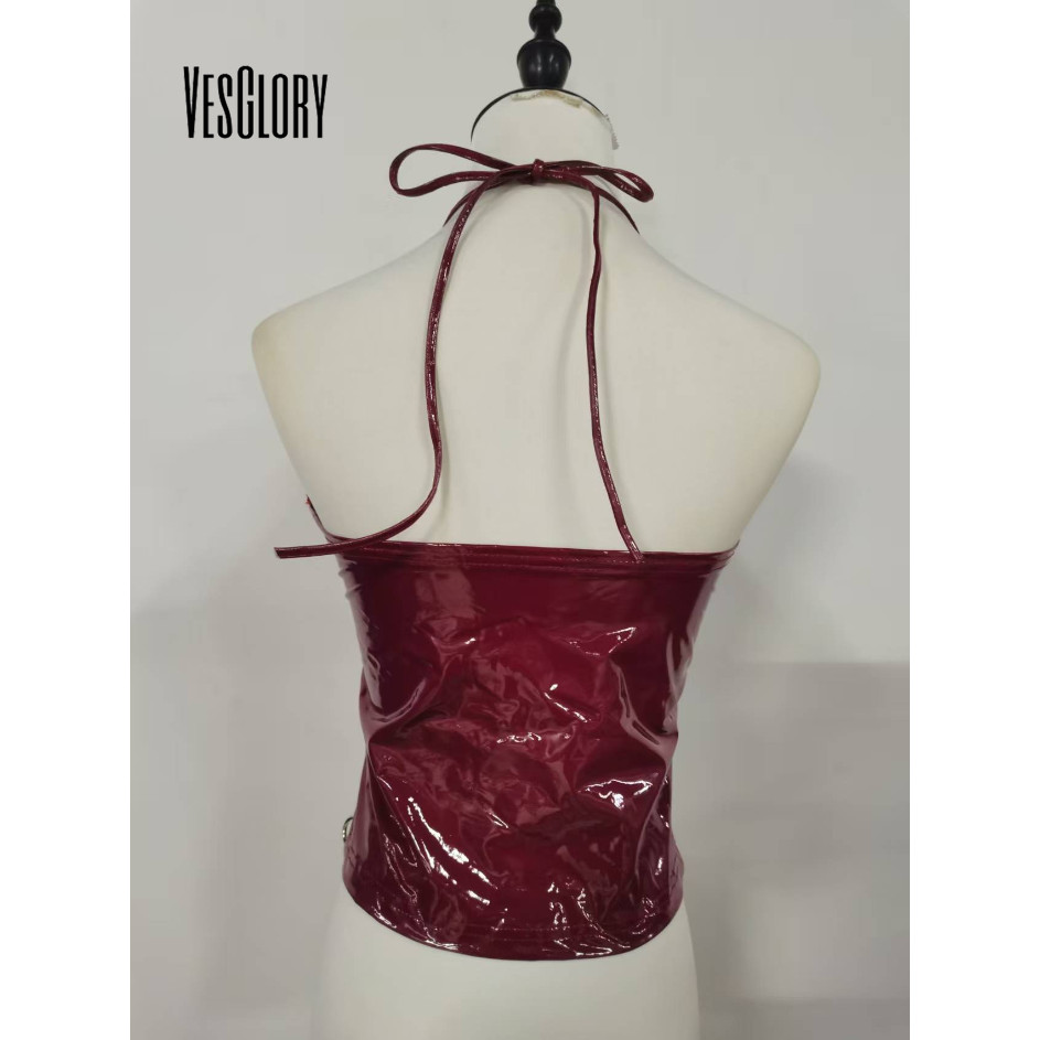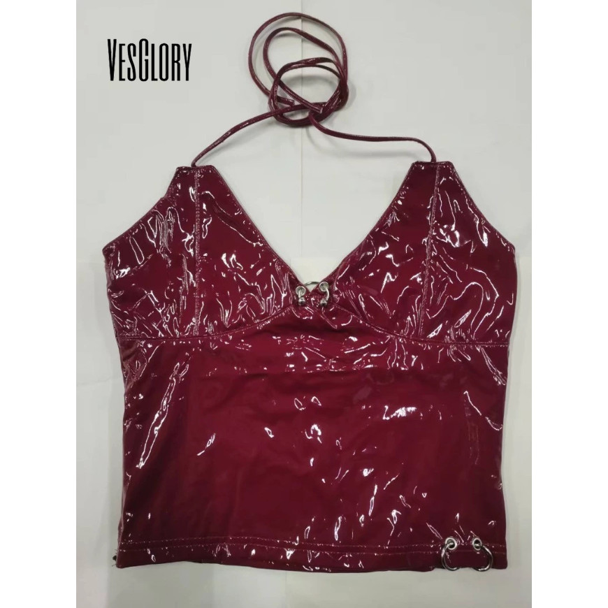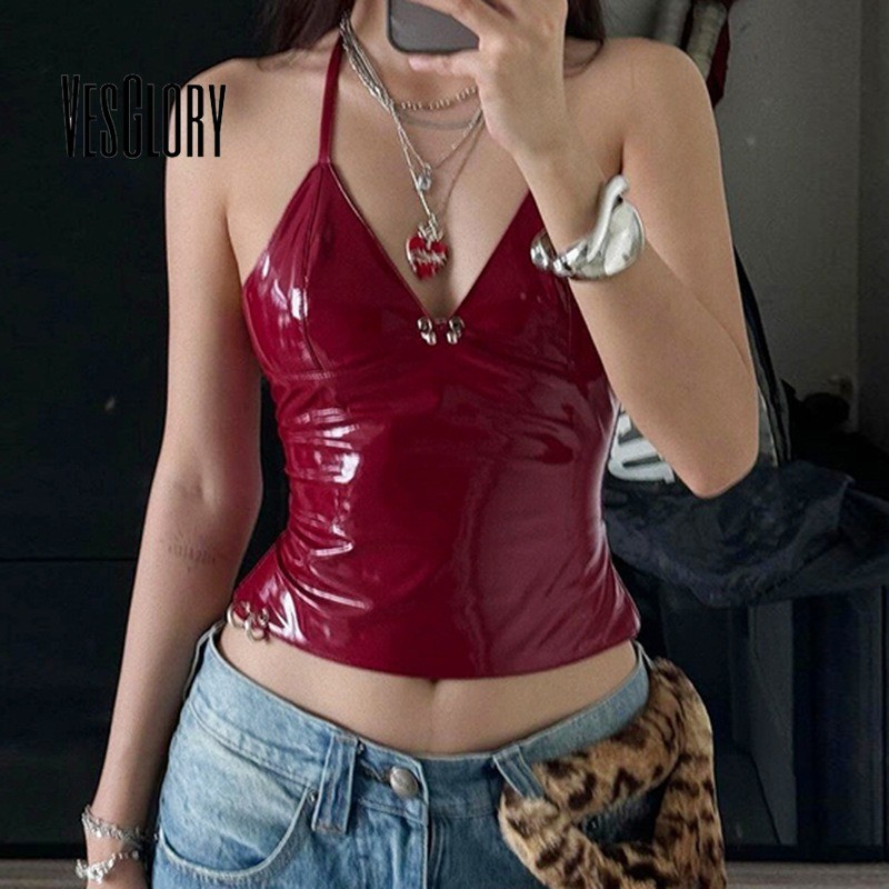VesGlory ผู้หญิง 2025 แฟชั่น Tanks Top V คอ Halter หัวเข็มขัดโลหะออกแบบหนังเซ็กซี่ Street สวมใส่ Club สไตล์