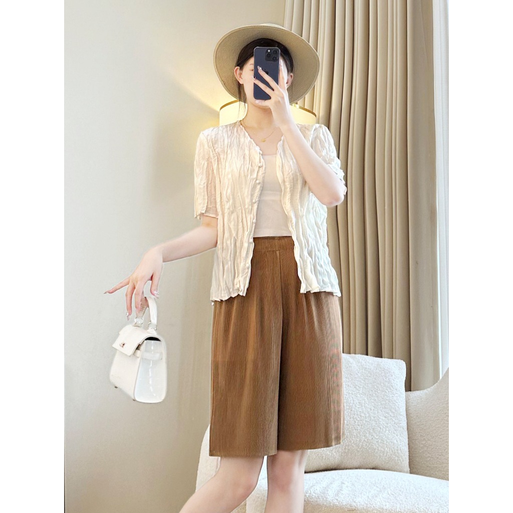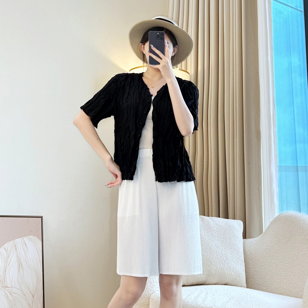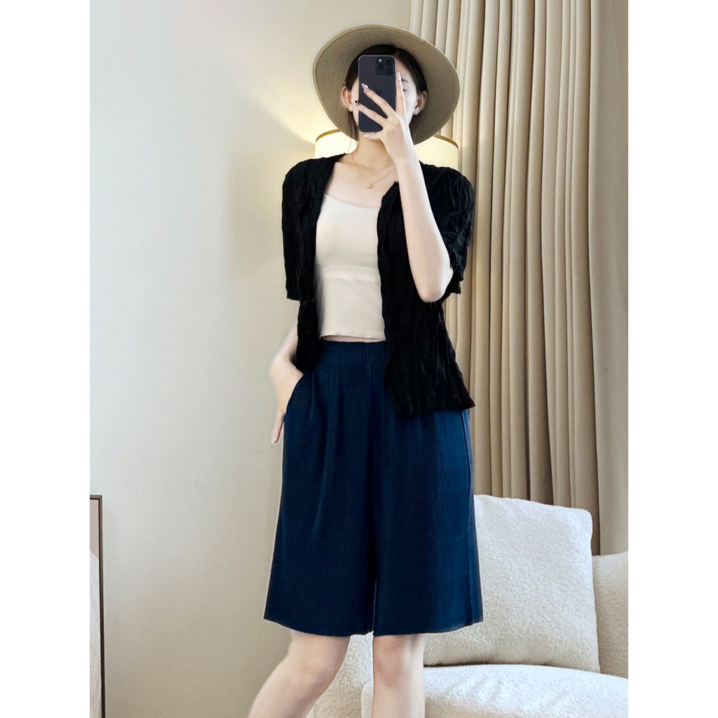 หยิบใส่ตะกร้าสไตล์ มิยาเกะ ถูก จํากัด การแก้ไข จีบญี่ปุ่นอาจสายหลักความรู้สึกการออกแบบที่ดีเยี่ยมจริงหมึกแสงเงาคนต่างด้าวแจ็คเก็ตมิยาเกะสไตล์กระโปรงกางเกงขาสั้นผู้หญิงจีบกางเกงฤดูร้อน ผอมลง ดูห้าจุดกางเกงตรงหลวมกางเ