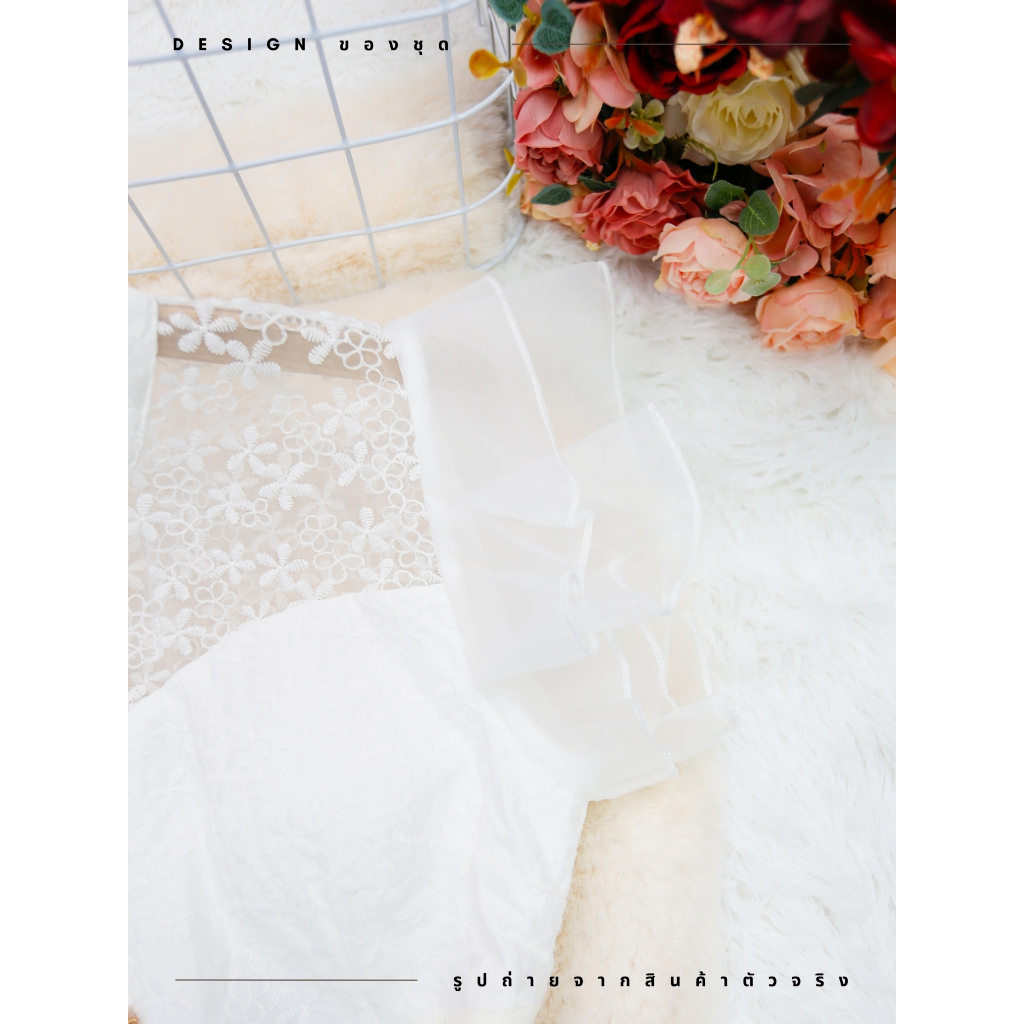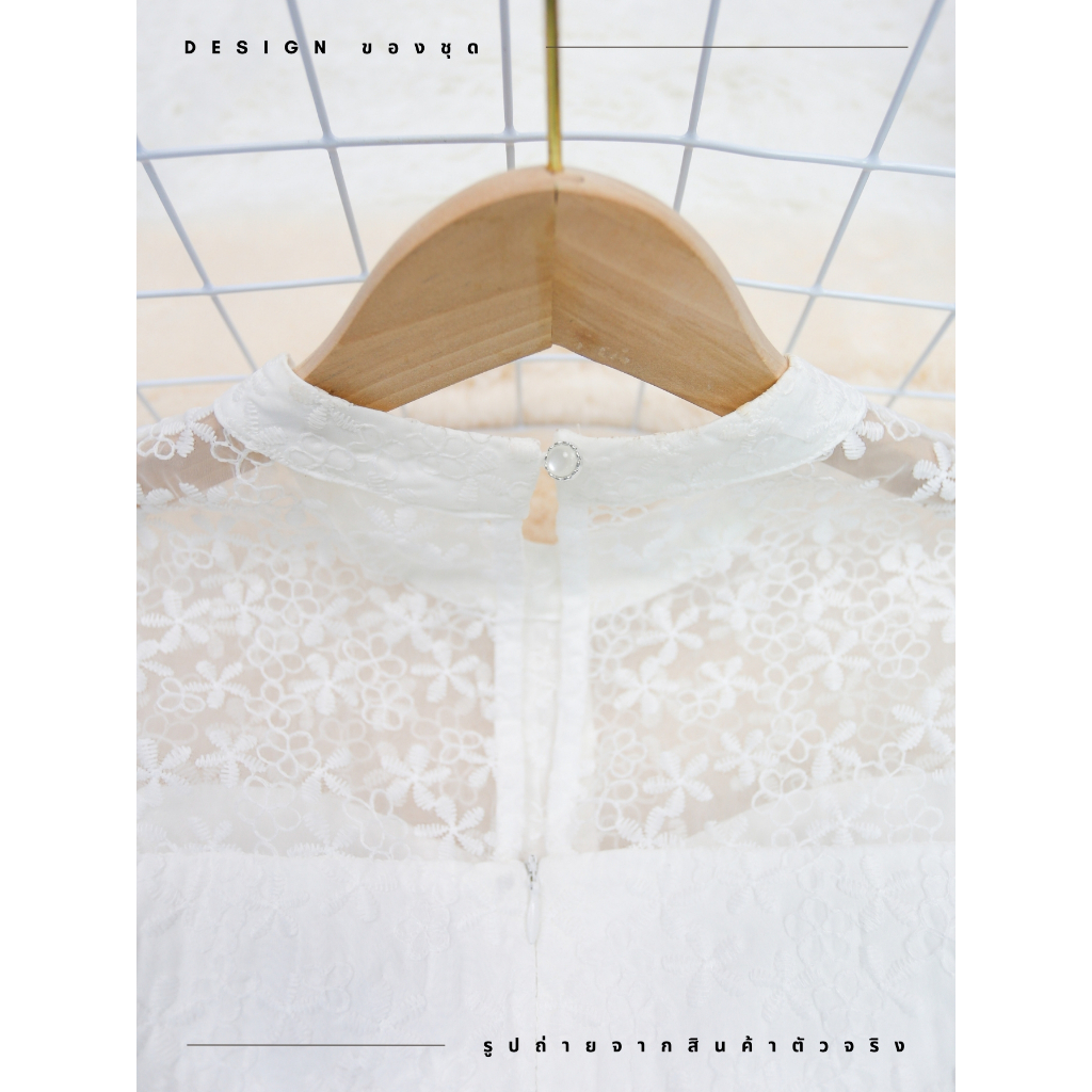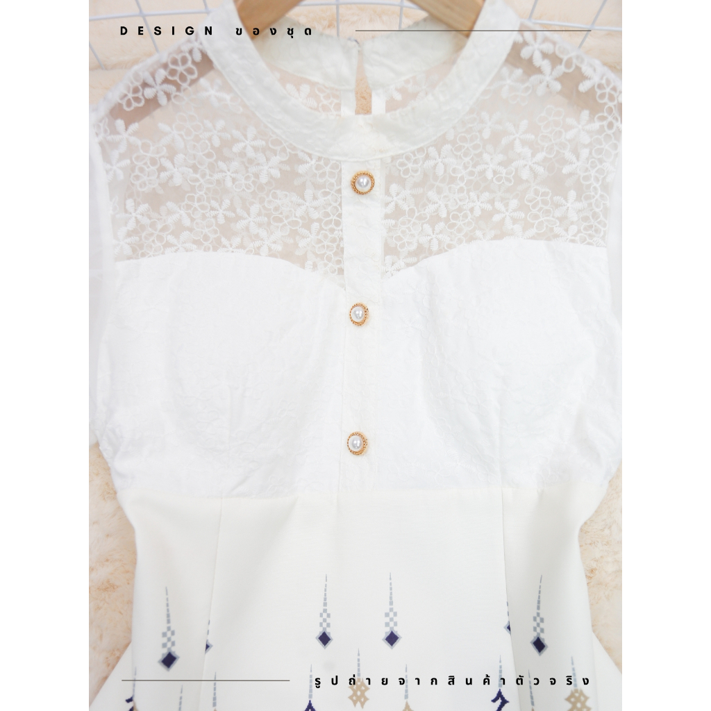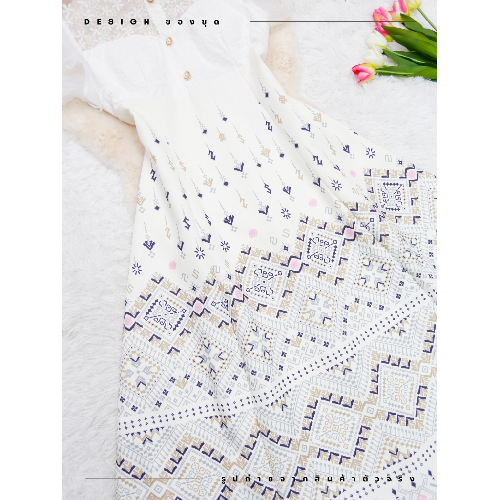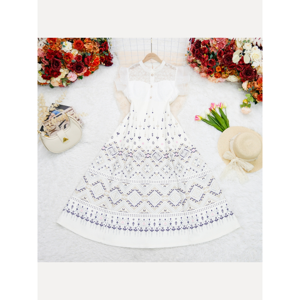 ชุดเดรสพิมพ์ลาย,ชุดเดรสยาว สีขาว ซิปซ่อนด้านหลัง ซับในทั้งตัว ผ้าโพลีเอสเตอร์พิมพ์ลาย