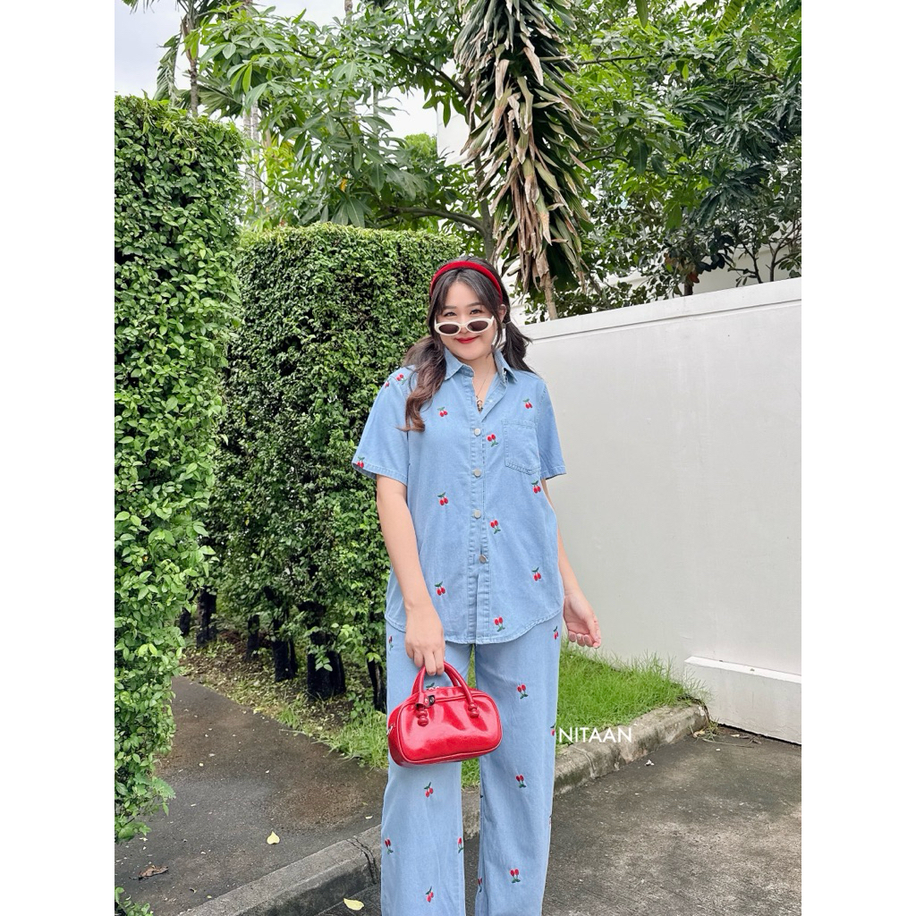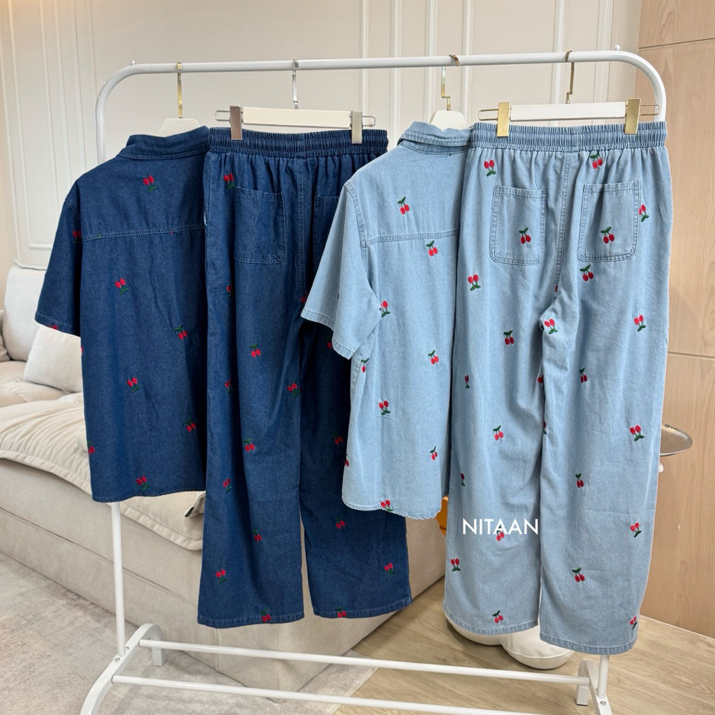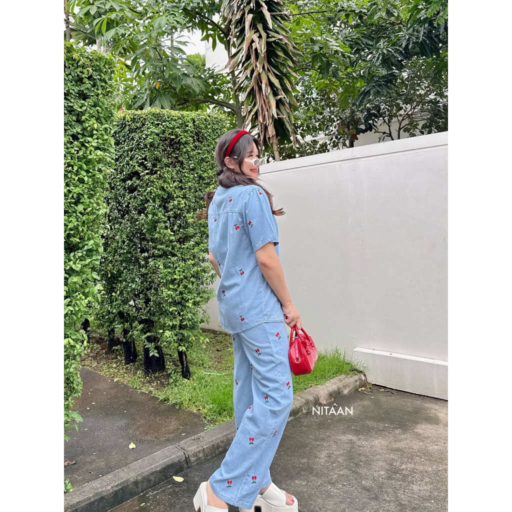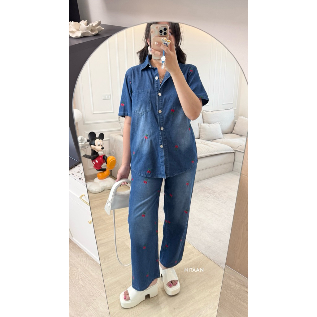 NITAAN เซ็ตยีนส์ขายาว ผ้าปักเชอรี่ กรี้ดมันออกมา จึ้งมากกทุกคน เสื้อยาวปิดสะโพก 🍒 (690.ดีงามมม)