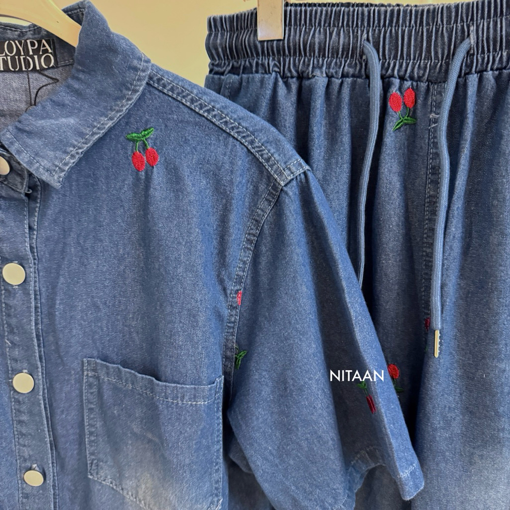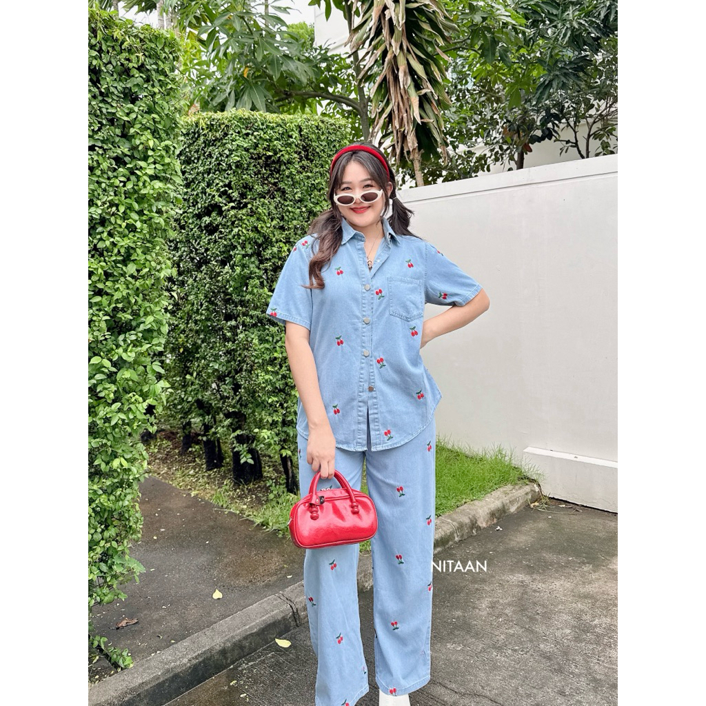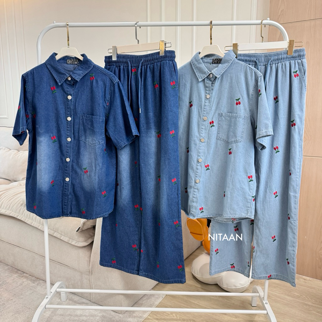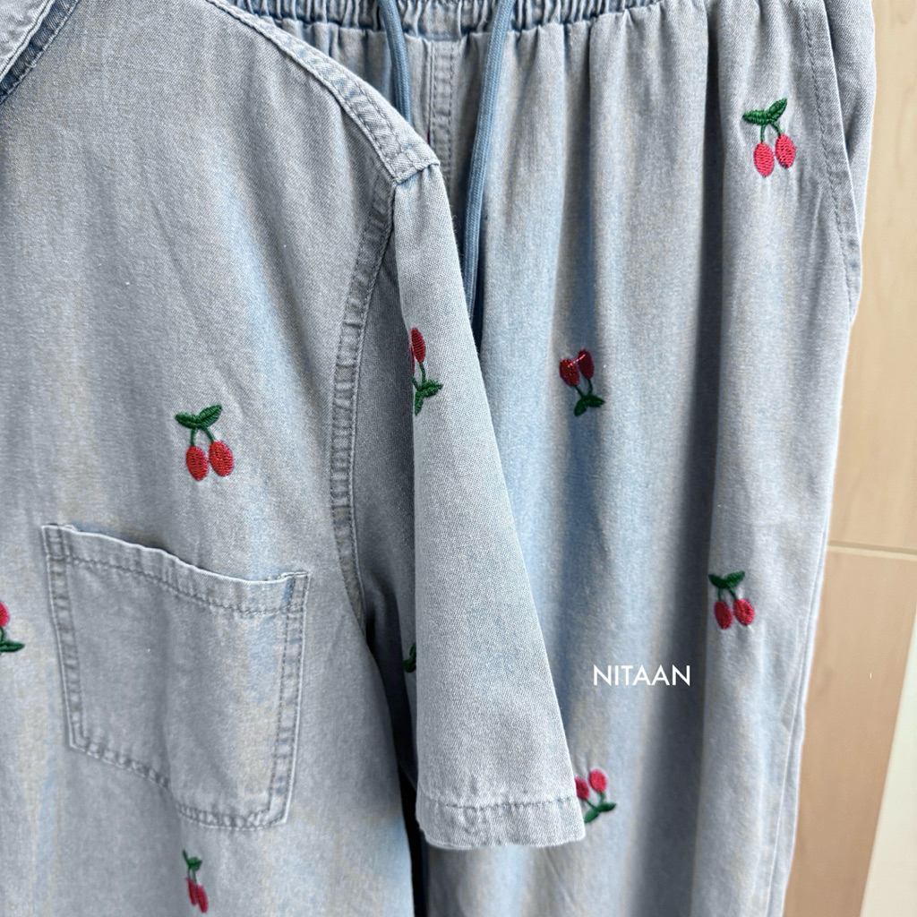 NITAAN เซ็ตยีนส์ขายาว ผ้าปักเชอรี่ กรี้ดมันออกมา จึ้งมากกทุกคน เสื้อยาวปิดสะโพก 🍒 (690.ดีงามมม)