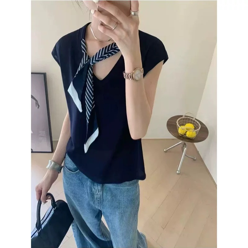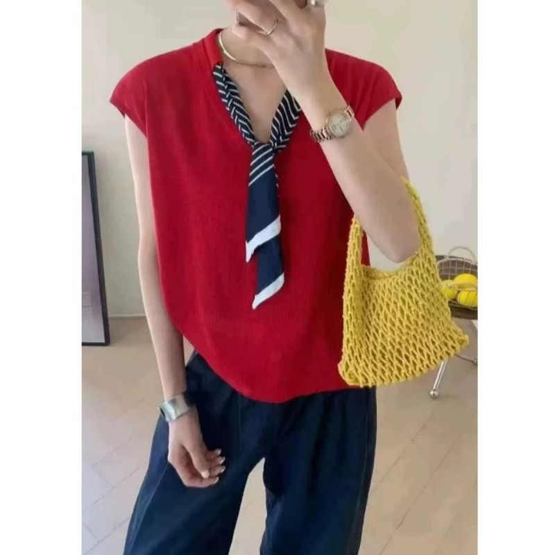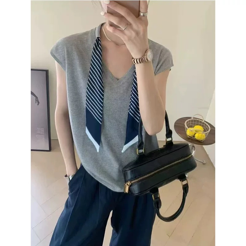 Balamy วันนี้ยอดนิยมลายผ้าพันคอผ้าไหม Streamer v คอถักเสื้อกั๊กฤดูร้อนผู้หญิงลดอายุการออกแบบความรู้สึก Preppy