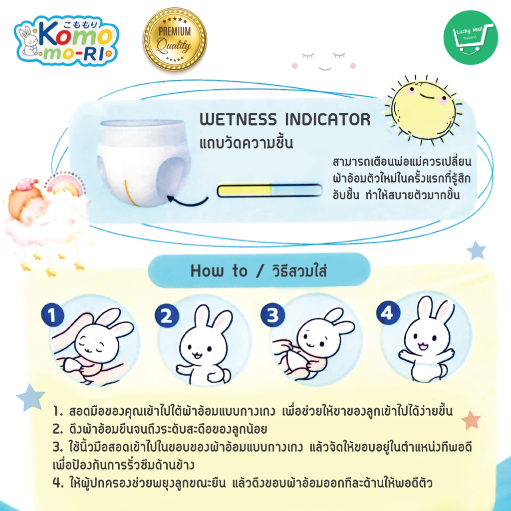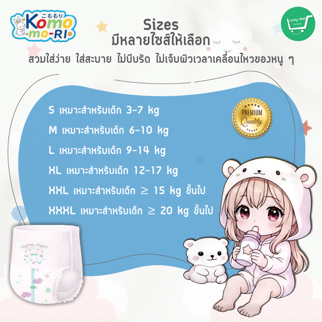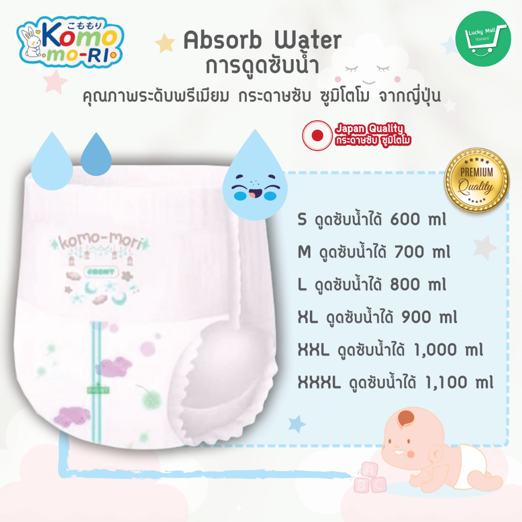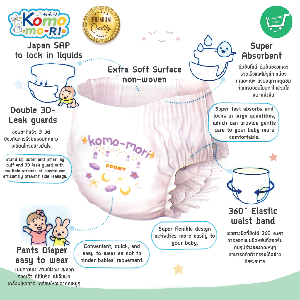 Komo-mori Premium กางเกงผ้าอ้อม มอบการปกป้องลูกน้อยให้สบายตัวด้วยขอบขาและขอบเอวกระชับสรีระ