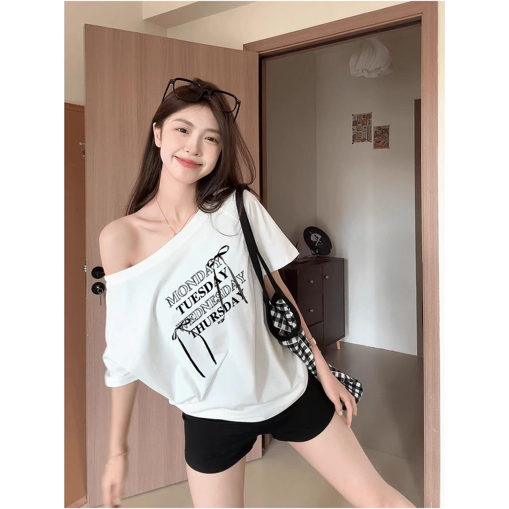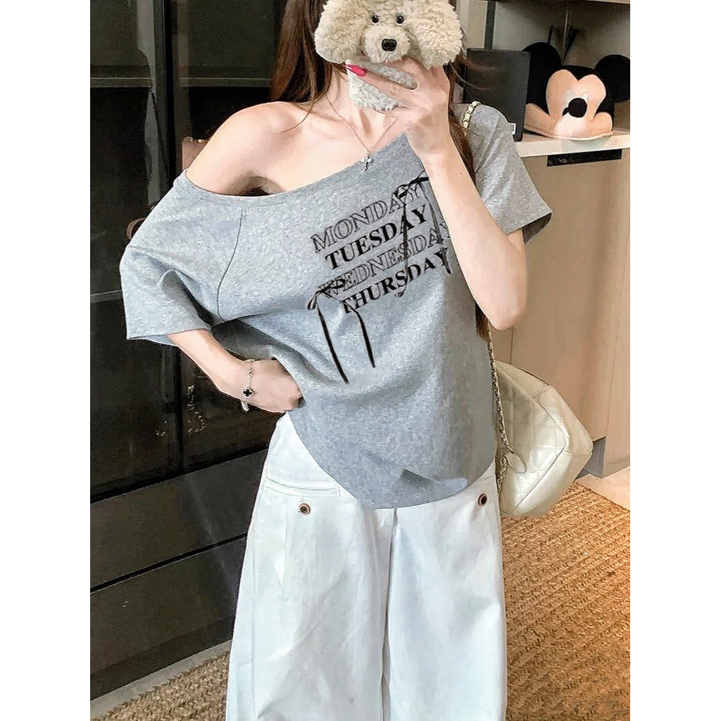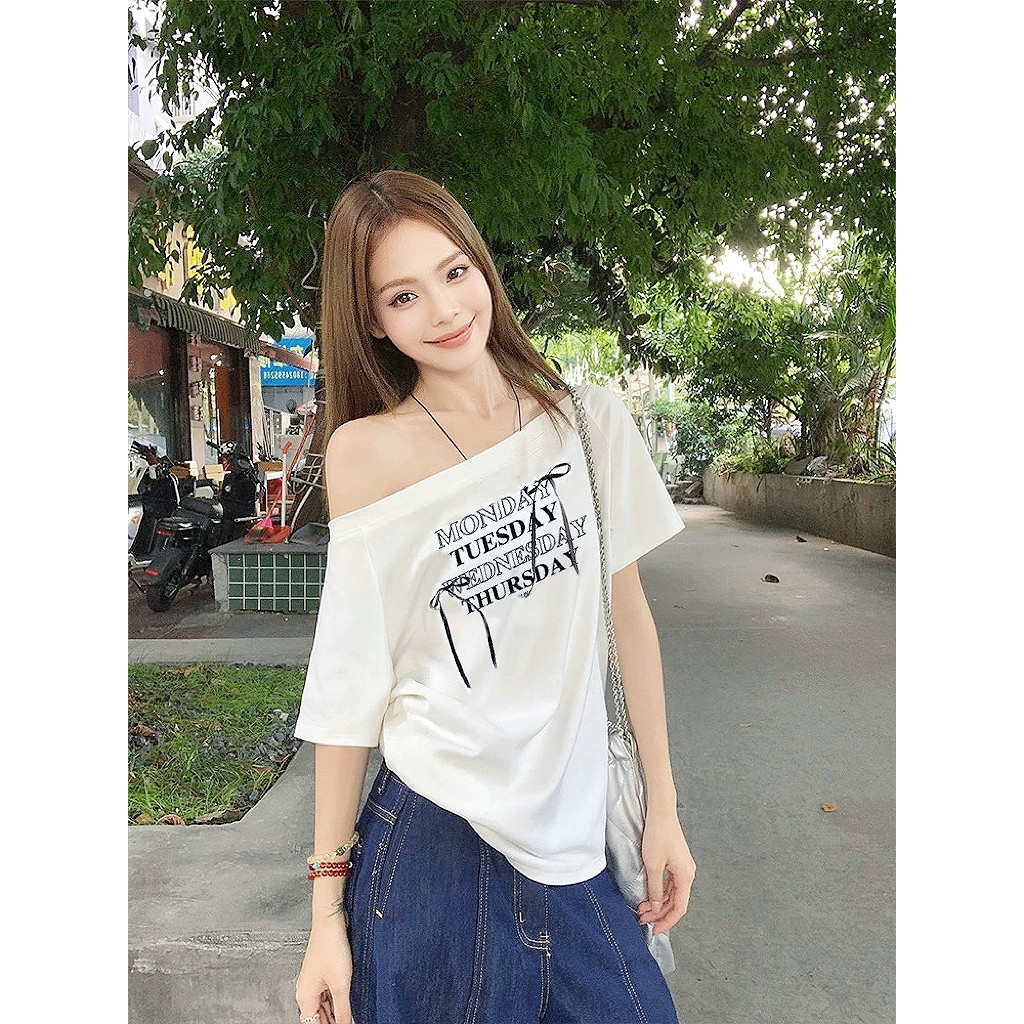 UMISO เสื้อปาดไหล่ เสื้อยืดผู้หญิง ทรงหลวม เข้ากับทุกสไตล์ได้ โบว์ พิมพ์ลาย มีสีให้เลือกมากมาย