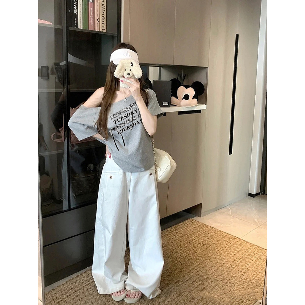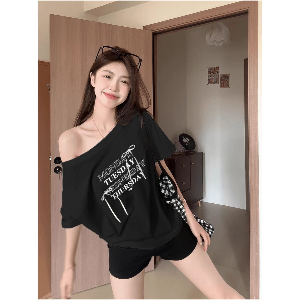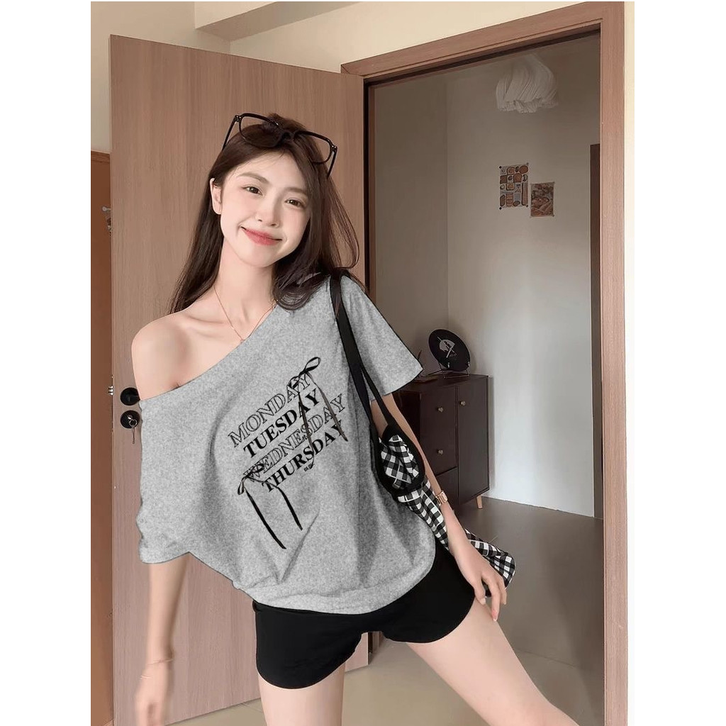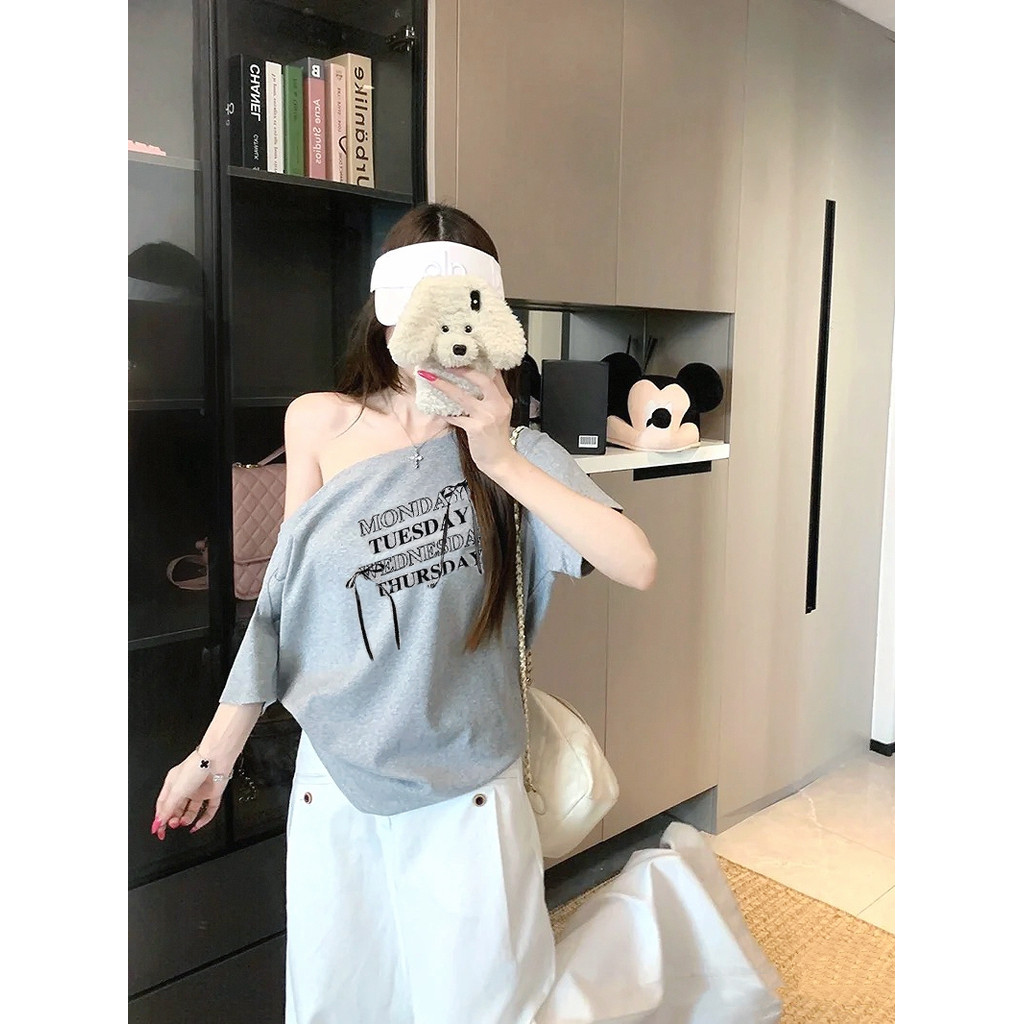 UMISO เสื้อปาดไหล่ เสื้อยืดผู้หญิง ทรงหลวม เข้ากับทุกสไตล์ได้ โบว์ พิมพ์ลาย มีสีให้เลือกมากมาย