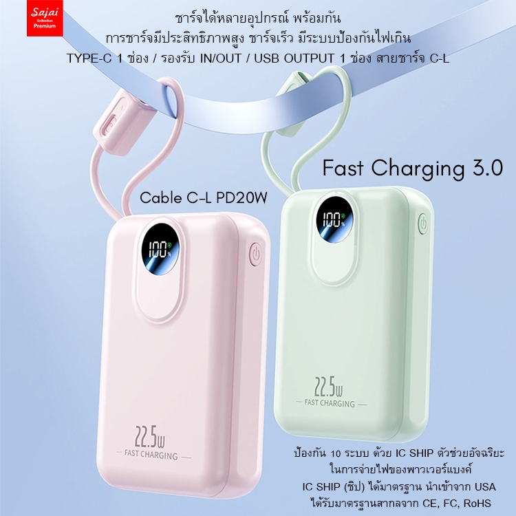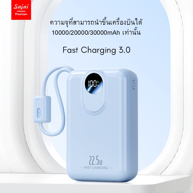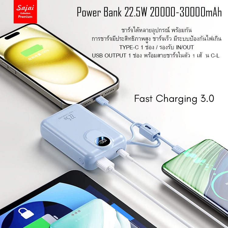 ประกัน1ปี SAJAI สะใจ MG30 30000mAh(ฟรีซองกันน้ำ)PD22.5W มีสายชาร์จในตัว2สายรองรับ15/16 PD20 แบตสำรอง