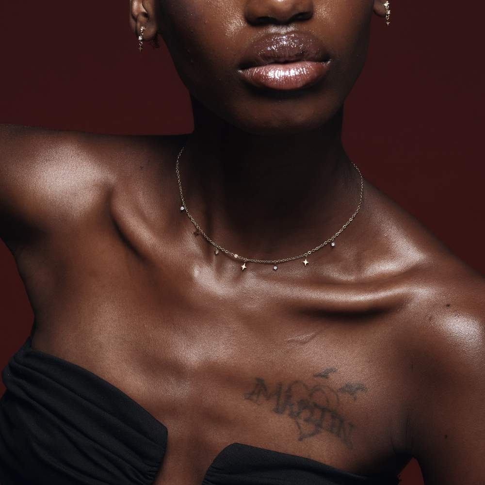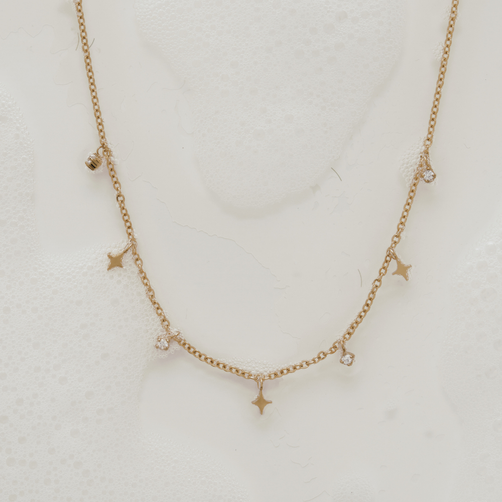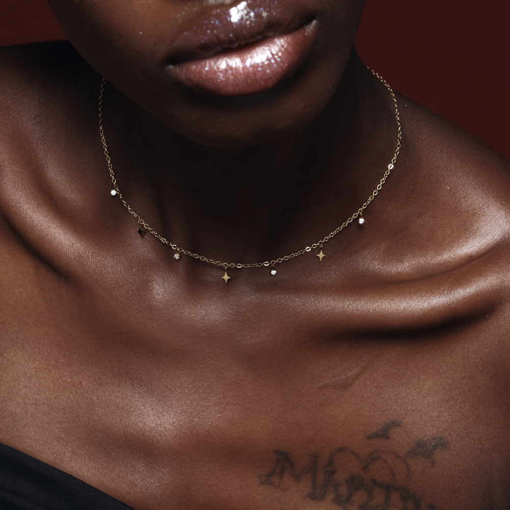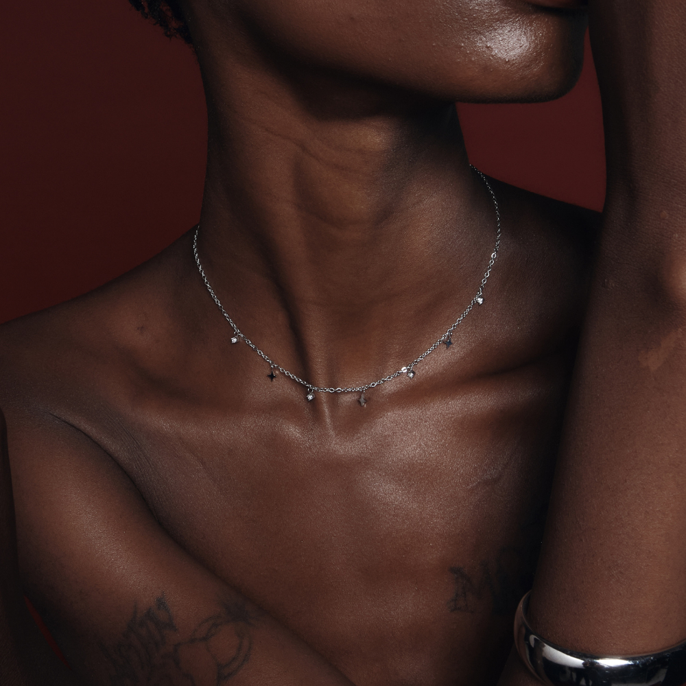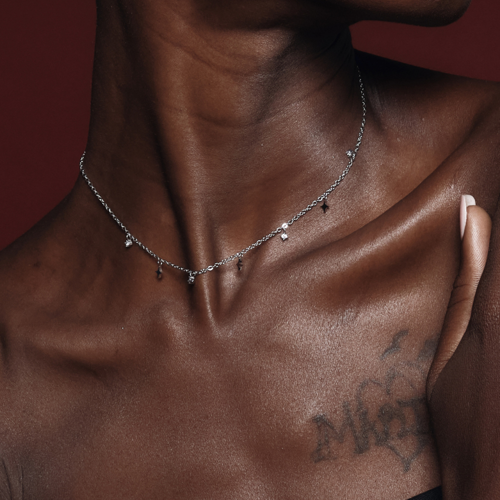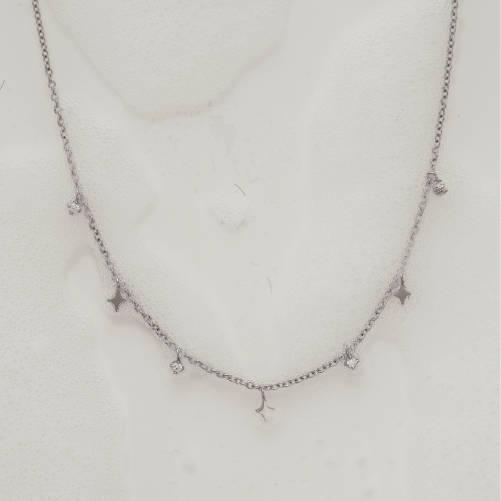 สร้อยคอโชคเกอร์มาพร้อมจี้ดาวสี่แฉกสลับกับพลอยสีขาว รุ่นนี้น่ารักมากๆค่ะ ตัวจี้มีขนาดกำลังพอดี ใส่ขึ้นคอแล้วจะดูวิ้งค์มาก สามารถสวมใส่ไปออกงานหรือวันธรรมดาก็ไม่