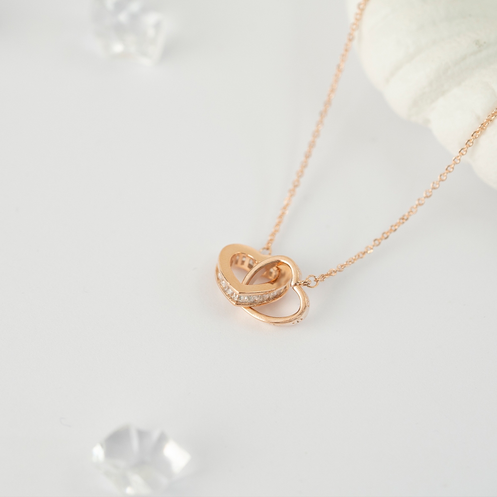 รายละเอียดสินค้า : สร้อยคอดีไซน์หัวใจคล้องกัน ดวงหนึ่งเรียบหรู อีกหนึ่งดวงประดับเพชรCZ ใส่ได้หลายโอกาส ทั้งไปเรียน เที่ยว หรือเป็นของขวัญ