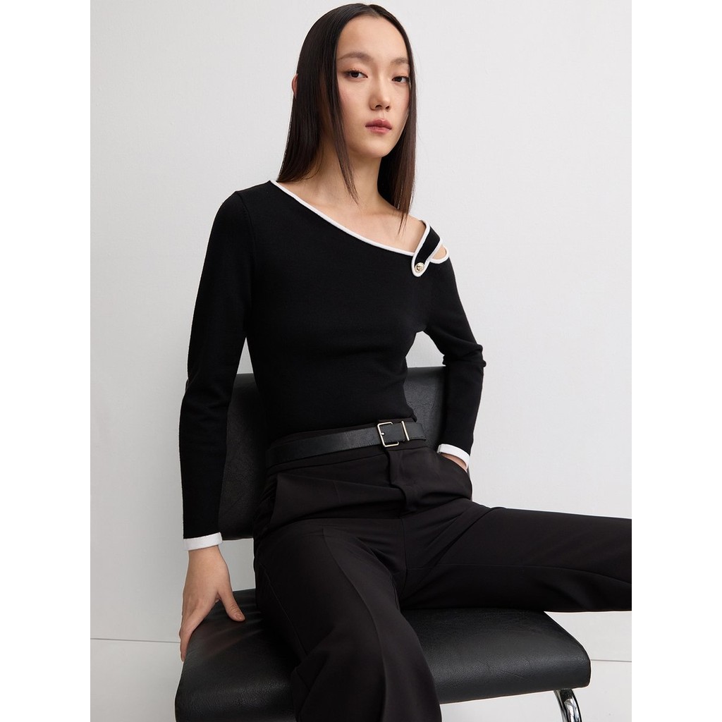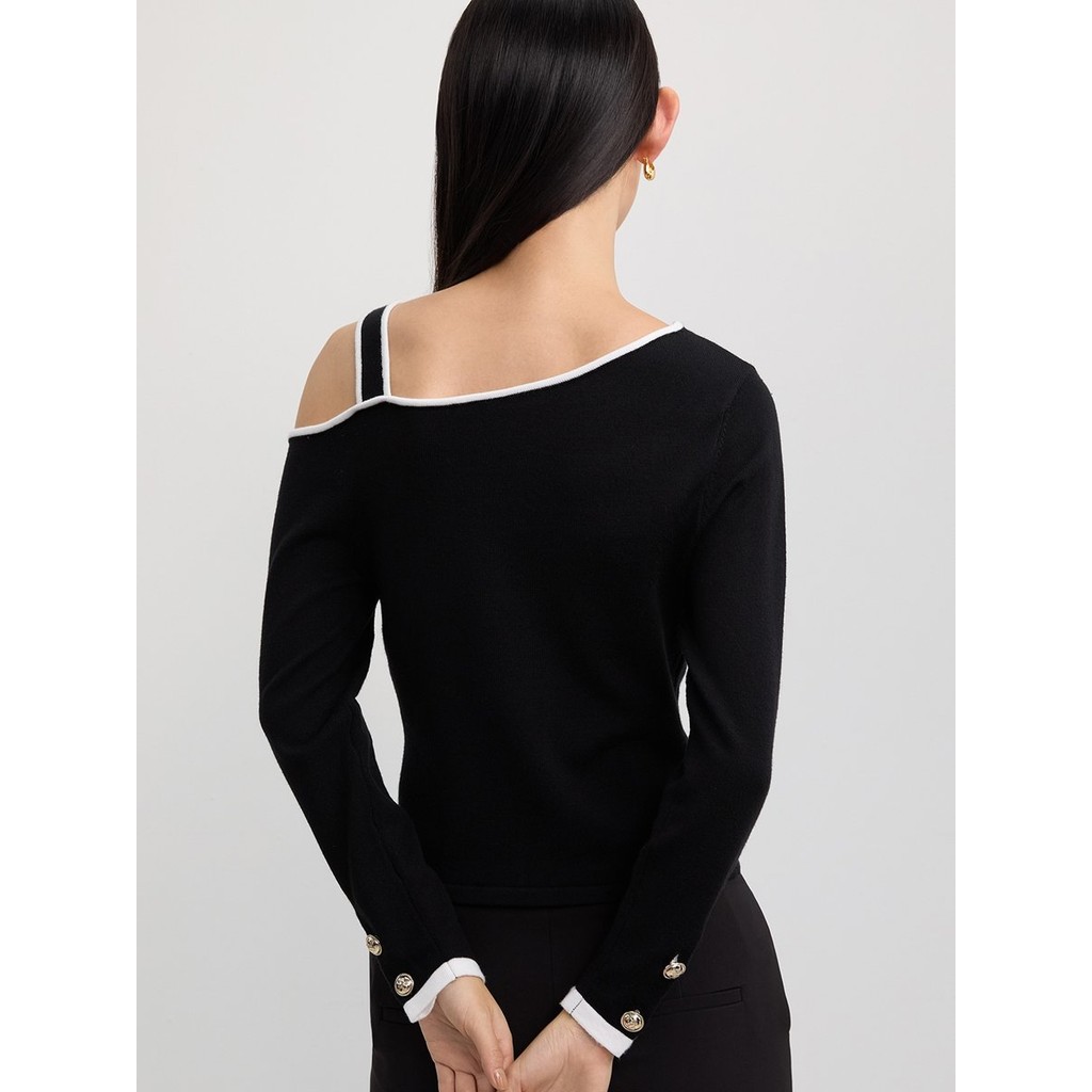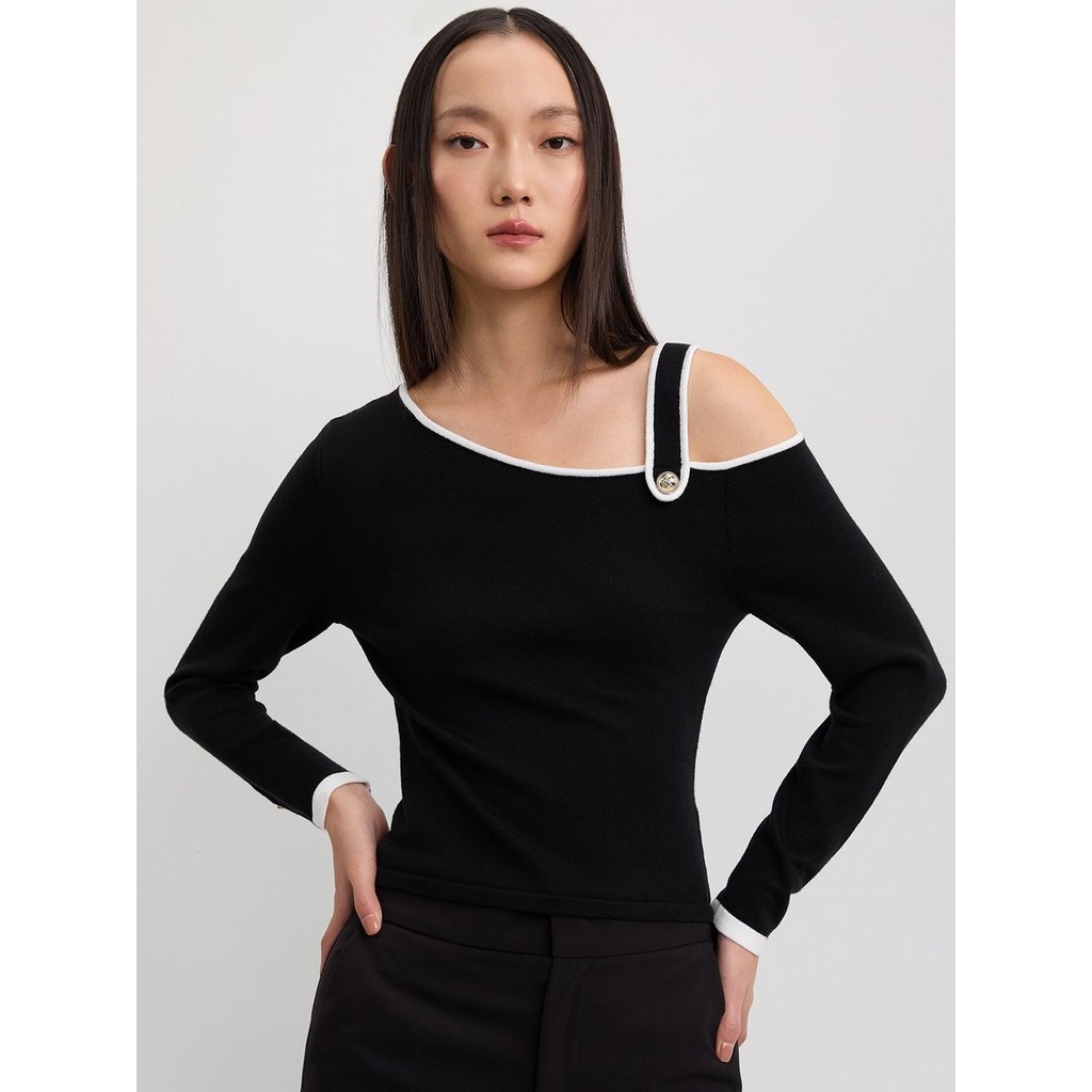 [Pomelo] เสื้อไหมพรมปิดไหล่ข้างเดียวแต่งสาย / One-Shoulder Contrast-Trim Knit Top with Strap