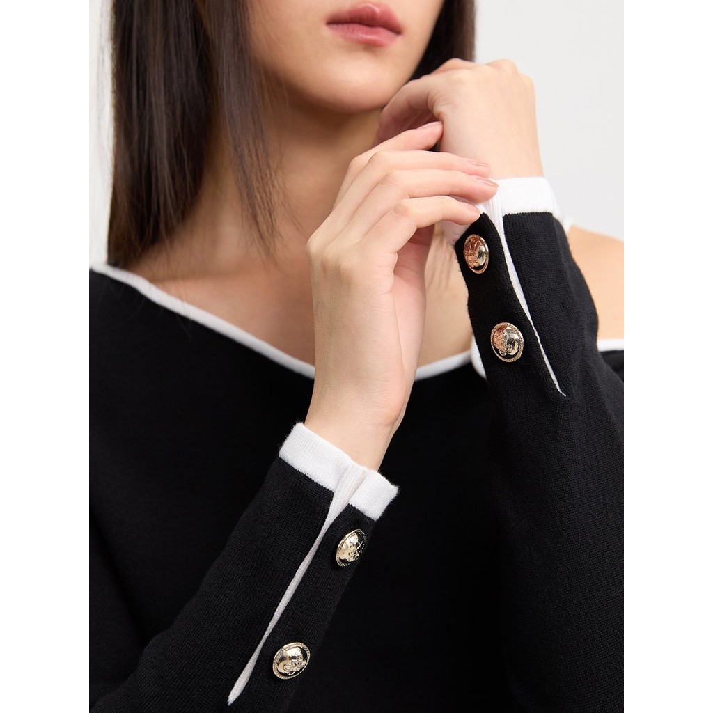 Elevate your style with our chic black knitted top. Featuring an off-shoulder design, unique button accents, and contrasting trim, it perfectly blends sophistication with a modern edge. Ideal for any occasion!