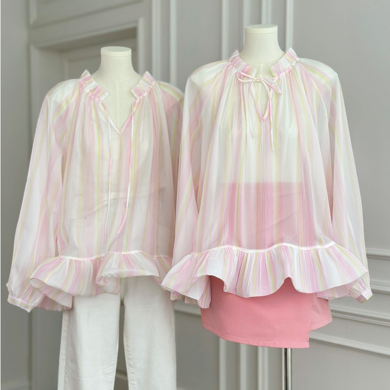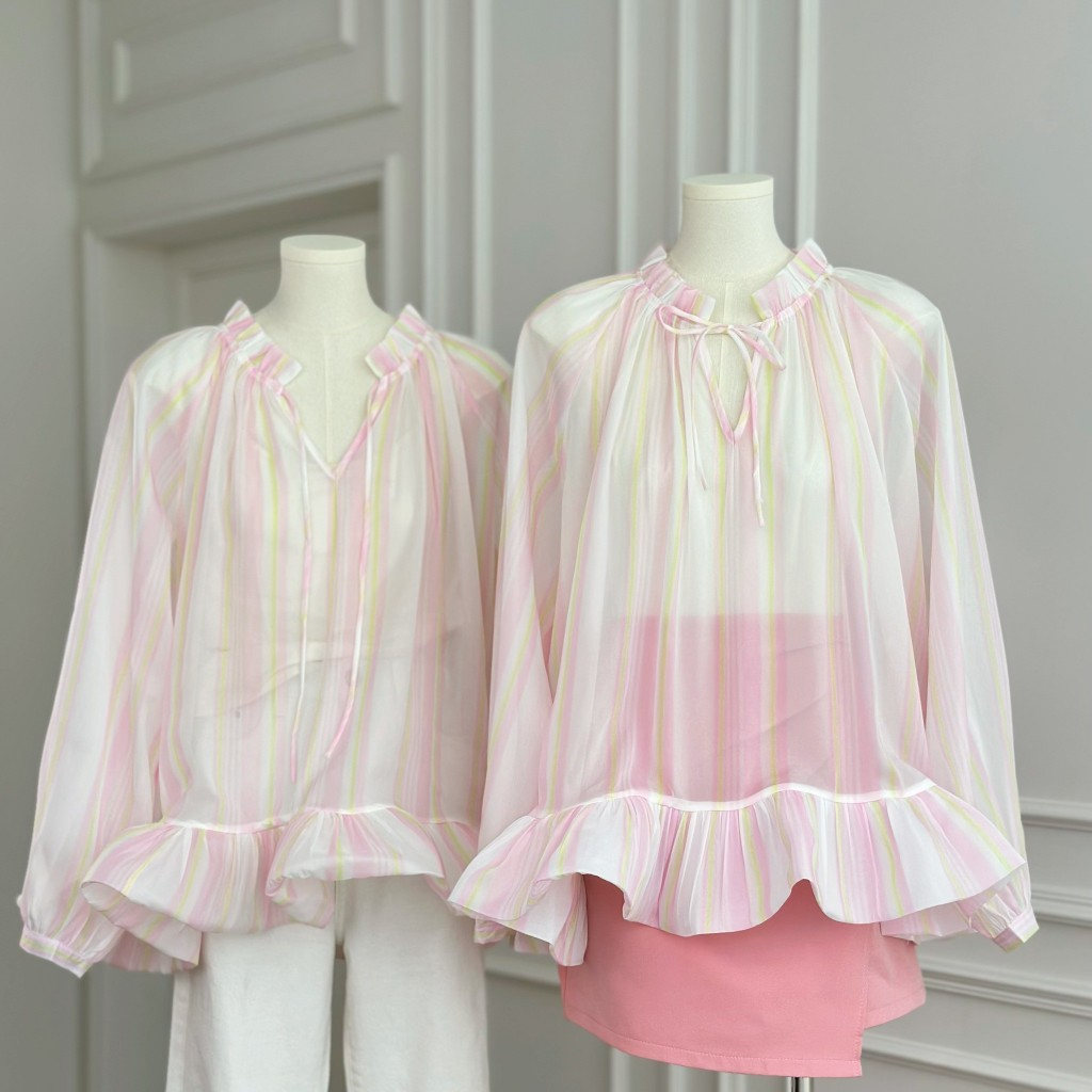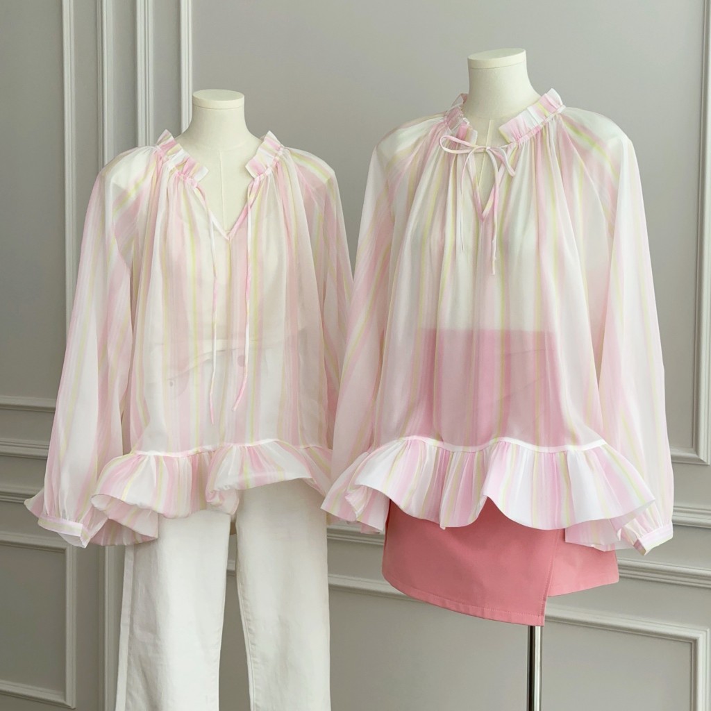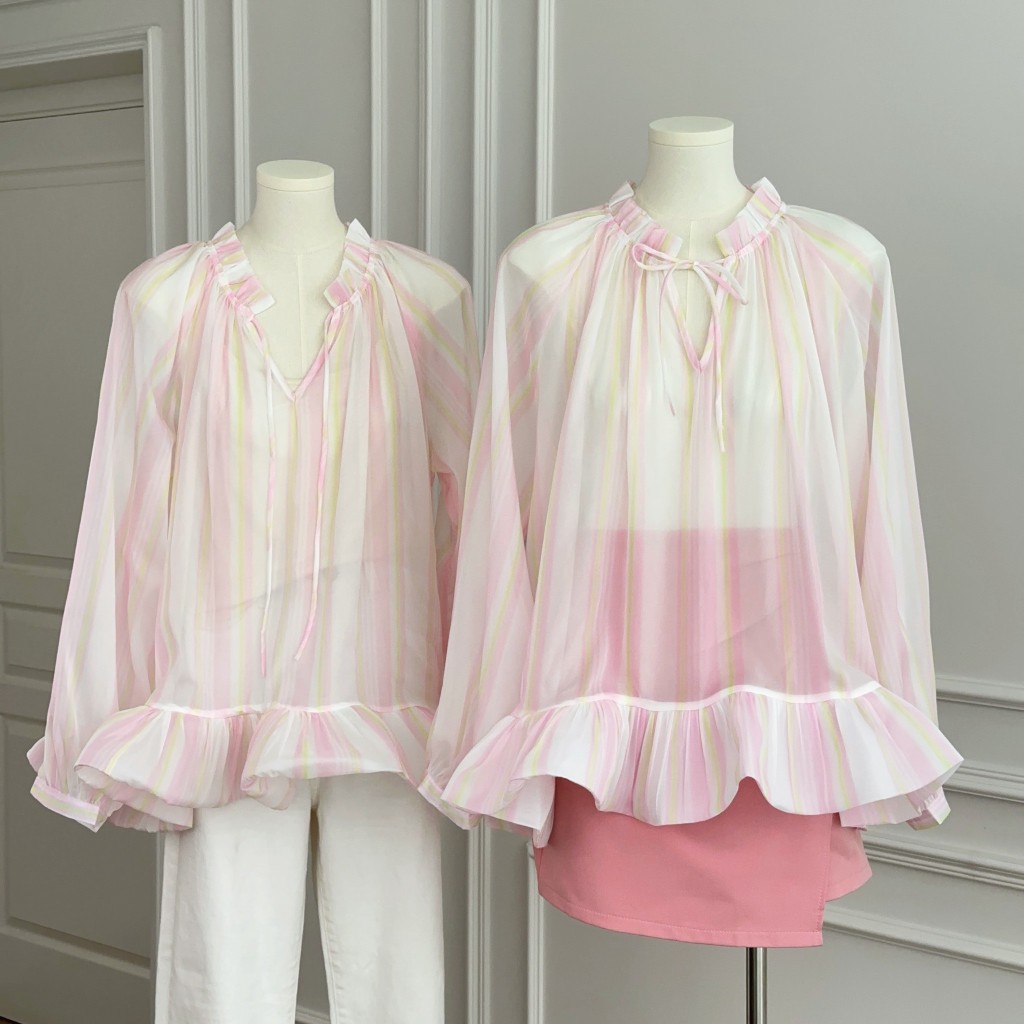 เสื้อแขนยาว ผ้าชีฟอง สีชมพูพาสเทล ทรงเสื้อคอวีลึก ดีเทลพิมพ์ลายทาง ชายเสื้อแต่งระบาย ใส่แล้วลุคสาวหวาน ดูแพง ดูไฮโซ ใส่แมทช์ได้ง่ายกับทุกลุค ใส่ไปเที่ยว ใส่ไปทำงาน ใส่ไปคาเฟ่ ออกงาน ใส่ได้ทุกโอกาส