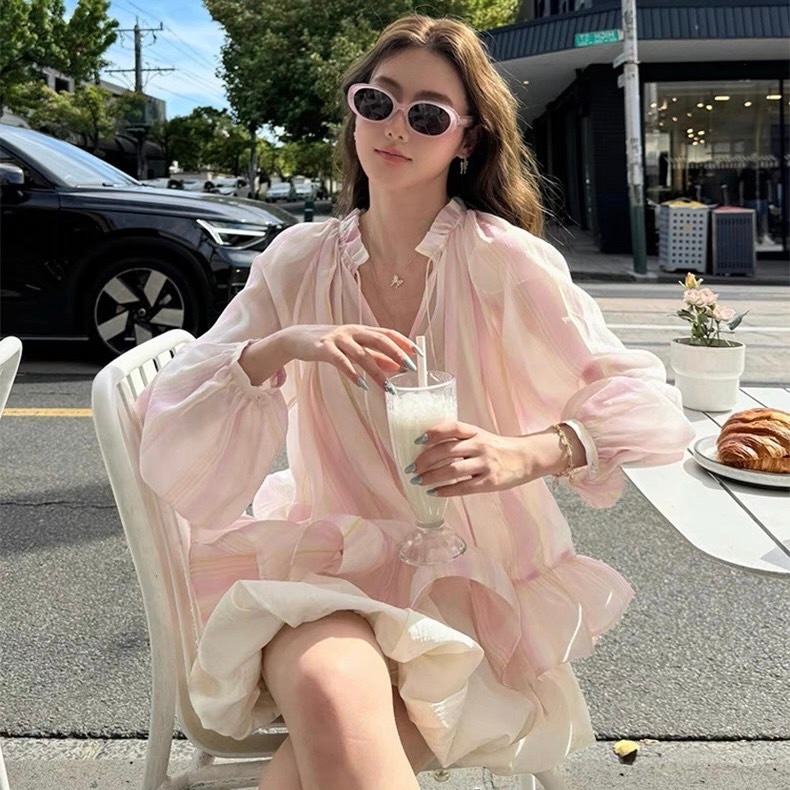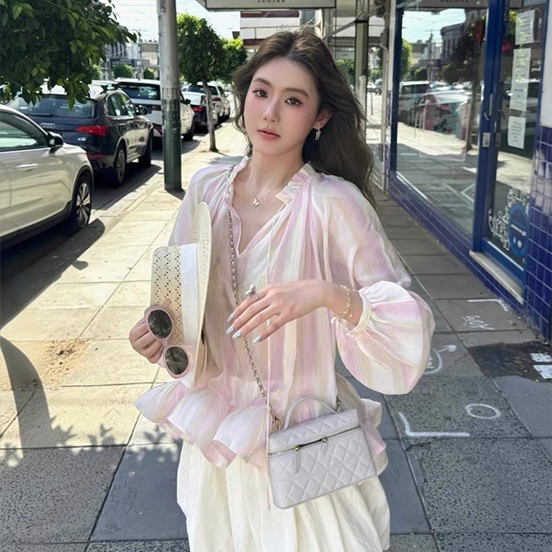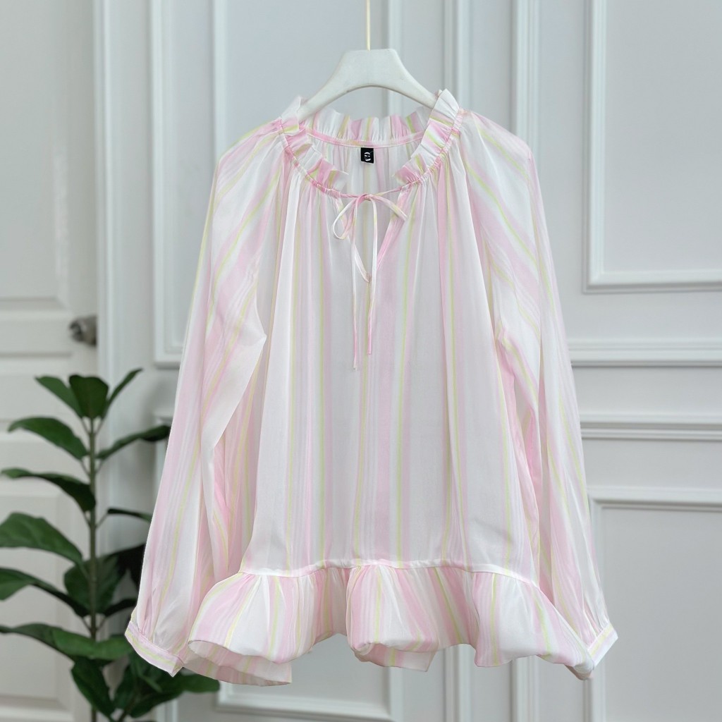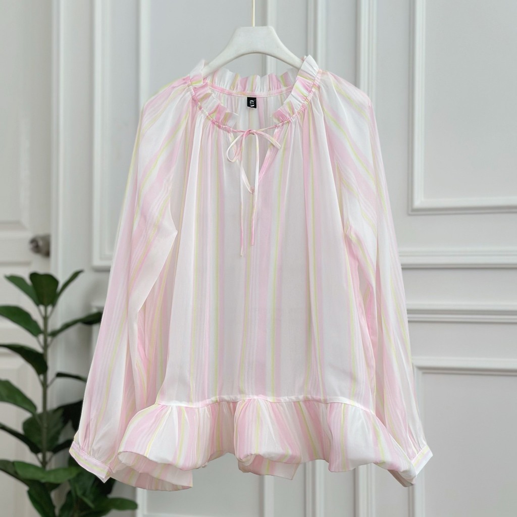 เสื้อแขนยาว ผ้าชีฟอง สีชมพูพาสเทล ทรงเสื้อคอวีลึก ดีเทลพิมพ์ลายทาง ชายเสื้อแต่งระบาย ใส่แล้วลุคสาวหวาน ดูแพง ดูไฮโซ ใส่แมทช์ได้ง่ายกับทุกลุค ใส่ไปเที่ยว ใส่ไปทำงาน ใส่ไปคาเฟ่ ออกงาน ใส่ได้ทุกโอกาส