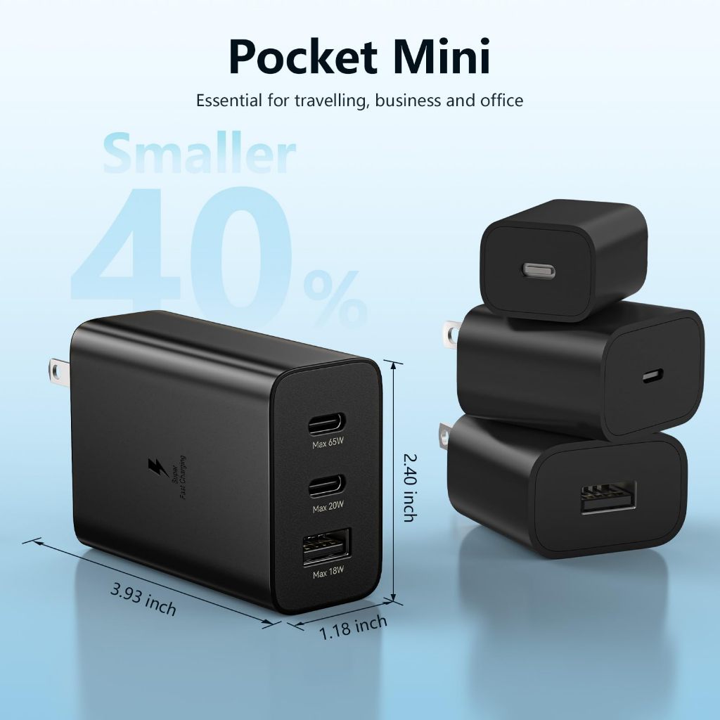 This 65W Type C charger kit supports multiple fast charging technology, Sam super fast charging PD 3.0, PPS, and QC 4.0. It provides fast charging up to 25W output, super fast chargingYou can charge your Phone to 60% in