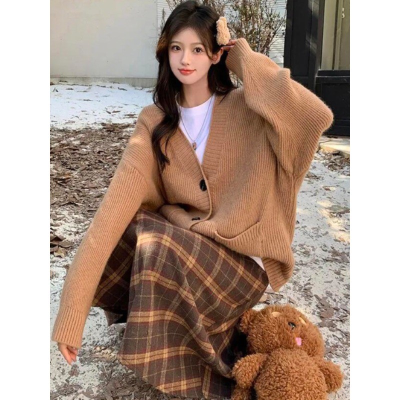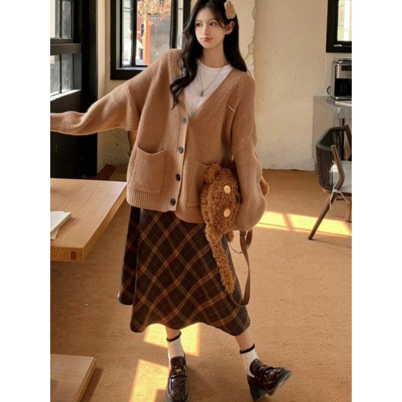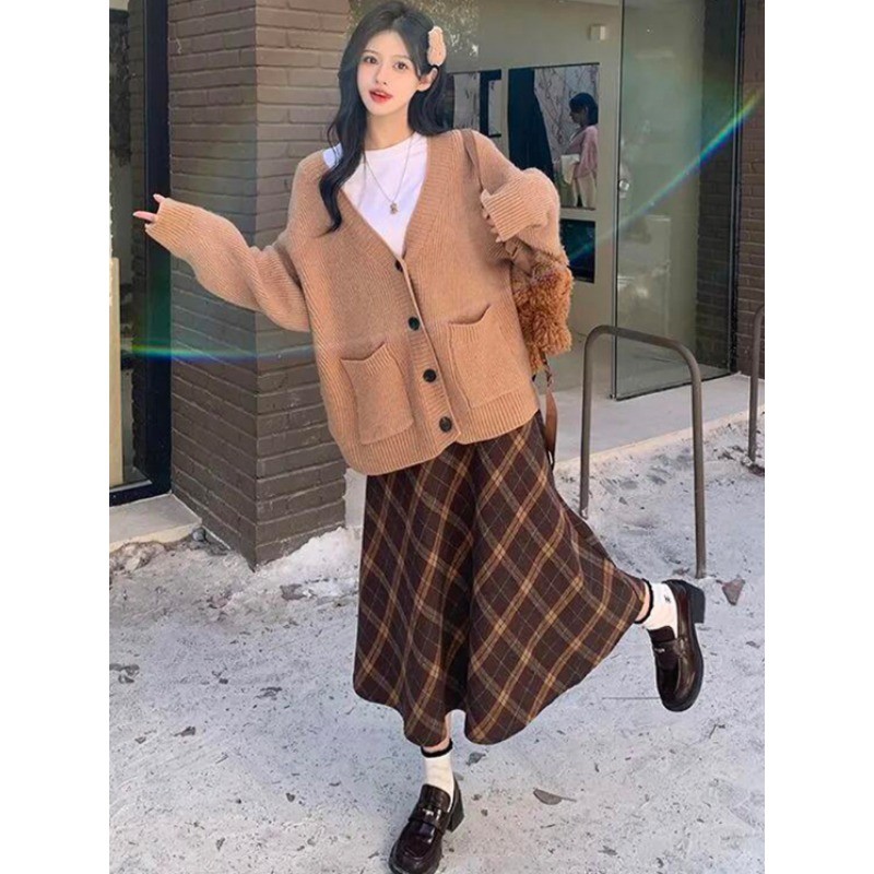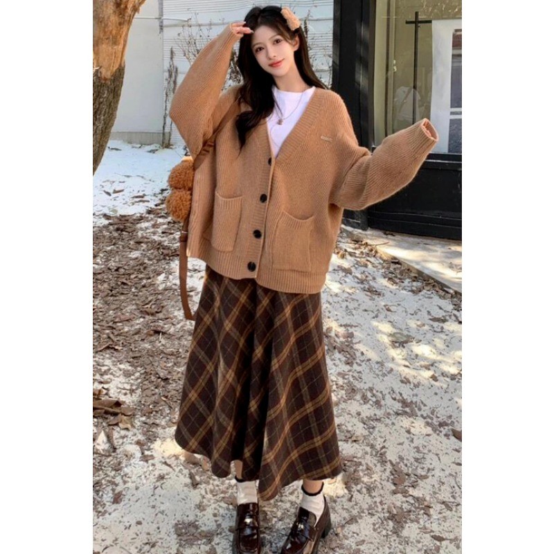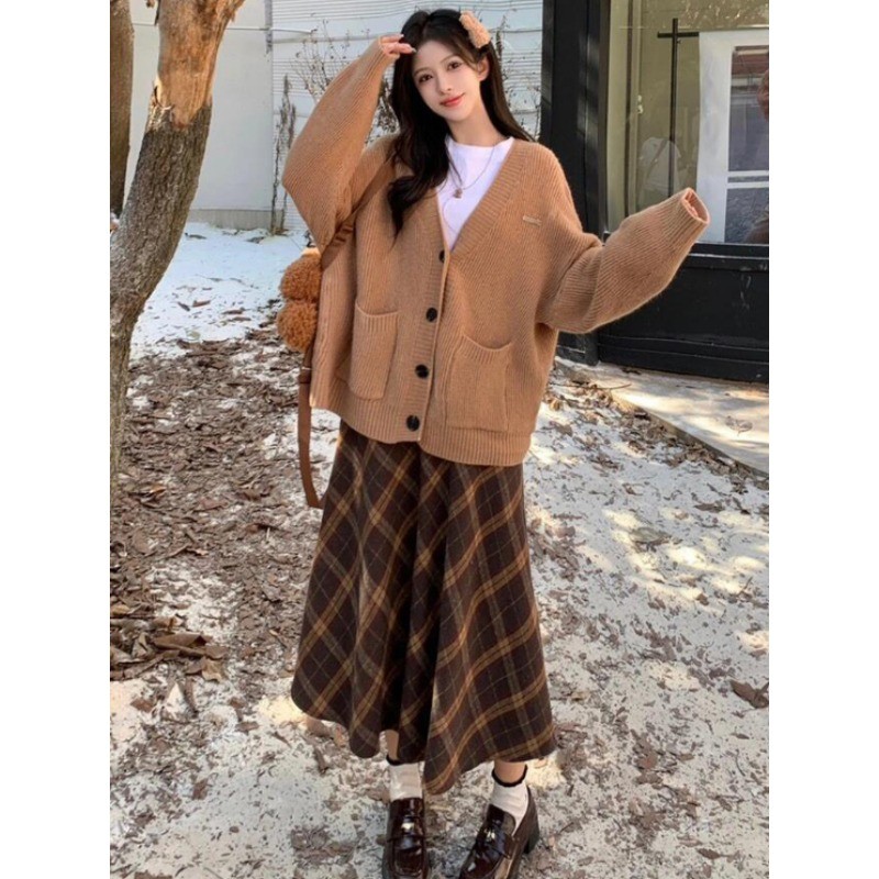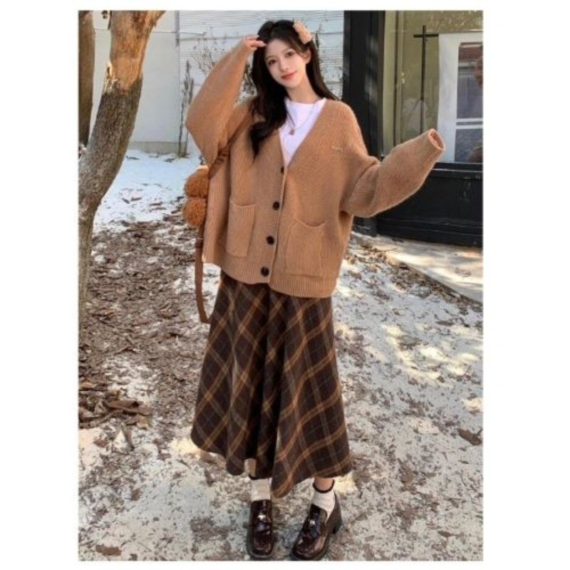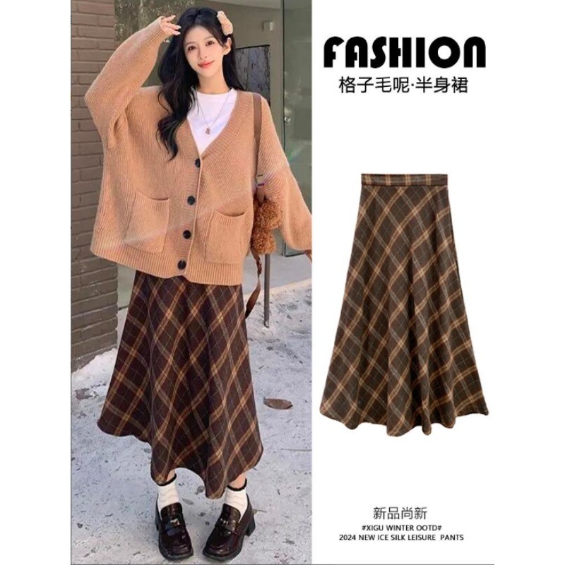 กระโปรงยาวทรงเอลายสก๊อตอเนกประสงค์ทรงหลวมทำจากผ้าขนสัตว์สำหรับผู้หญิงฤดูใบไม้ผลิและฤดูใบไม้ร่วง