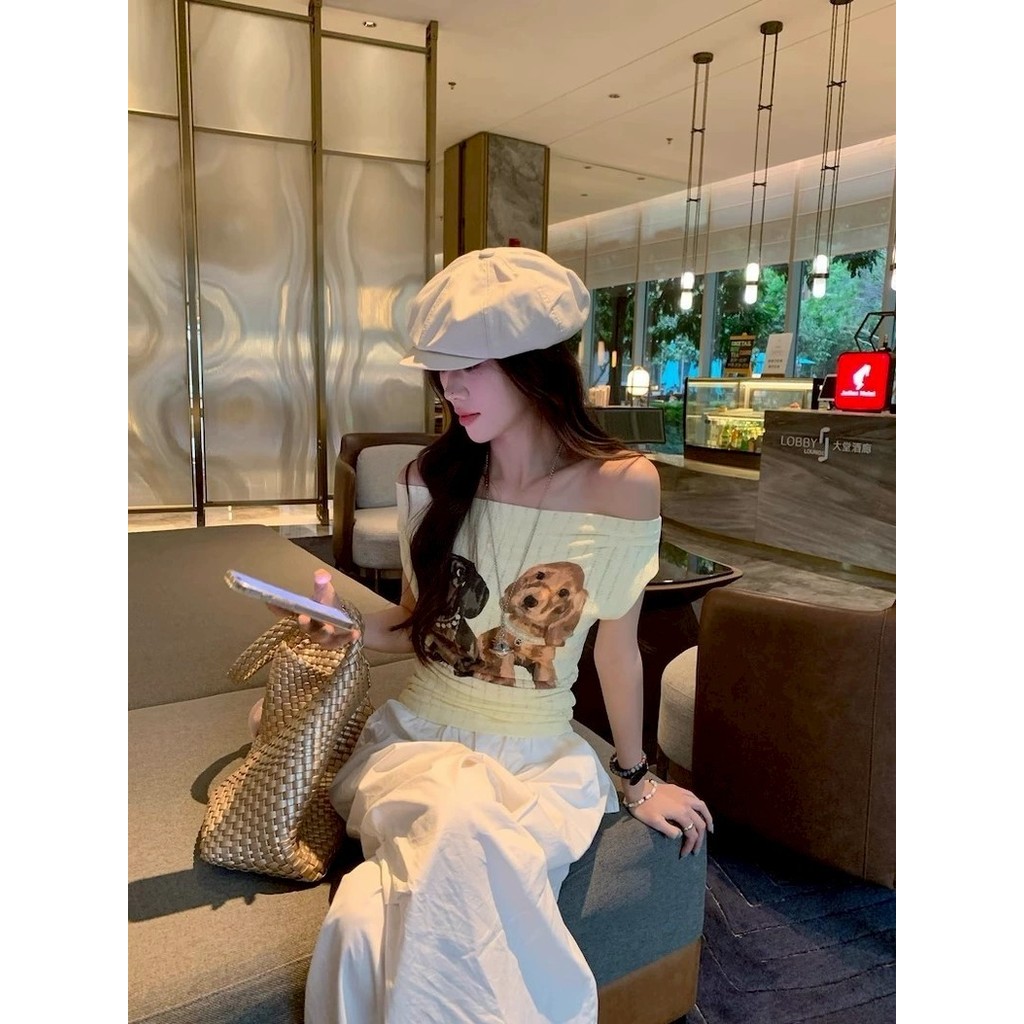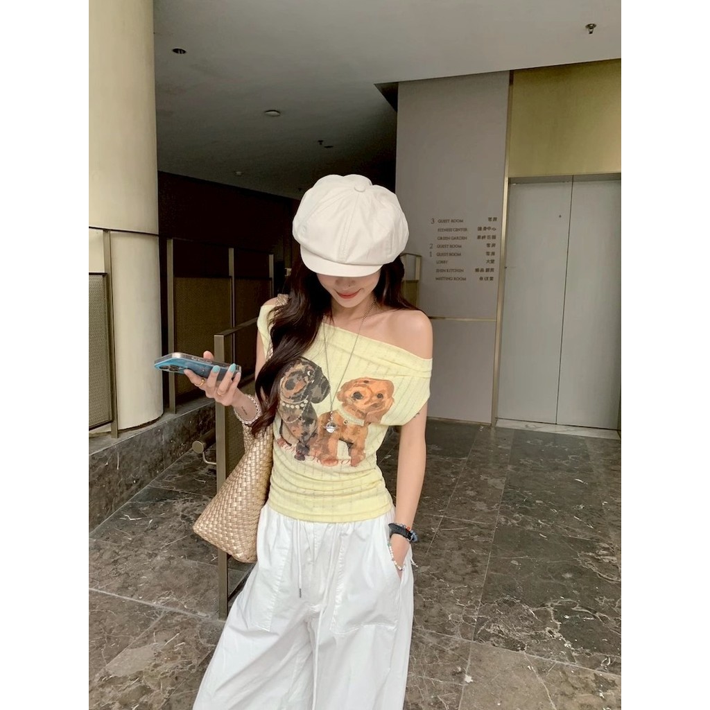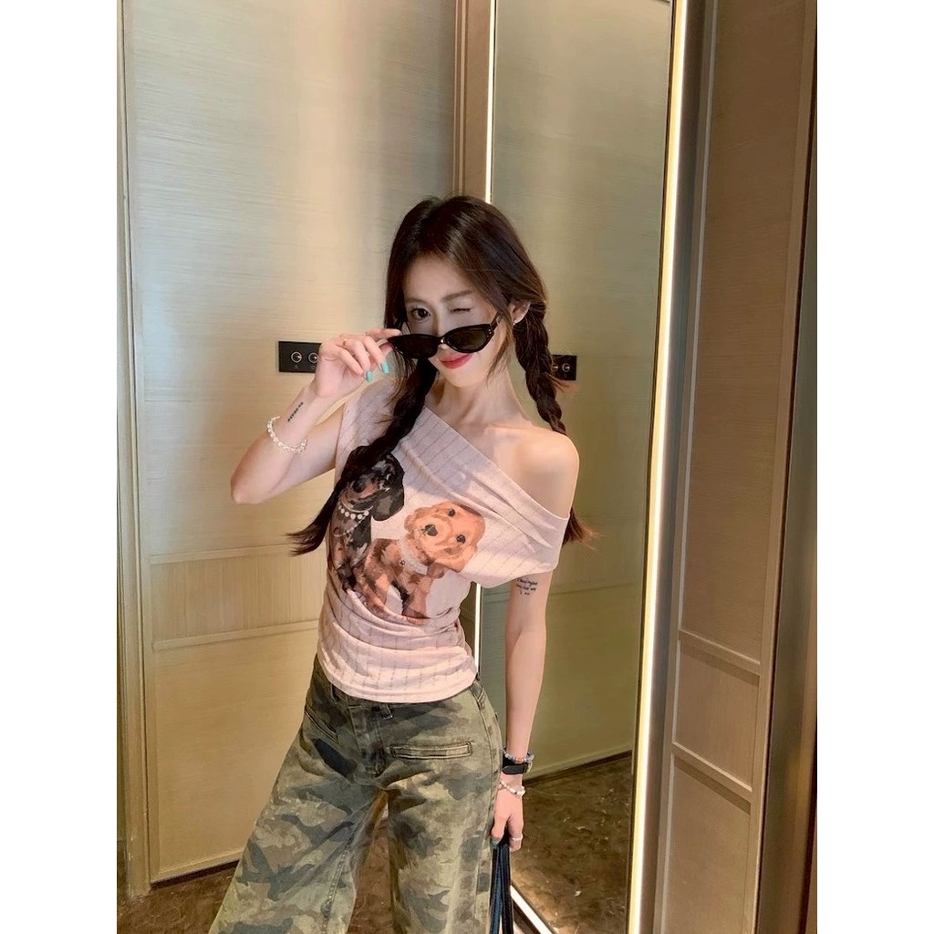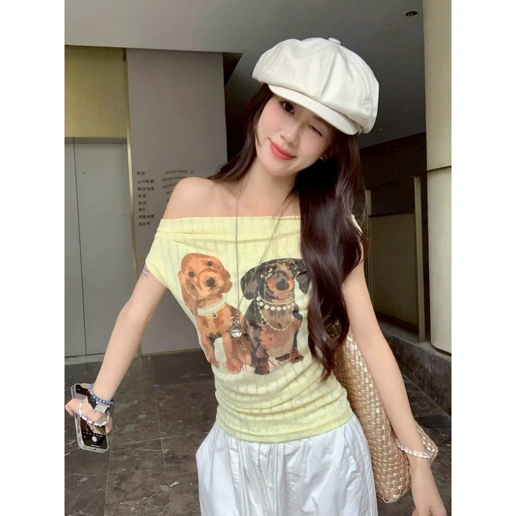 Elves พร้อม💟เสื้อไหมพรมเปิดไหล่ แขนสั้น ลายน้องหมา สีชมพูเหลืองเสื้อแฟชั่น”M1086″