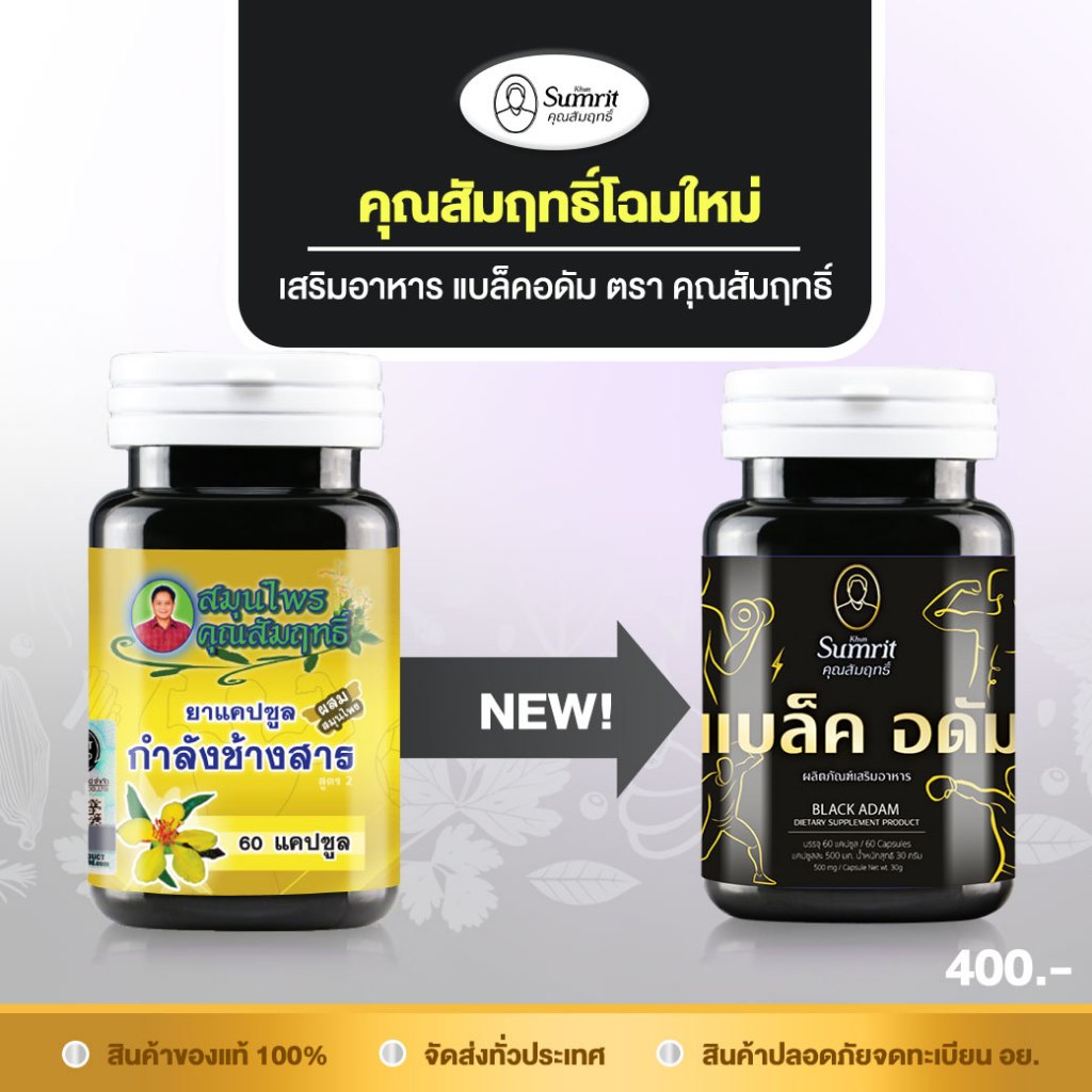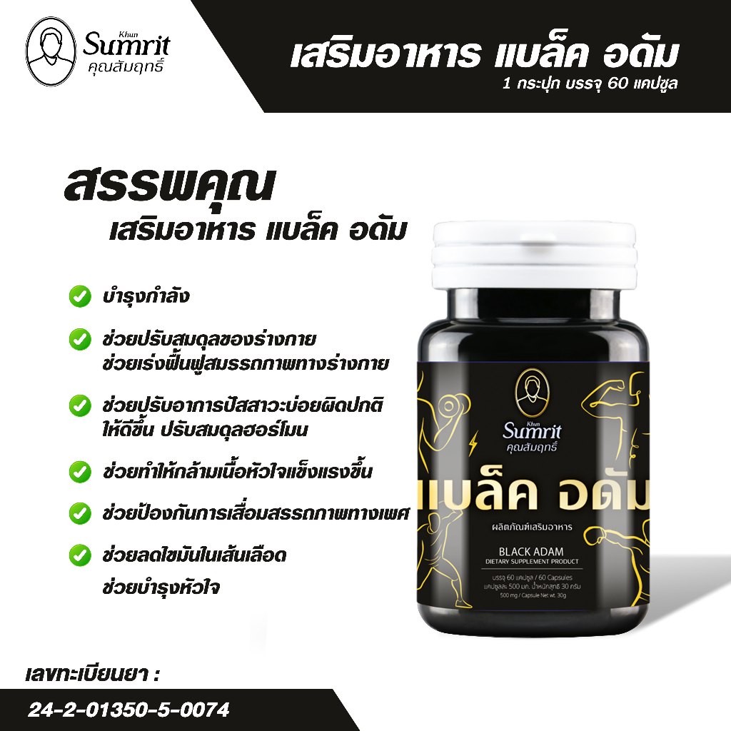 แบล็ค อดัม (สมุนไพรกำลังช้างสาร) ตราคุณสัมฤทธิ์ ลดอากการปวดเมื่อยร่างกาย บำรุงฮอร์โมนเพศชาย ช่วยให้ร่างกายกระปี้กระเปร่า ลดกลิ่นเหงื่อกลิ่นตัว เสริมสร้างกล้ามเนื้อ