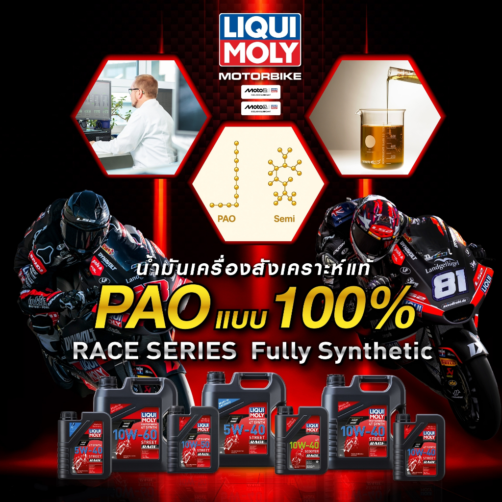 LIQUI MOLY Race Series น้ำมันเครื่องสังเคราะห์ 100% ตัวท็อปสุดของ Liqui Moly ผลิตจากน้ำมันพื้นฐาน Base Oil Group 4 ไม่มีส่วนผสมของ Base Oil Group 3 ผลิตและน้ำเข้าจากประเทศเยอรมัน 100%